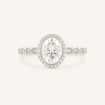 The Claire Oval Diamond Halo Vintage-Style Engagement Ring exudes timeless elegance with vintage charm. An oval center diamond is framed by a delicate halo and enhanced with intricate milgrain detailing along the band, adding texture and sophistication. Refined and romantic, this heirloom-inspired piece is designed to make a lasting impression.