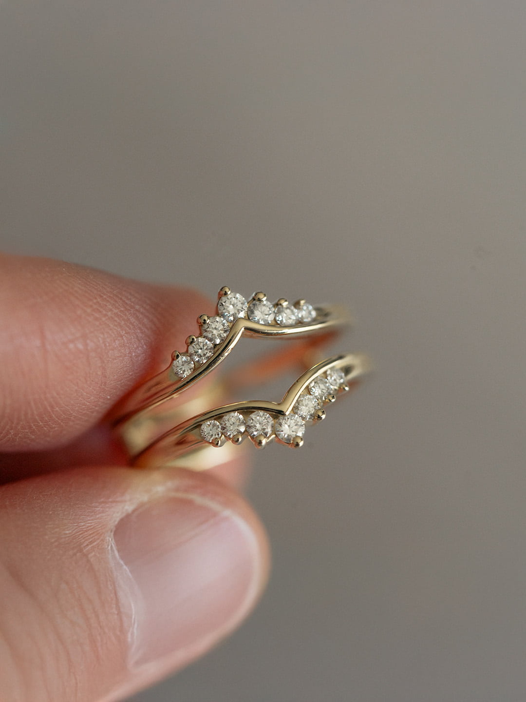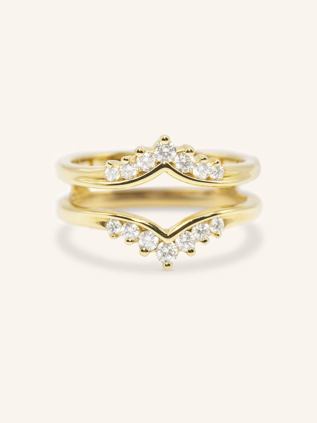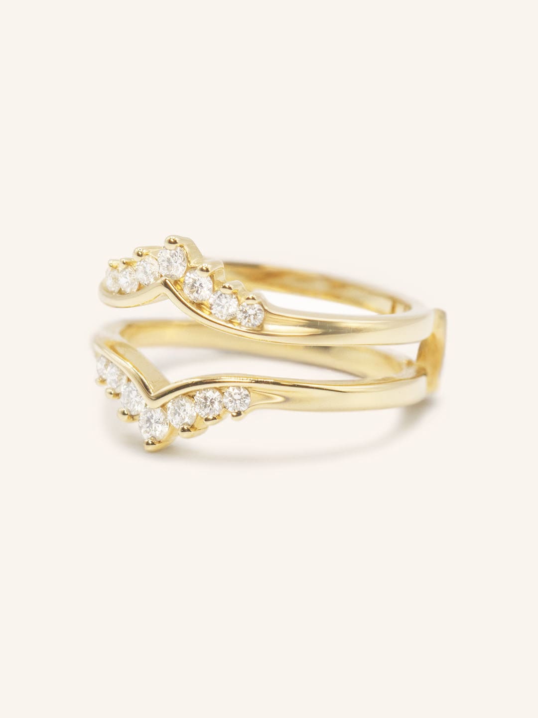 The Granby Double Band Diamond Ring Guard features a sleek V-shaped design with two shimmering 14k gold bands, each lined with sparkling diamonds. Designed to frame your engagement ring with elegance, this guard adds both brilliance and a contemporary touch to your jewelry. The Granby ring guard is perfect for enhancing your solitaire with a bold yet sophisticated look, making it an ideal choice for those seeking added sparkle and style.