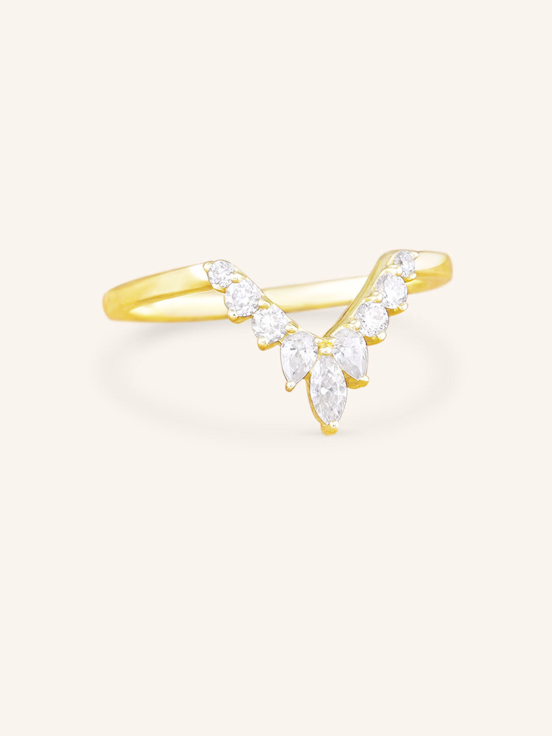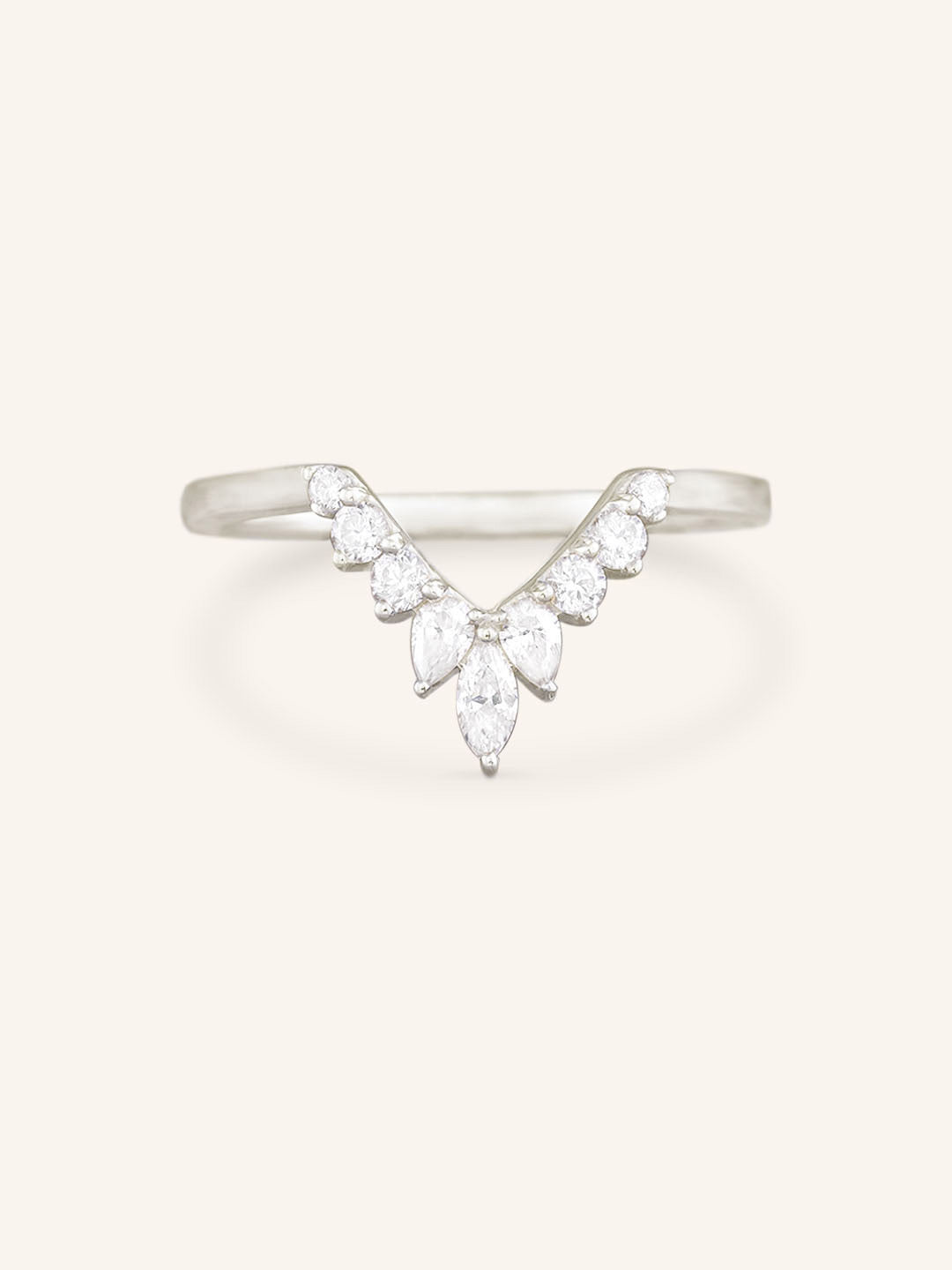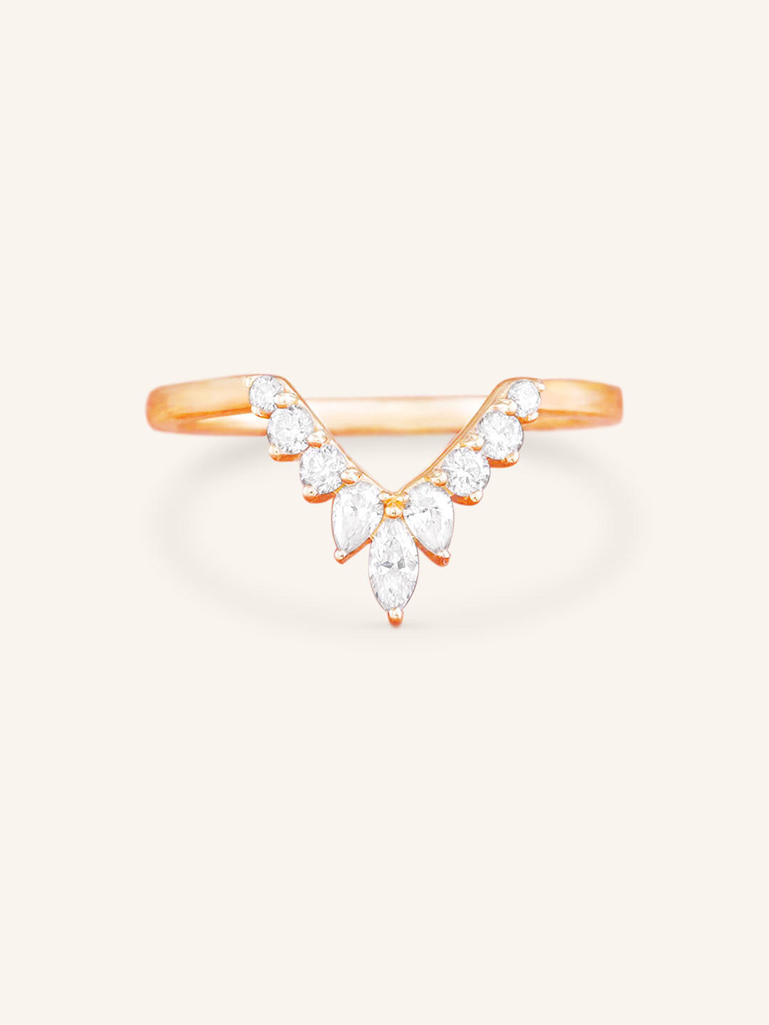 The Joni Marquise Diamond V Wedding Ring showcases a striking V-shaped band adorned with multiple marquise diamonds, creating a captivating, elongated look. The design’s sharp angles and radiant diamonds come together to form a unique and modern wedding band. This sophisticated piece is perfect for those seeking a contemporary yet timeless ring to symbolize their love and commitment.