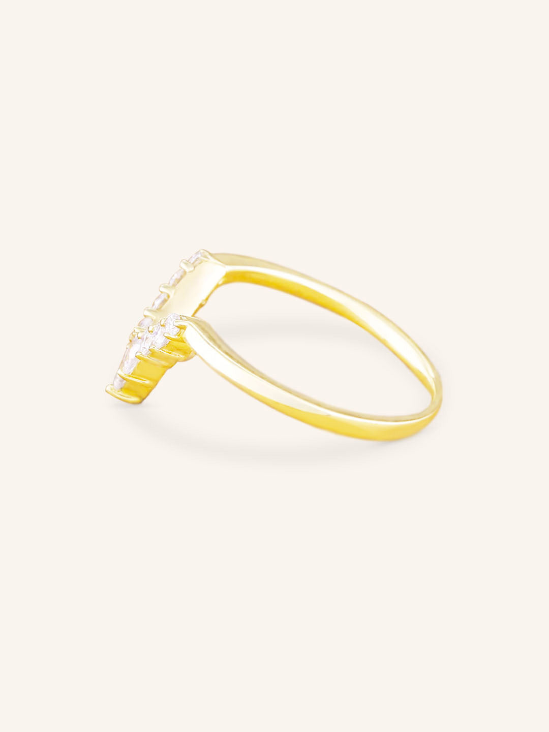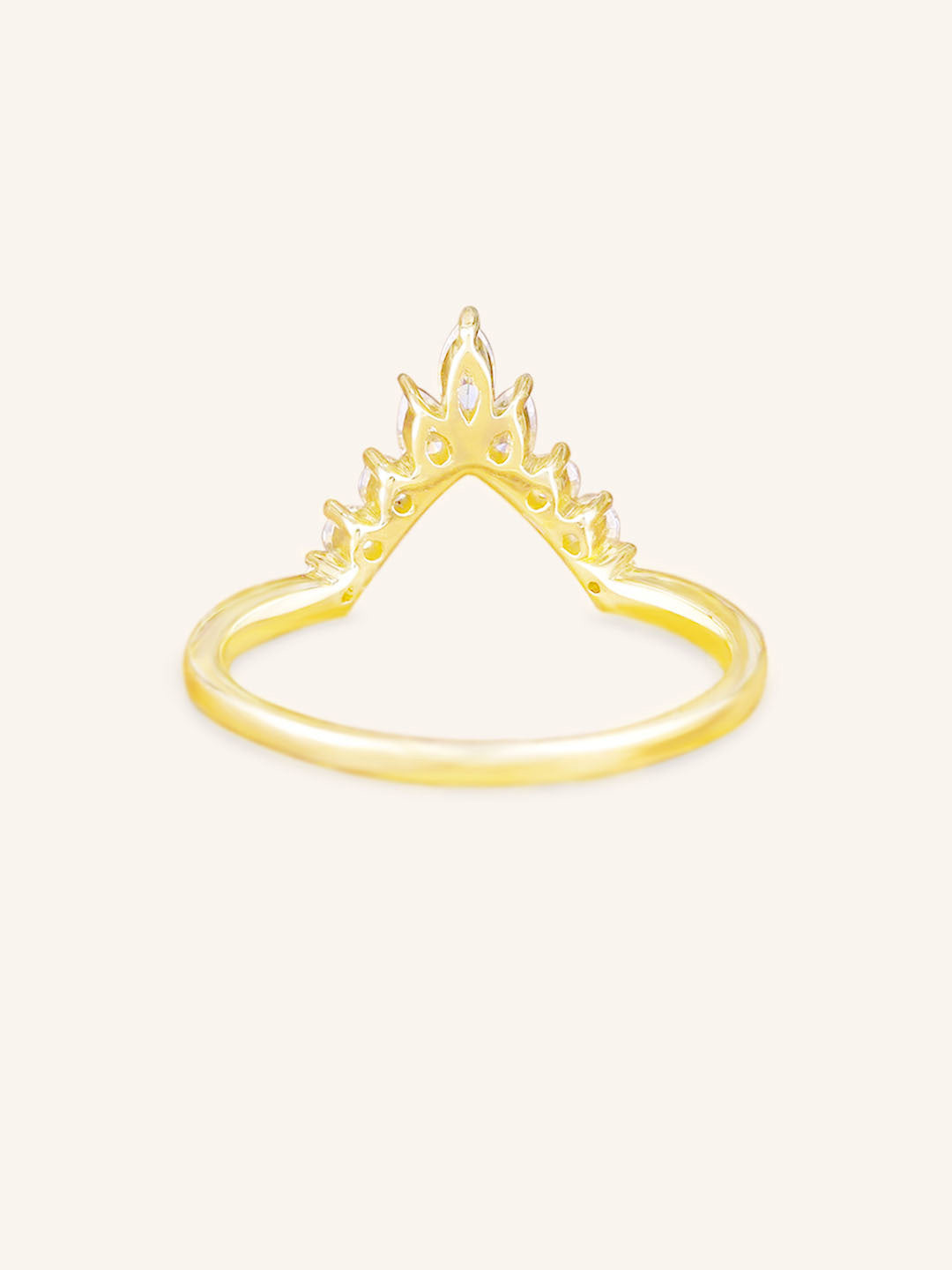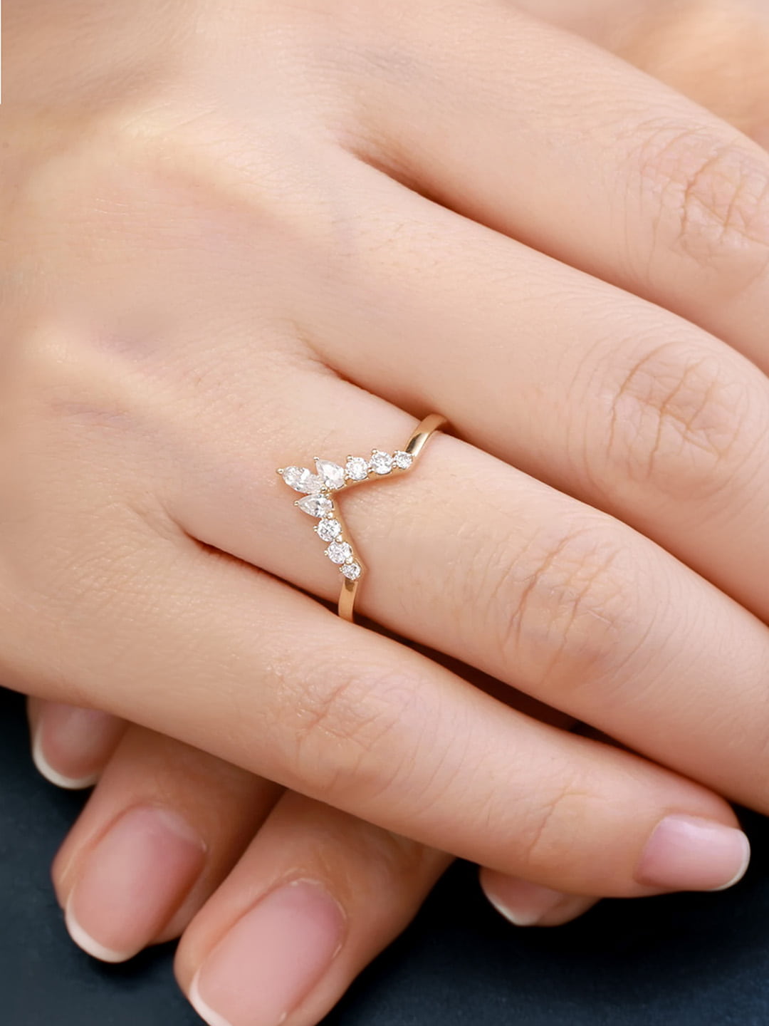 The Joni Marquise Diamond V Wedding Ring showcases a striking V-shaped band adorned with multiple marquise diamonds, creating a captivating, elongated look. The design’s sharp angles and radiant diamonds come together to form a unique and modern wedding band. This sophisticated piece is perfect for those seeking a contemporary yet timeless ring to symbolize their love and commitment.