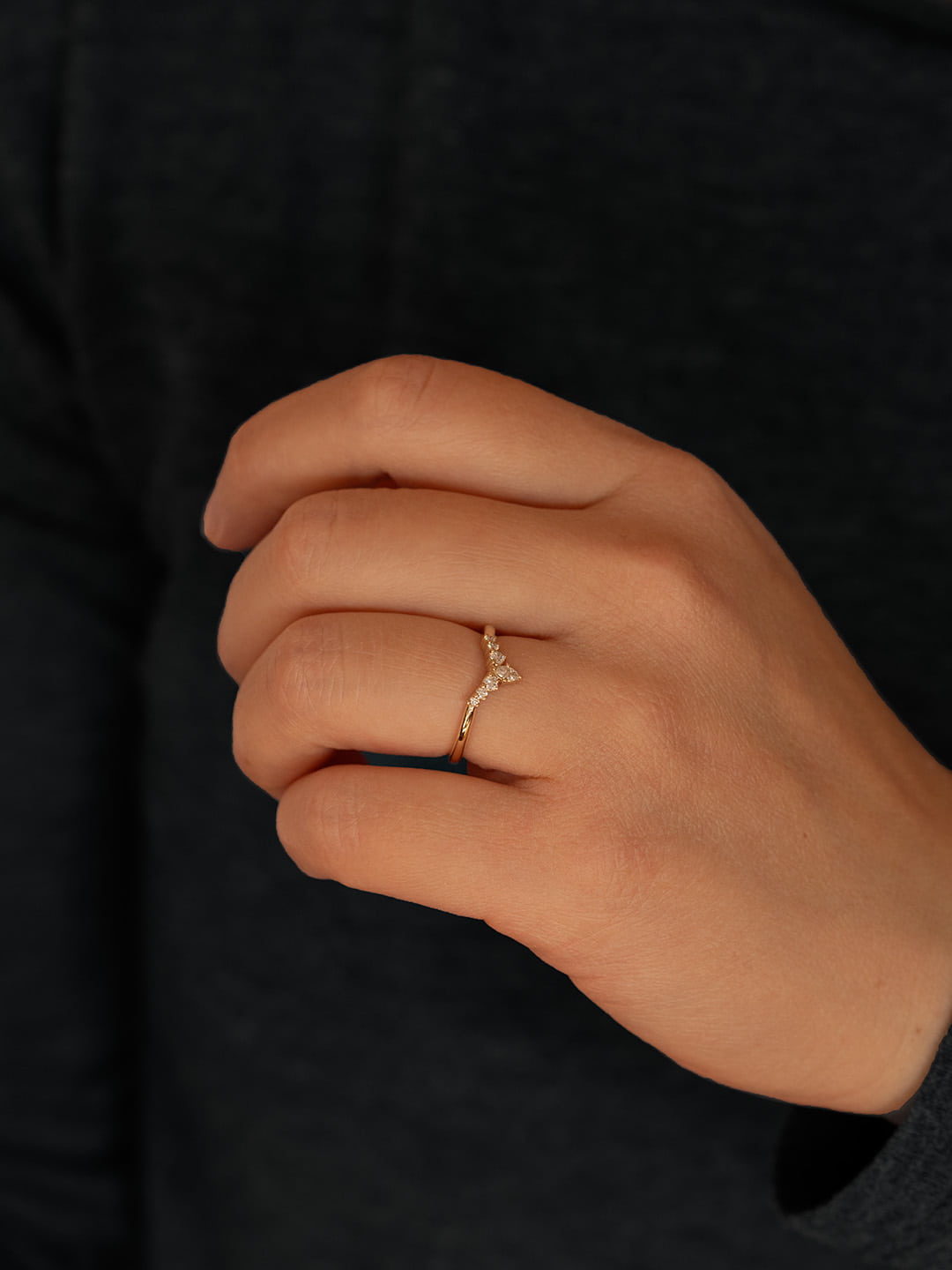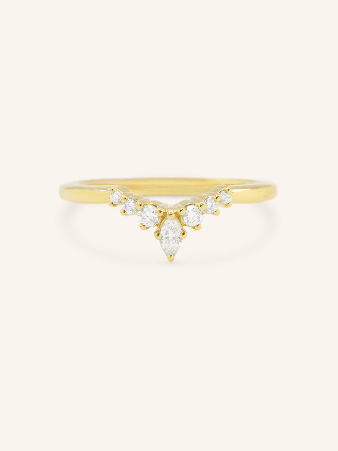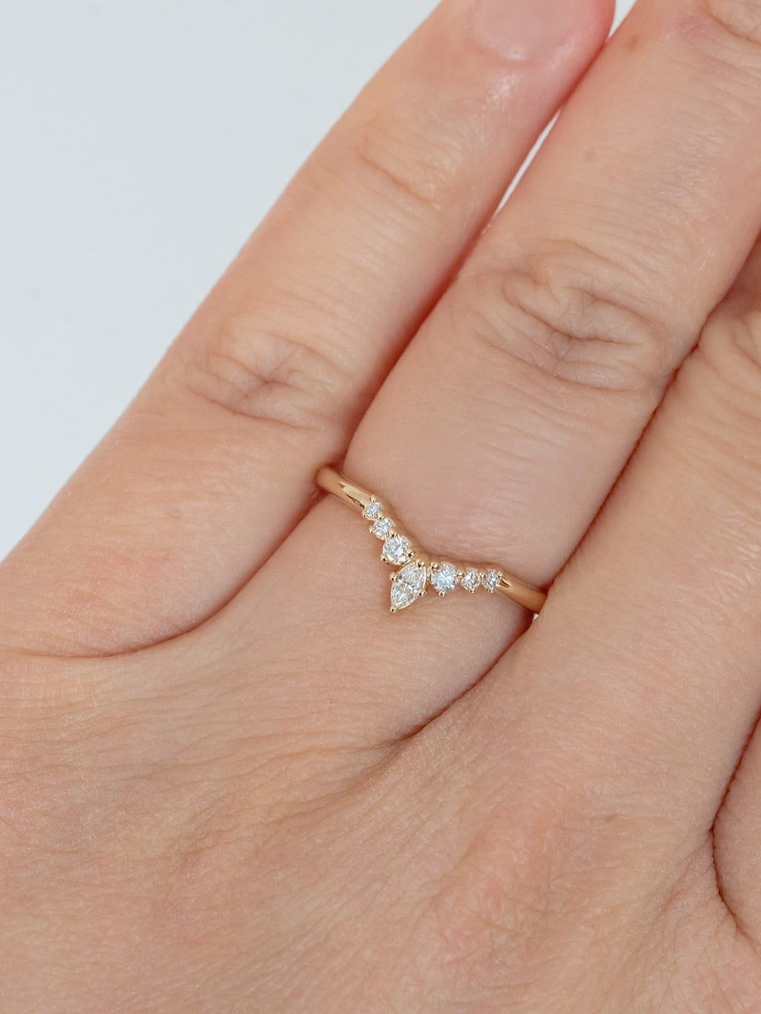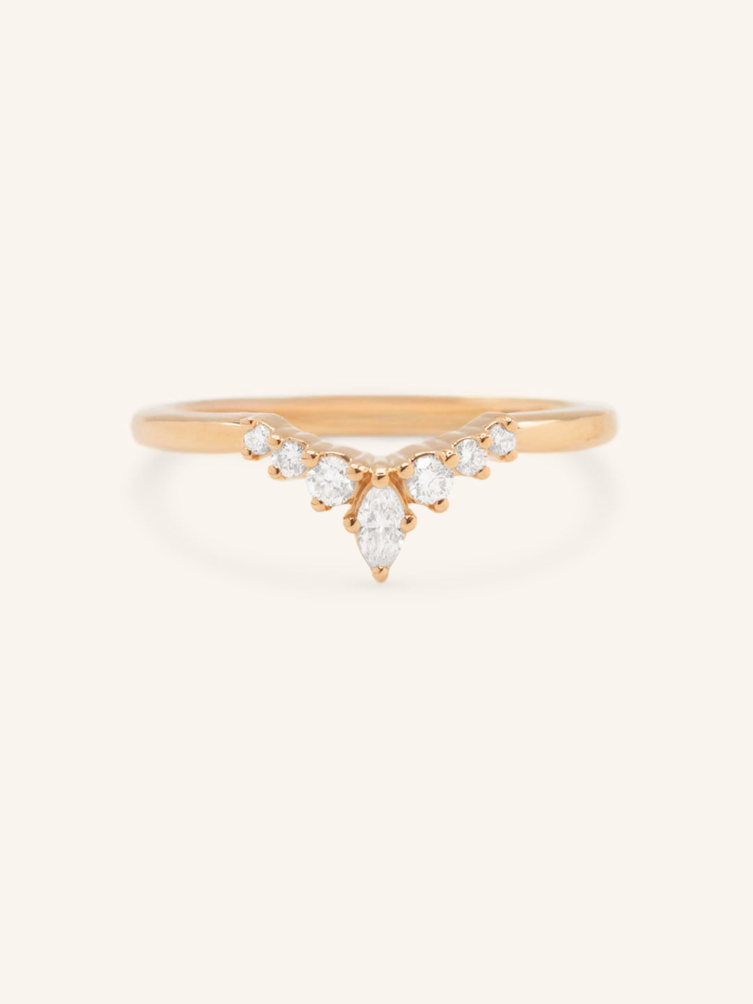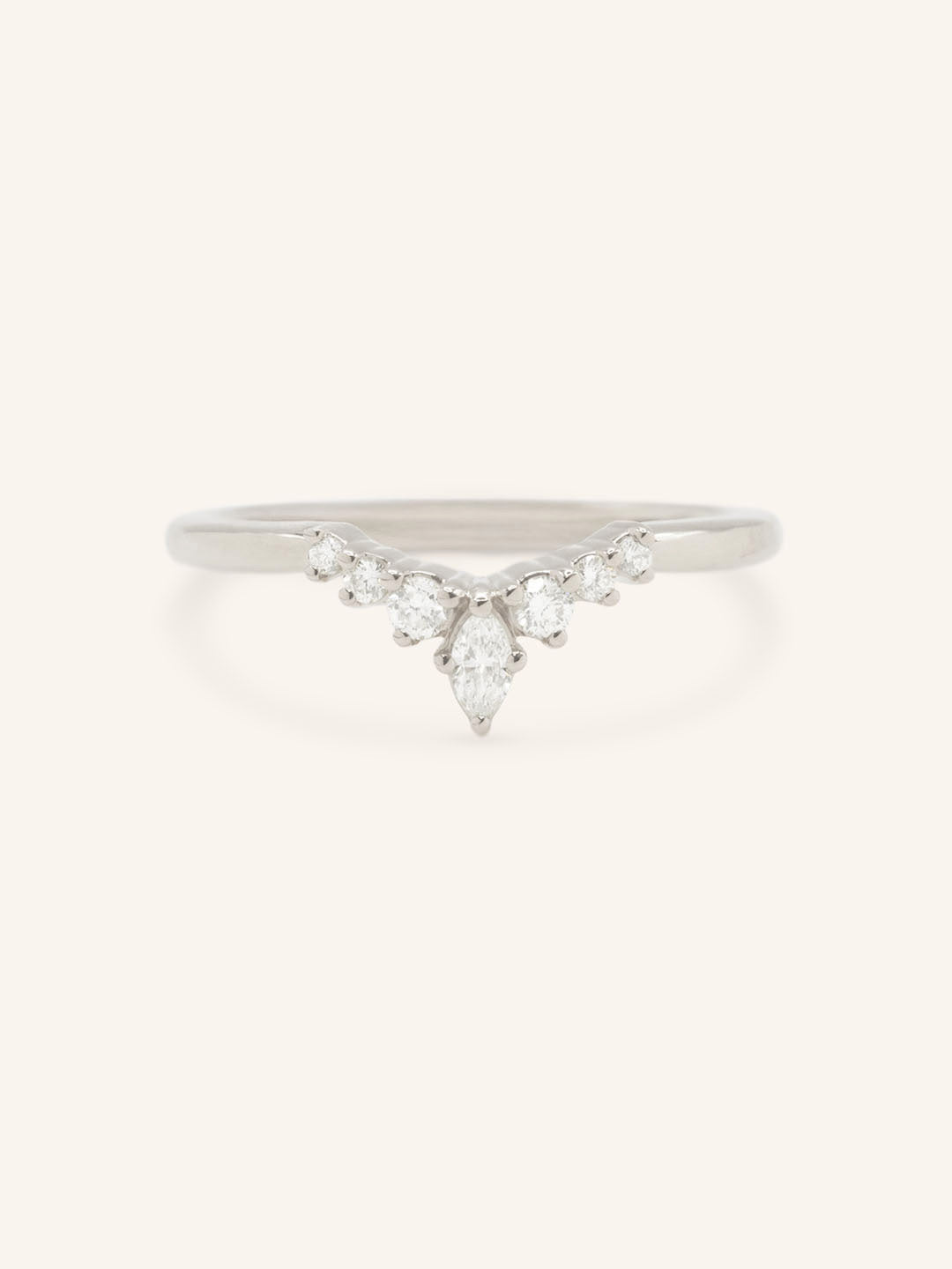 The Kessel Curved Diamond Wedding Band is a captivating design that perfectly balances elegance and charm. A marquise diamond is showcased at the center, complemented by sparkling round diamonds on either side. This curved band creates a graceful silhouette that pairs beautifully with an engagement ring or stands out on its own. A timeless piece for marking your journey together.