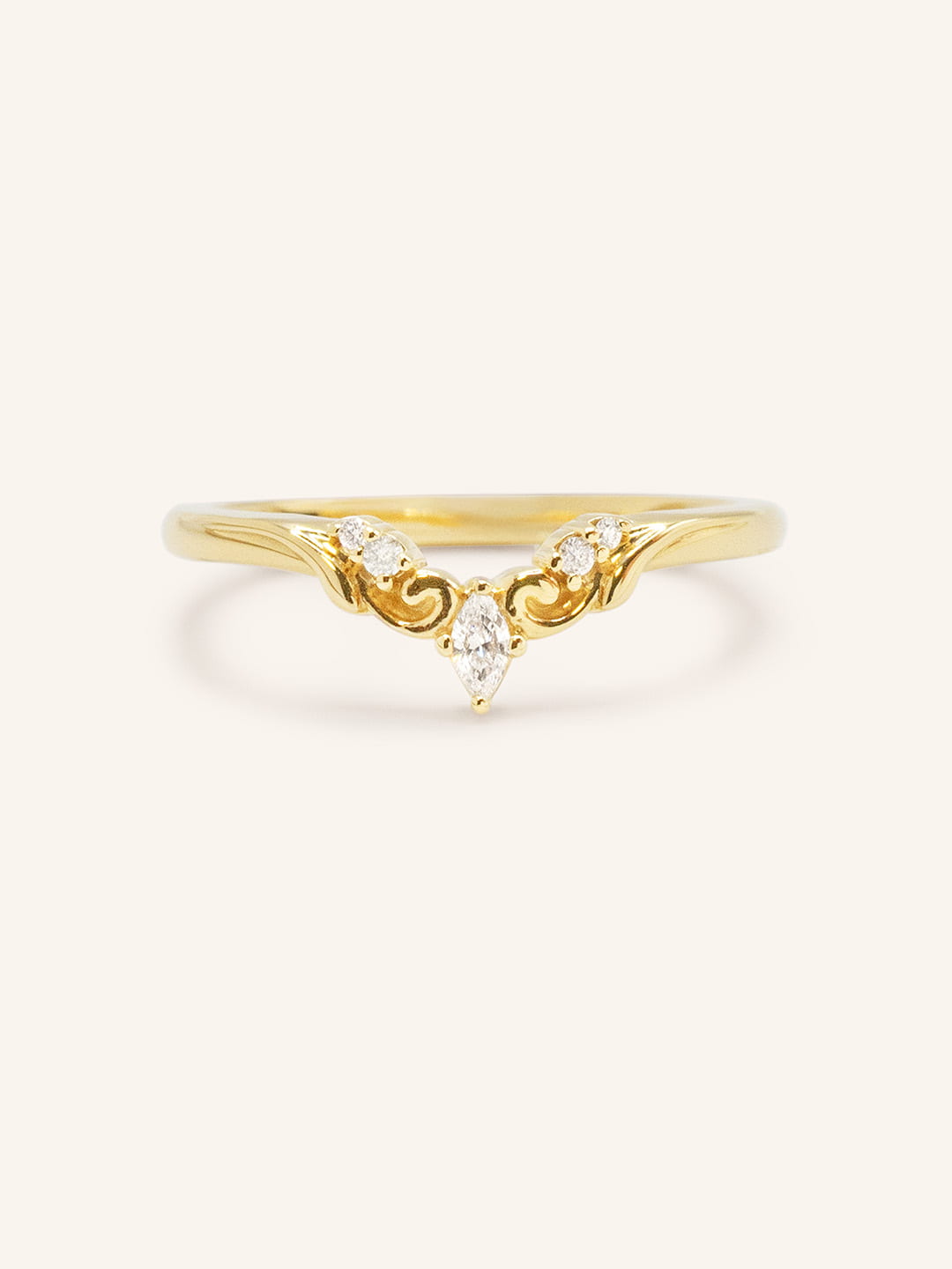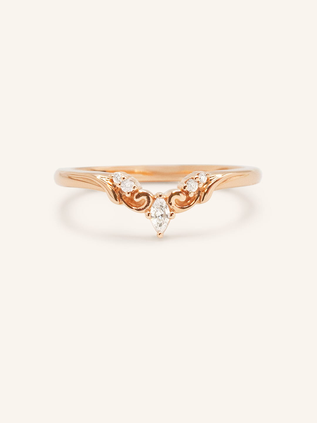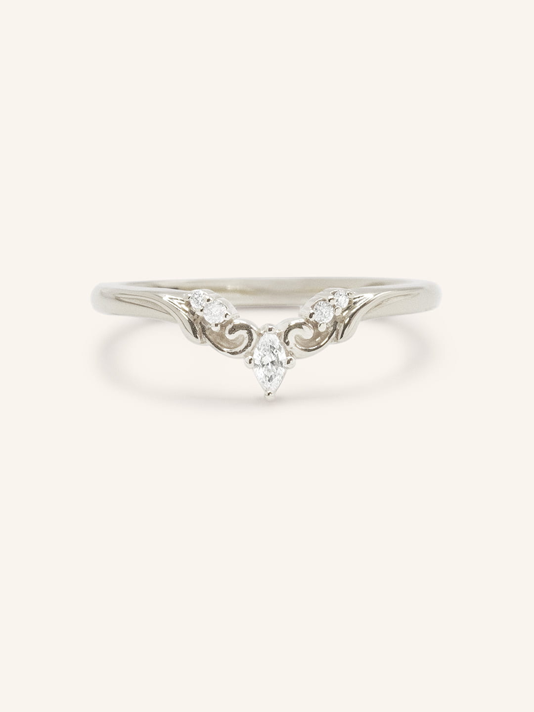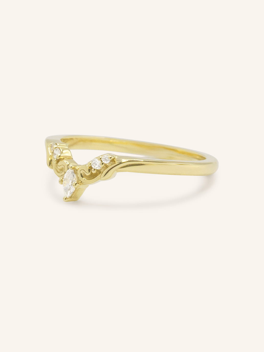 The Laila Contour Diamond Wedding Band blends vintage charm with timeless elegance. Designed with a graceful curve to complement an engagement ring, this band features delicate diamond accents that add a touch of brilliance. Intricate detailing enhances its antique-inspired aesthetic, making it a perfect choice for those who appreciate classic romance with a hint of nostalgia.