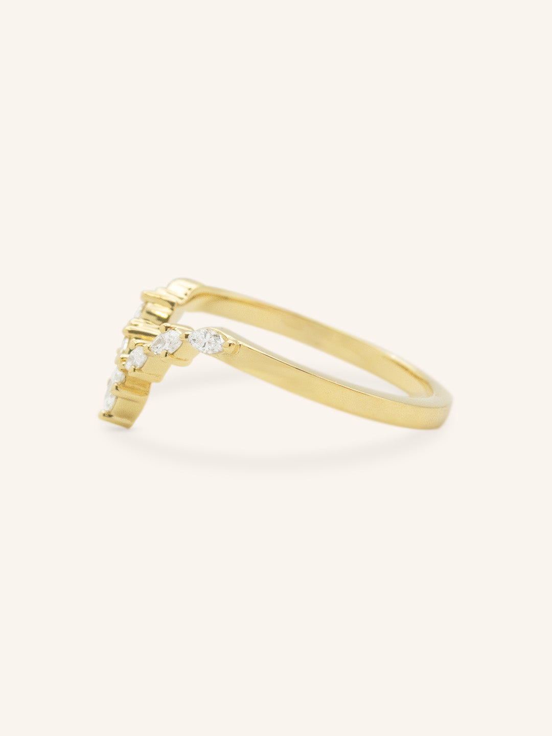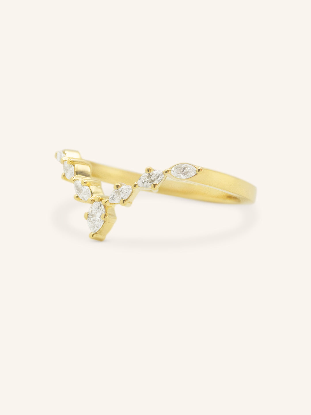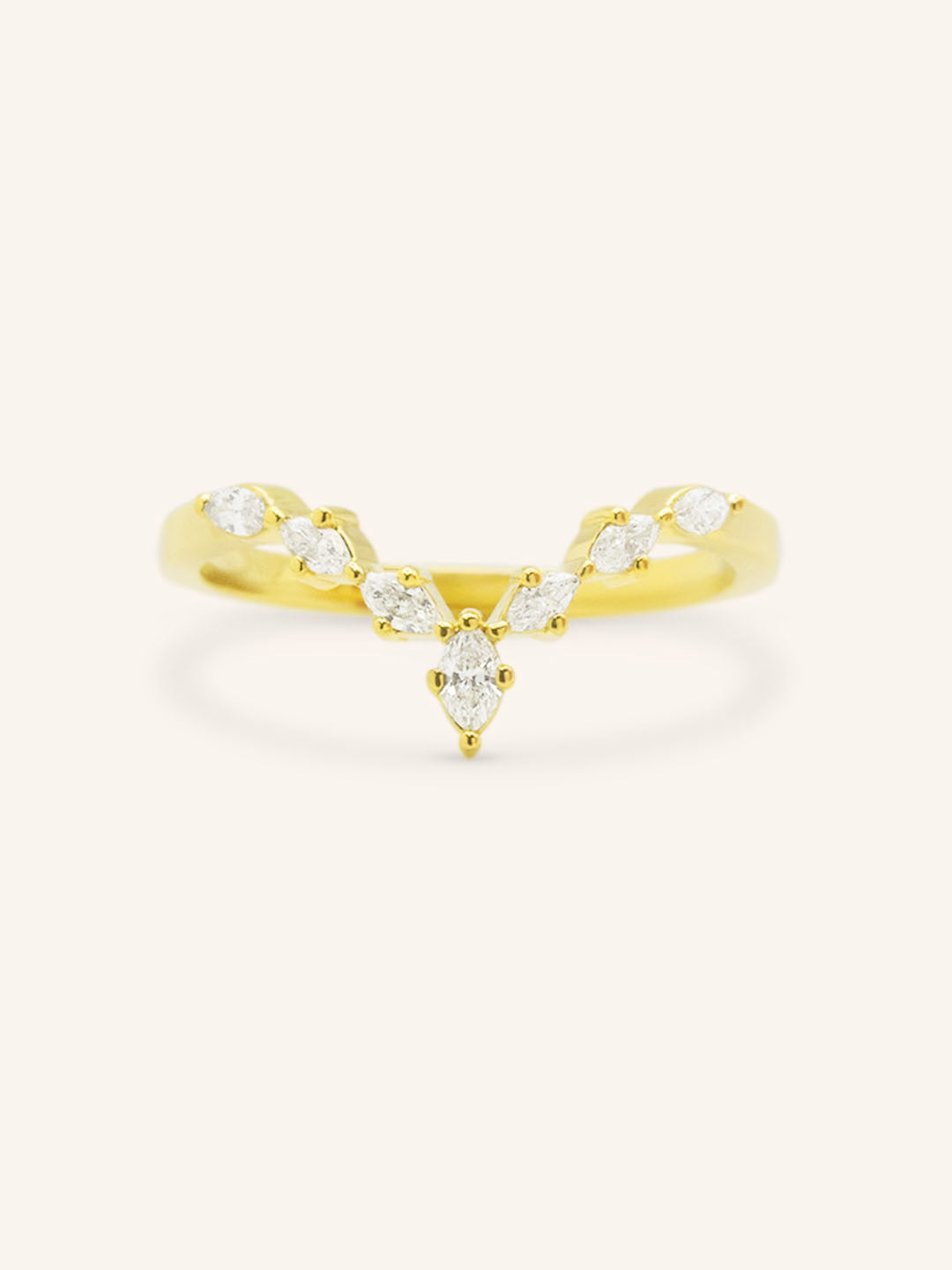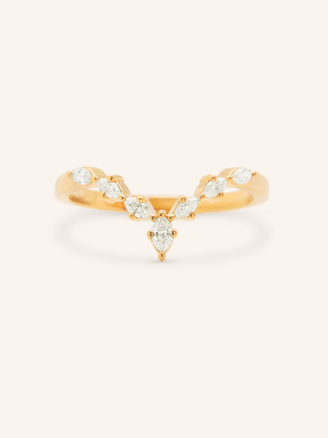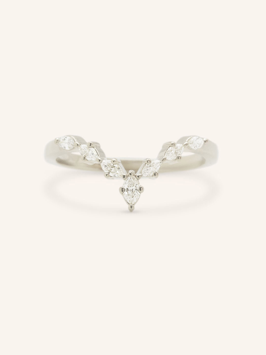The Layla Band is a graceful contour wedding band featuring a row of all marquise-cut diamonds, offering a distinctive silhouette and elegant sparkle. Designed to curve naturally around your engagement ring, this band blends modern sophistication with a unique shape, perfect for stacking or wearing on its own.
