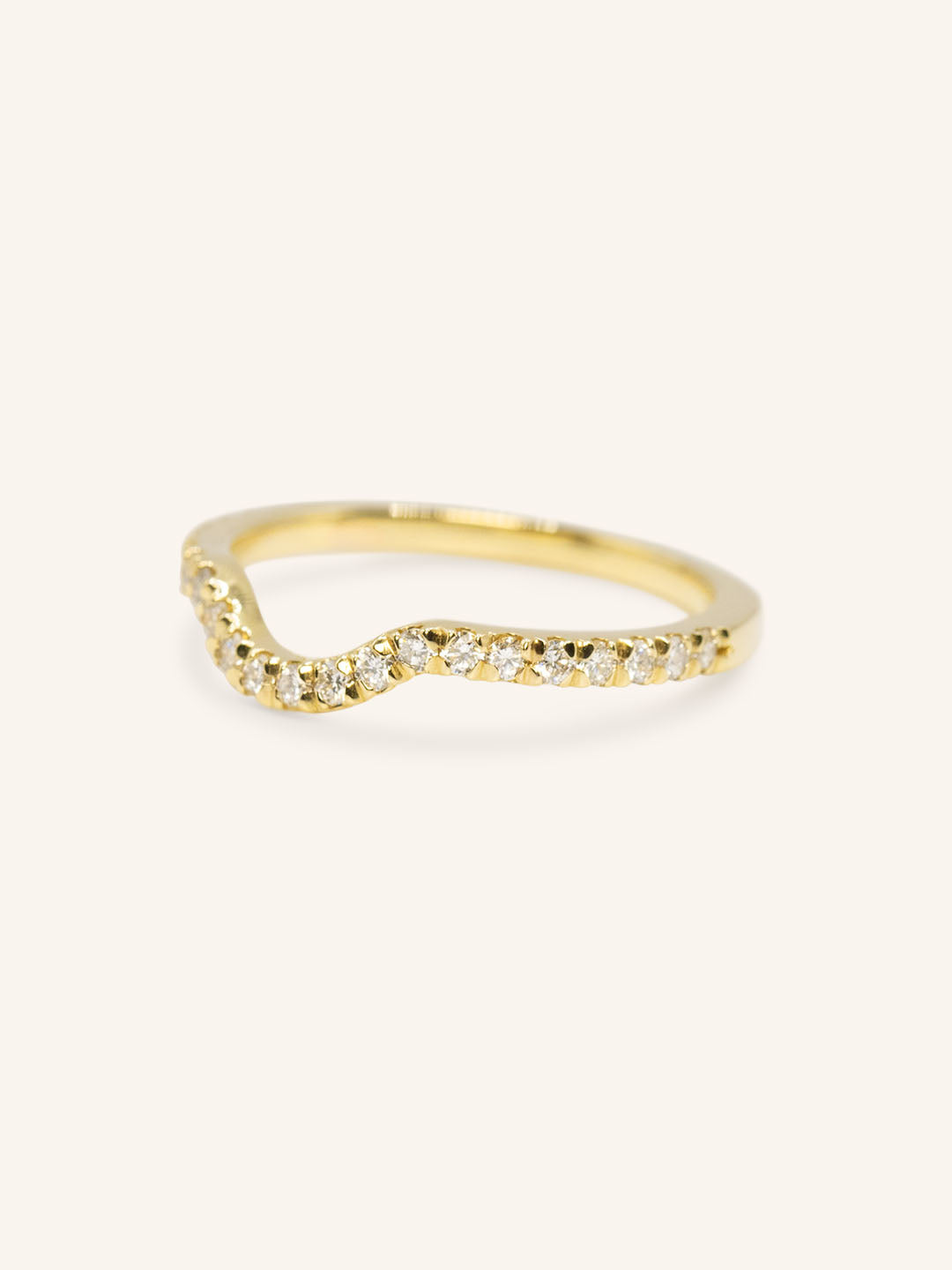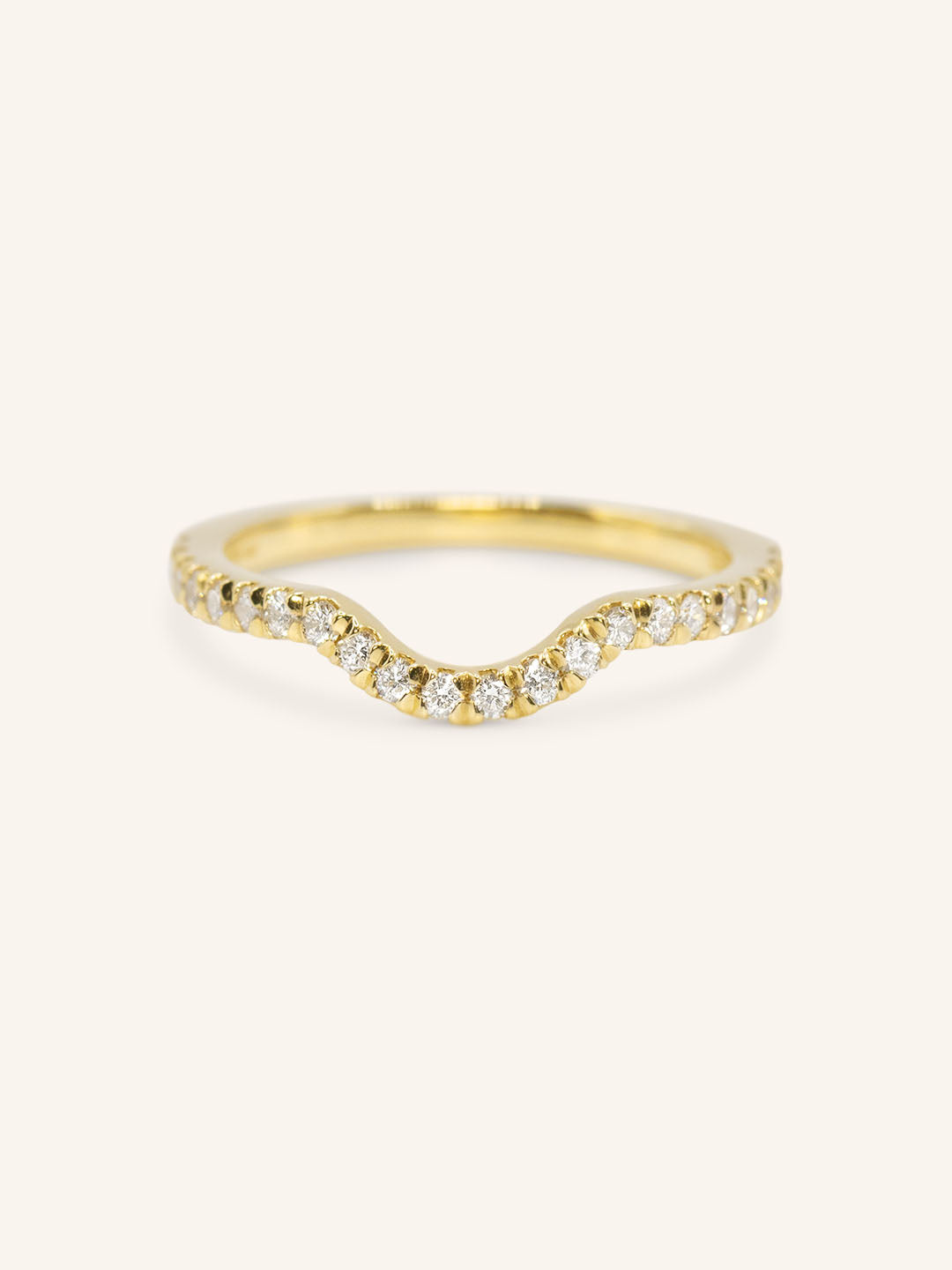The Milla Curved Diamond Wedding Band is a graceful complement to your engagement ring. Designed with a subtle curve and sparkling diamonds, this band perfectly hugs your centerpiece for a seamless and elegant pairing. Its timeless design makes it a beautiful symbol of your enduring love.