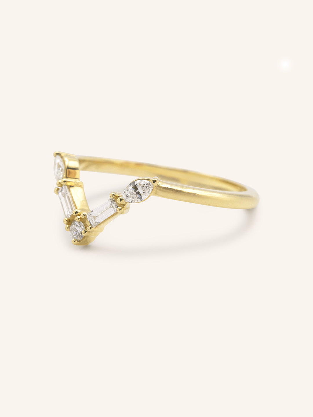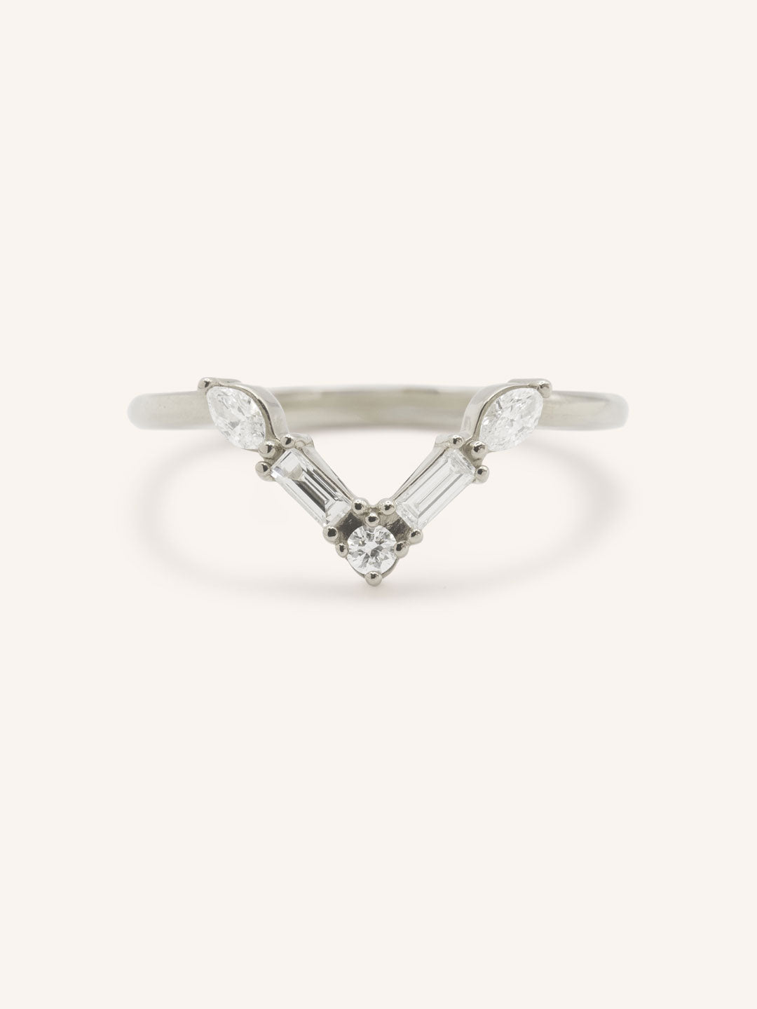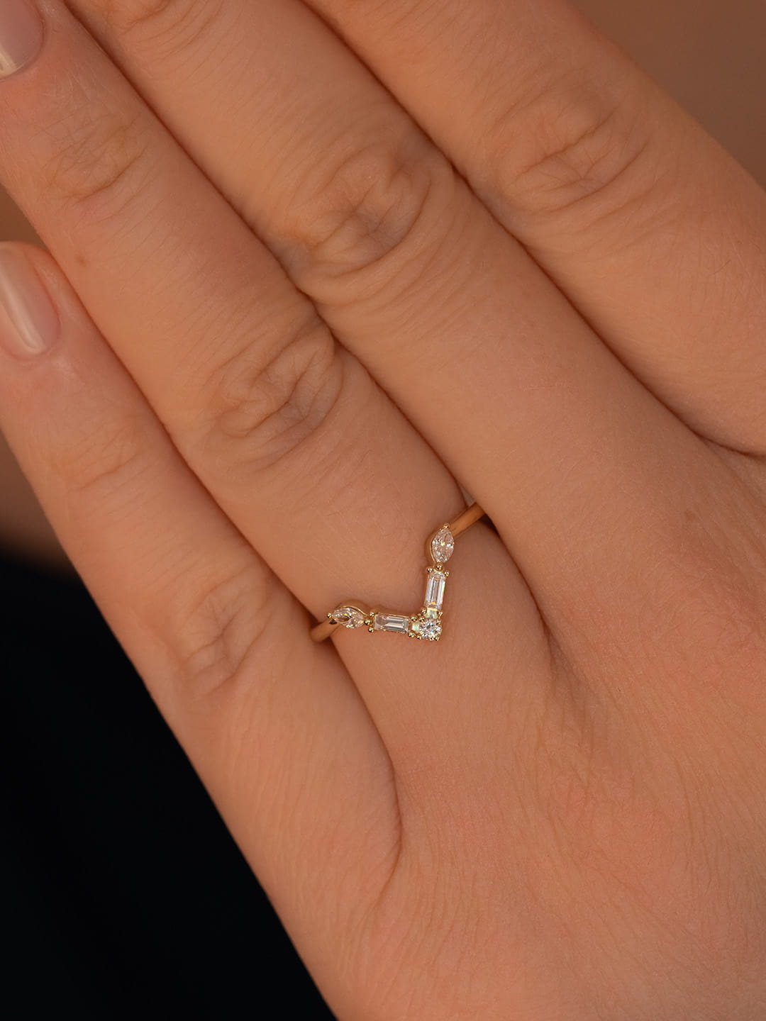 The Rosalina V Diamond Wedding Band showcases a striking chevron design, featuring a mix of marquise, baguette, and round diamonds for a unique and elegant look. The combination of diamond shapes adds dimension and brilliance, making it a perfect pairing for an engagement ring or a standout piece on its own. A blend of modern style and timeless sophistication, this band is a beautiful symbol of love and commitment.