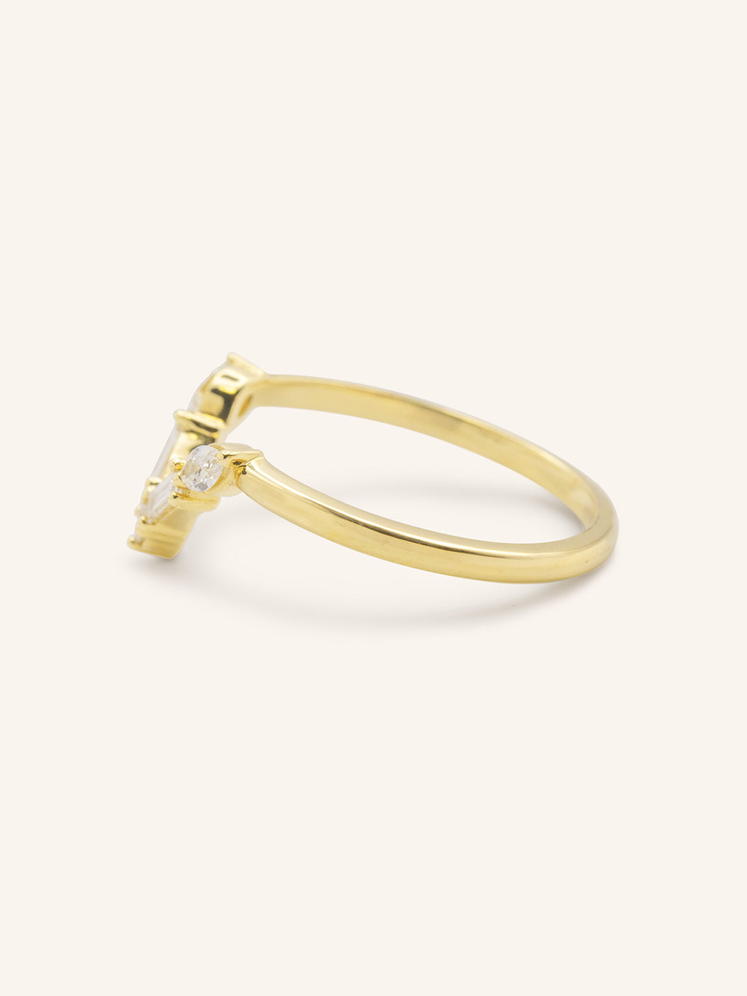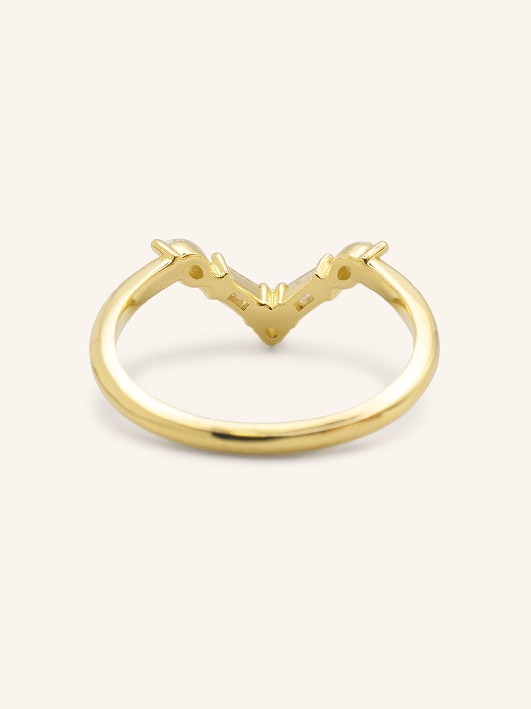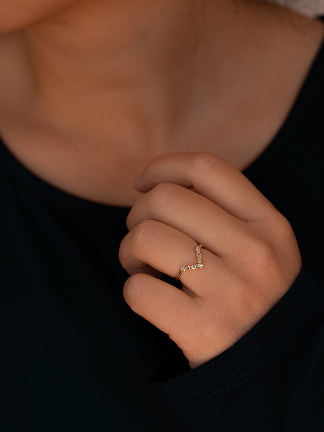 The Rosalina V Diamond Wedding Band showcases a striking chevron design, featuring a mix of marquise, baguette, and round diamonds for a unique and elegant look. The combination of diamond shapes adds dimension and brilliance, making it a perfect pairing for an engagement ring or a standout piece on its own. A blend of modern style and timeless sophistication, this band is a beautiful symbol of love and commitment.