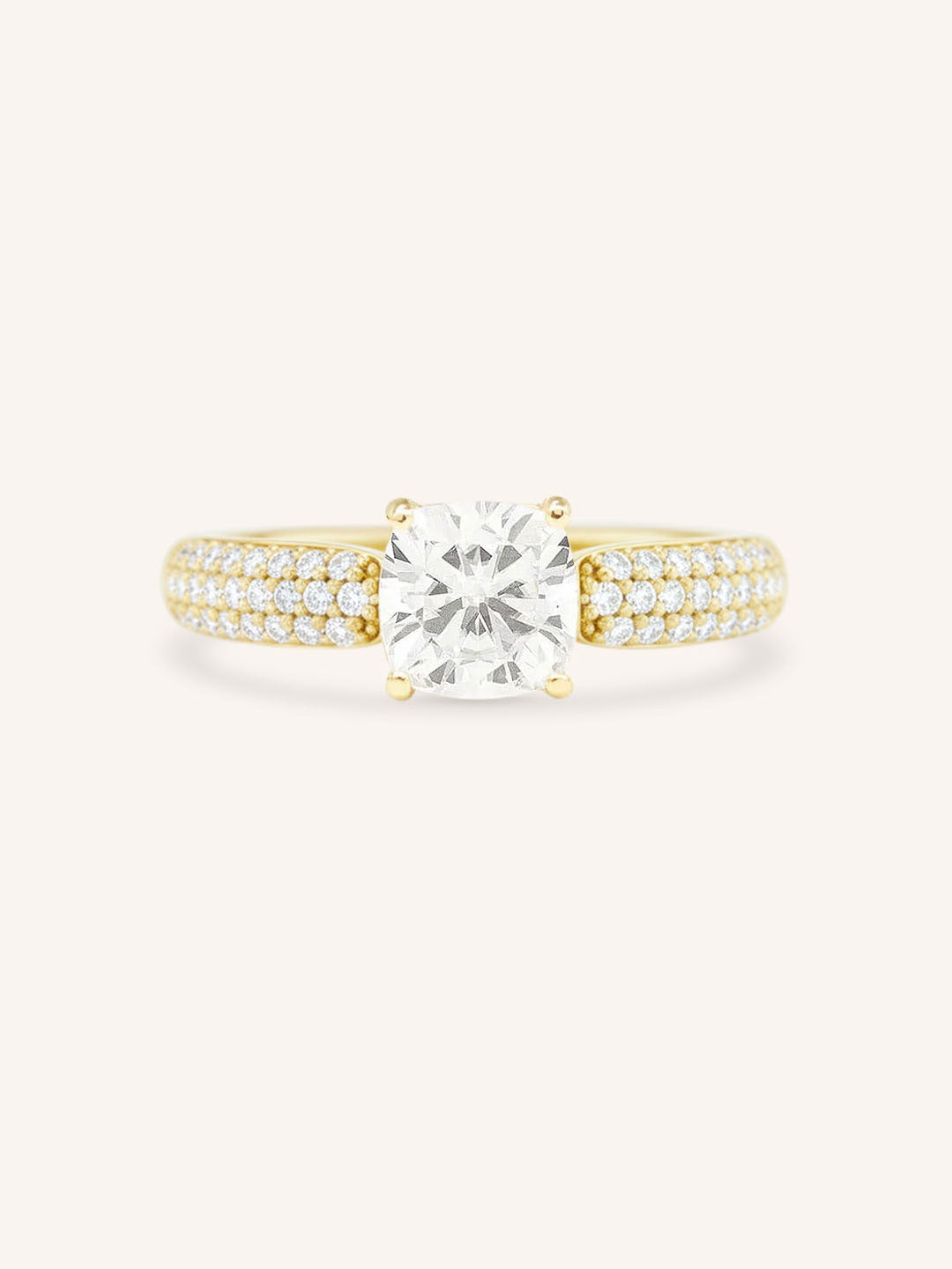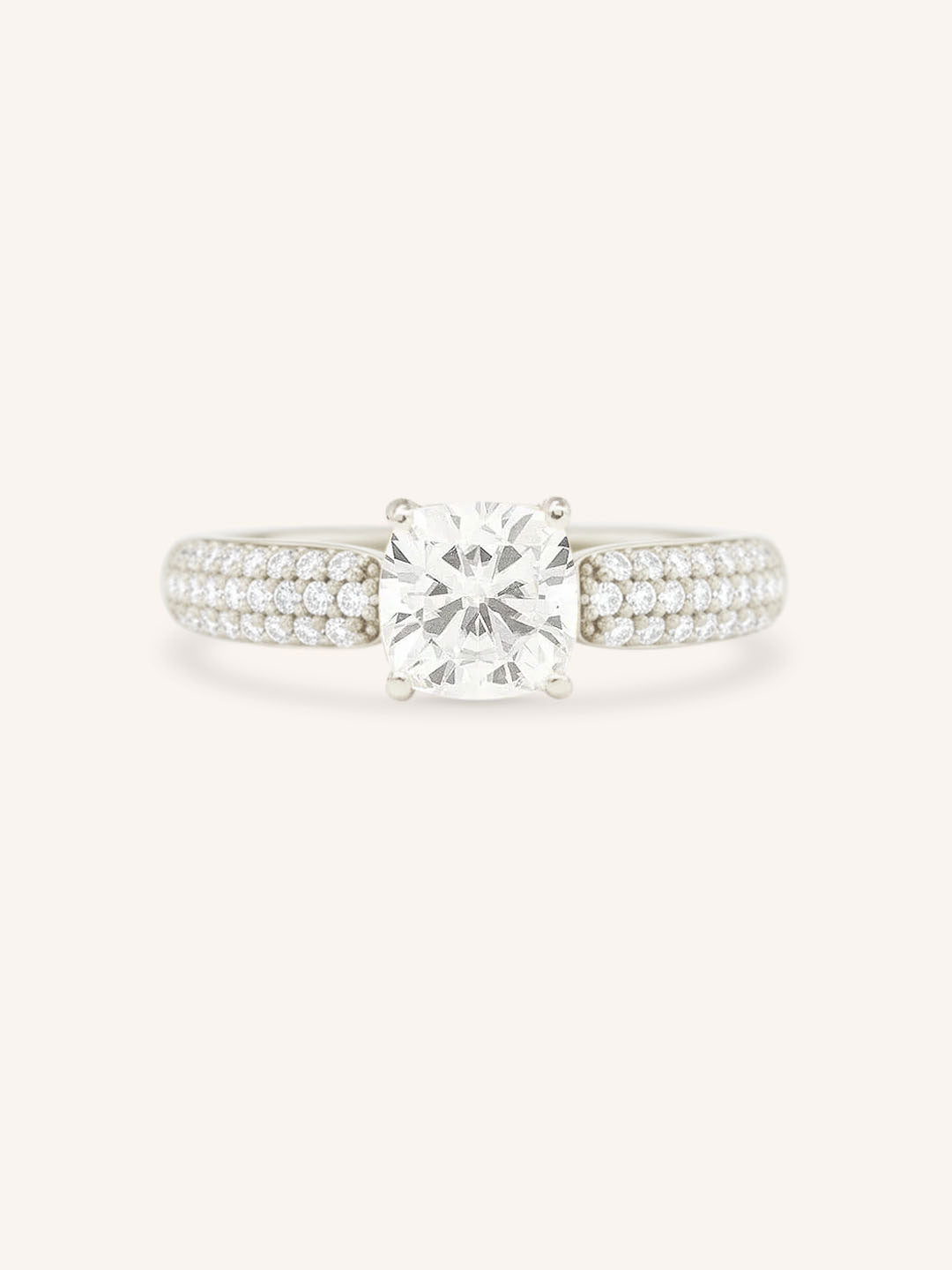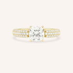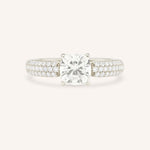 This exquisite design showcases a dazzling solitaire center stone, capturing timeless elegance and brilliance. The shank is adorned with three rows of pavé-set diamonds, adding a sparkling dimension that complements the center gem. Perfect for those who love classic sophistication with a modern twist, this ring is designed to shine from every angle.