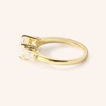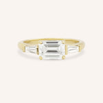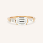 A modern reimagining of a classic style, this engagement ring showcases a striking emerald-cut center diamond set in an east–west orientation. Flanking the center stone are two tapered baguette diamonds, their elongated shape and gentle taper drawing the eye inward for a refined, balanced look. The combination of crisp step-cut facets and sleek horizontal lines creates a contemporary silhouette, while the three-stone design symbolizes your past, present, and future together. Perfect for the bride who loves understated elegance with a distinctive twist.