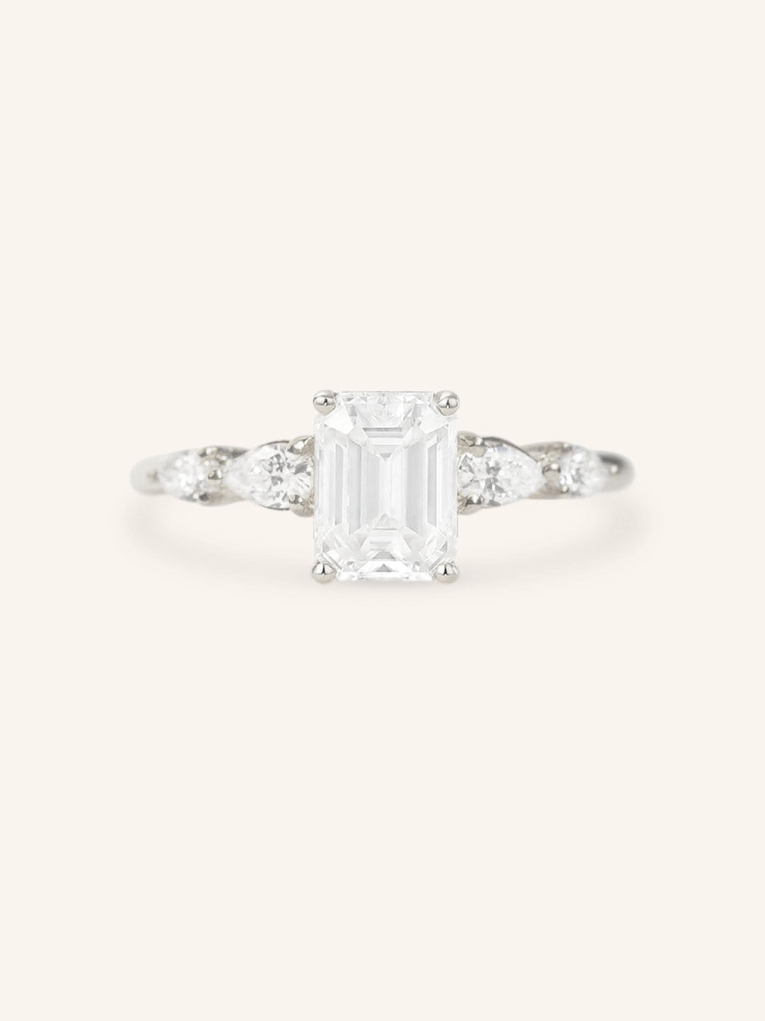 Featuring a emerald cut lab-grown diamond, available in 7x5 mm, 8x6 mm, or 9x7 mm sizes. The center stone will come with an IGI report.