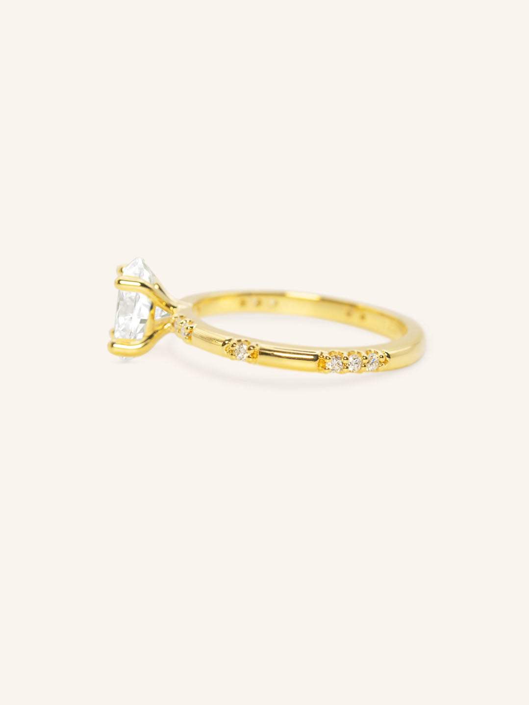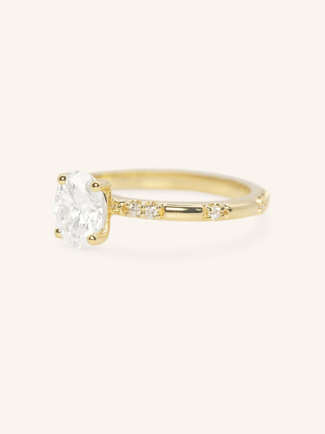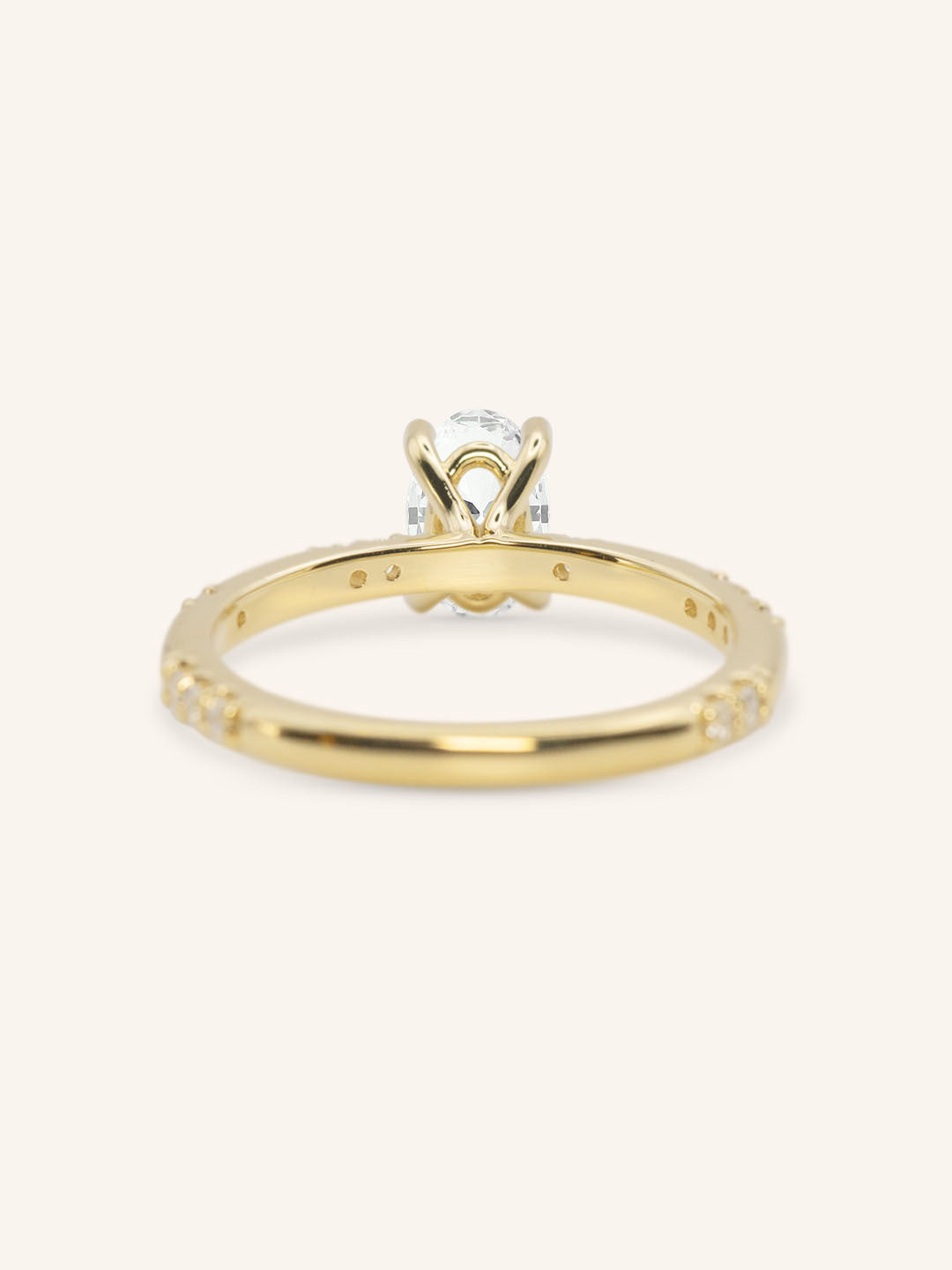 Featuring an oval lab-grown diamond, available in 7x5 mm or 8x6 mm sizes.