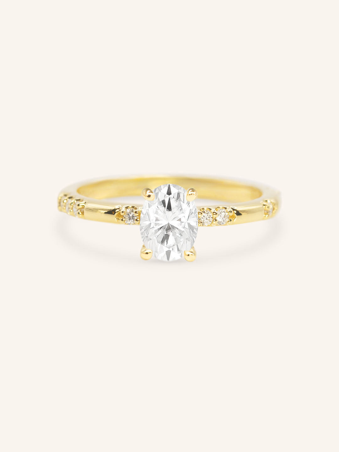 The Eliane Oval Diamond Accented Engagement Ring is a refined design that embodies understated beauty. Featuring an elegant oval diamond as the centerpiece, this ring is enhanced with a band of delicately spaced diamonds, creating a balanced and modern look. The subtle placement of the accent diamonds allows the center stone to take the spotlight while adding a touch of brilliance to the overall design. A timeless choice for those who appreciate sophistication and simplicity.