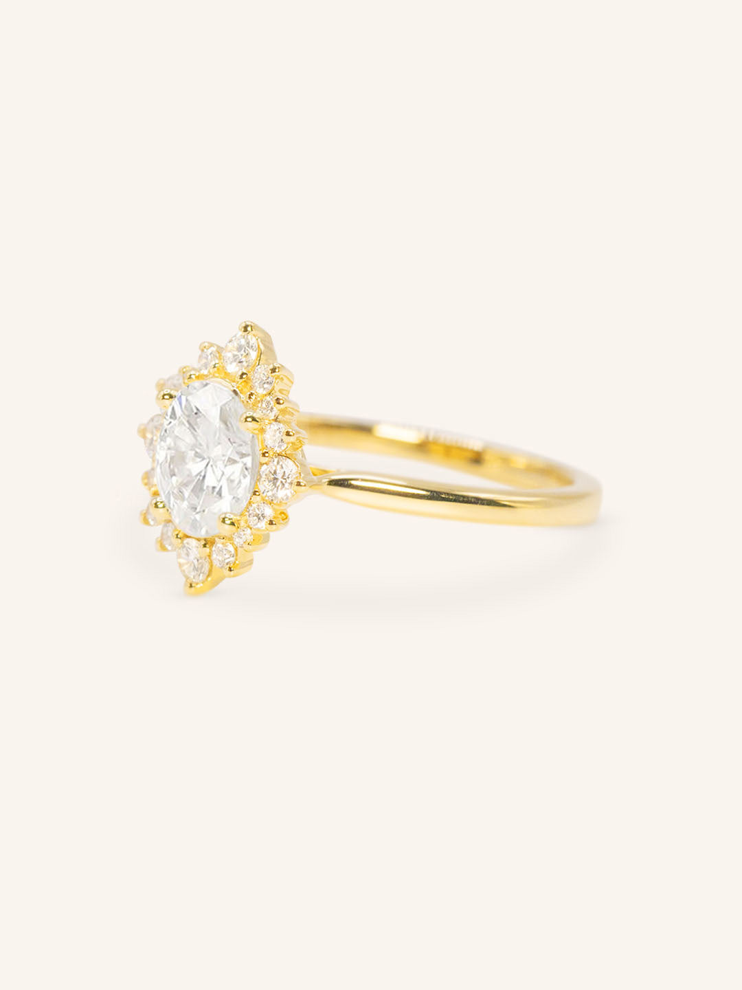 The Elisa Engagement Ring features a stunning oval center surrounded by a cluster of sparkling diamonds in a halo-style setting. This design adds brilliance from every angle, offering a romantic, vintage-inspired look with a modern touch. A graceful ring that makes a striking statement.