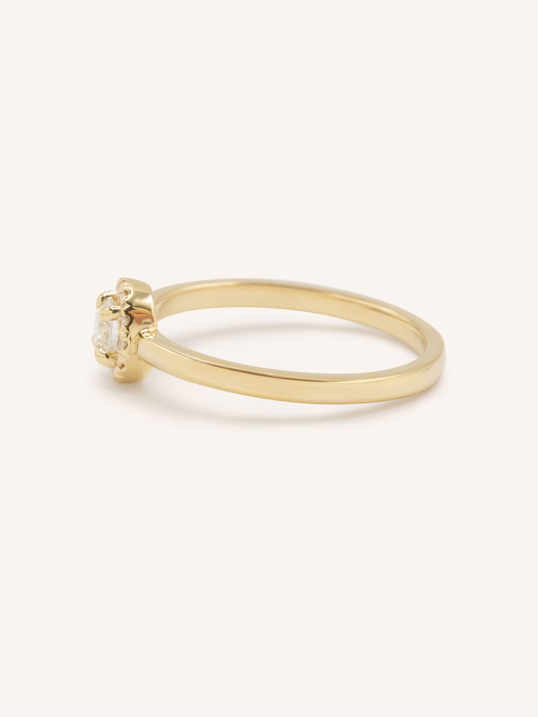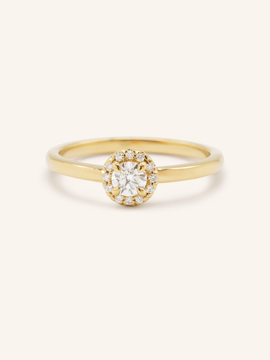 The Juliet Diamond Halo-Style Ring exudes timeless romance with its enchanting design. Featuring a dazzling center diamond encircled by a radiant halo of smaller diamonds, this ring amplifies brilliance and sparkle. The band, sleek and refined, ensures all attention remains on the breathtaking centerpiece. A perfect choice for those seeking a classic yet elegant symbol of love.