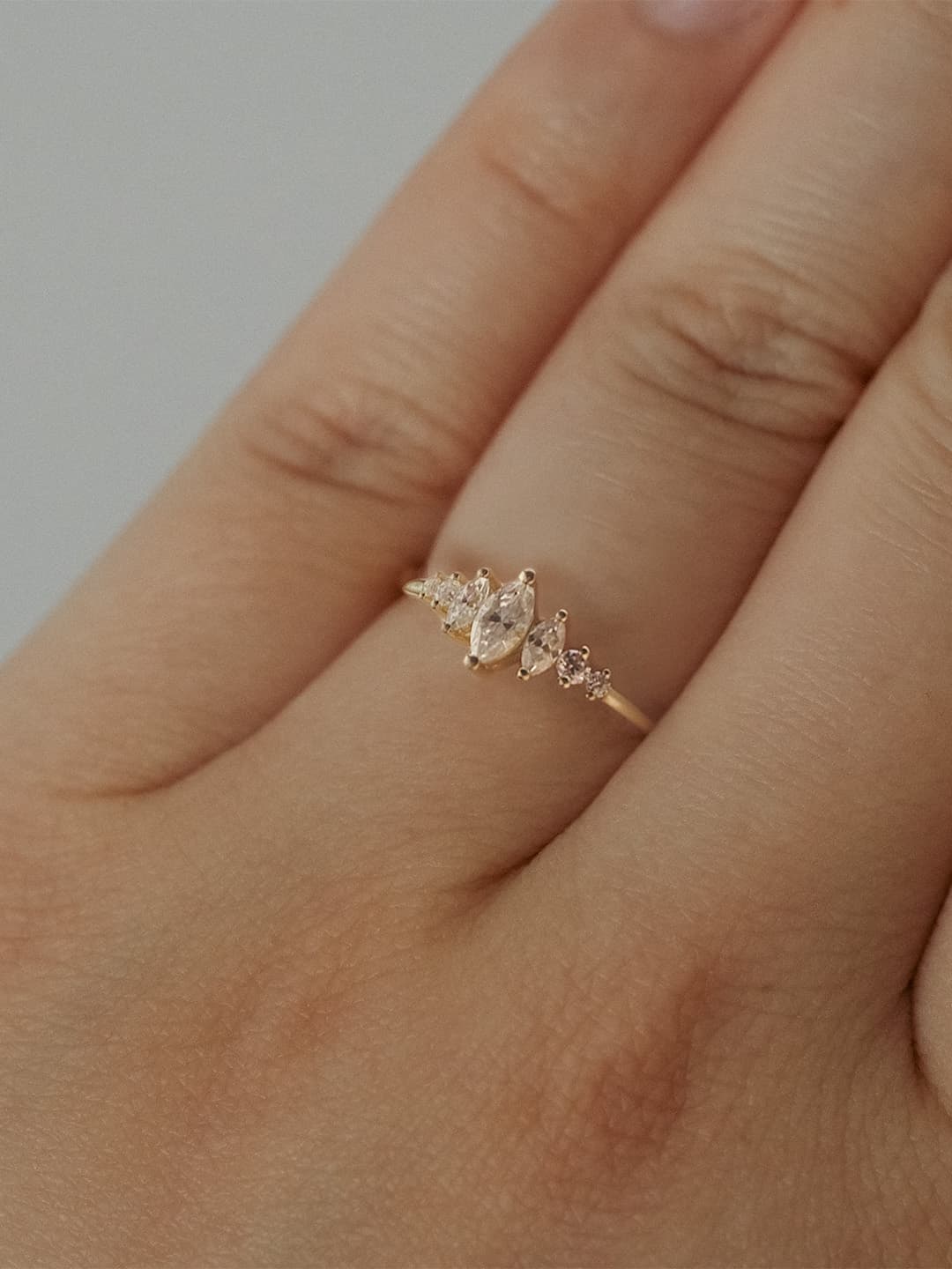 Our 7 stone ring set with marquise and round moissanites is an exquisite and unique engagement ring that will take your breath away. The antique-inspired design is crafted from high-quality 14k gold and features a stunning combination of marquise and round moissanites, making it a perfect vintage-inspired ring. This ring is also versatile enough to be used as a stacking ring, women's bridal, anniversary or promise ring, making it a cherished piece in your jewelry collection.