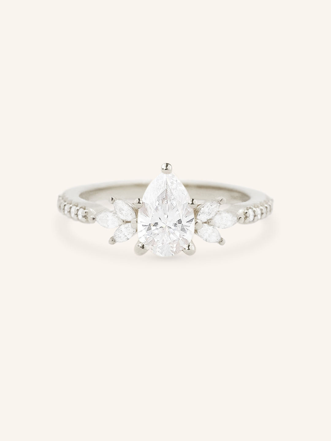 Featuring a pear faceted lab-grown diamond, available in 7x5mm or 8x6mm size. *Sizes are approximate and measurements are subject to change/alter to fit. The center stone will come graded with a certified report.