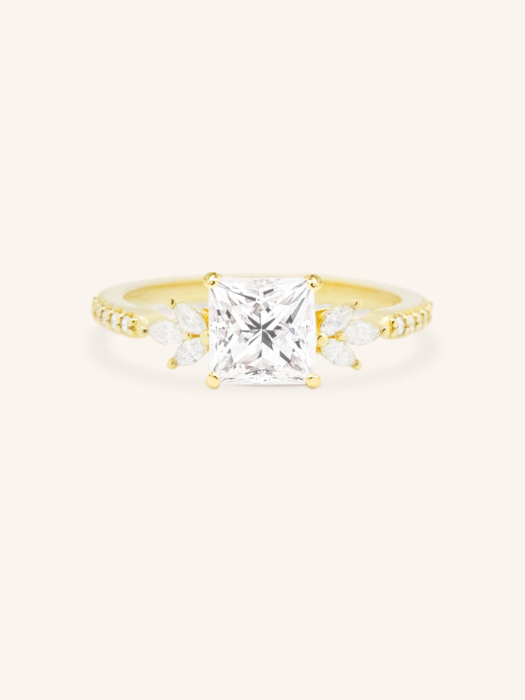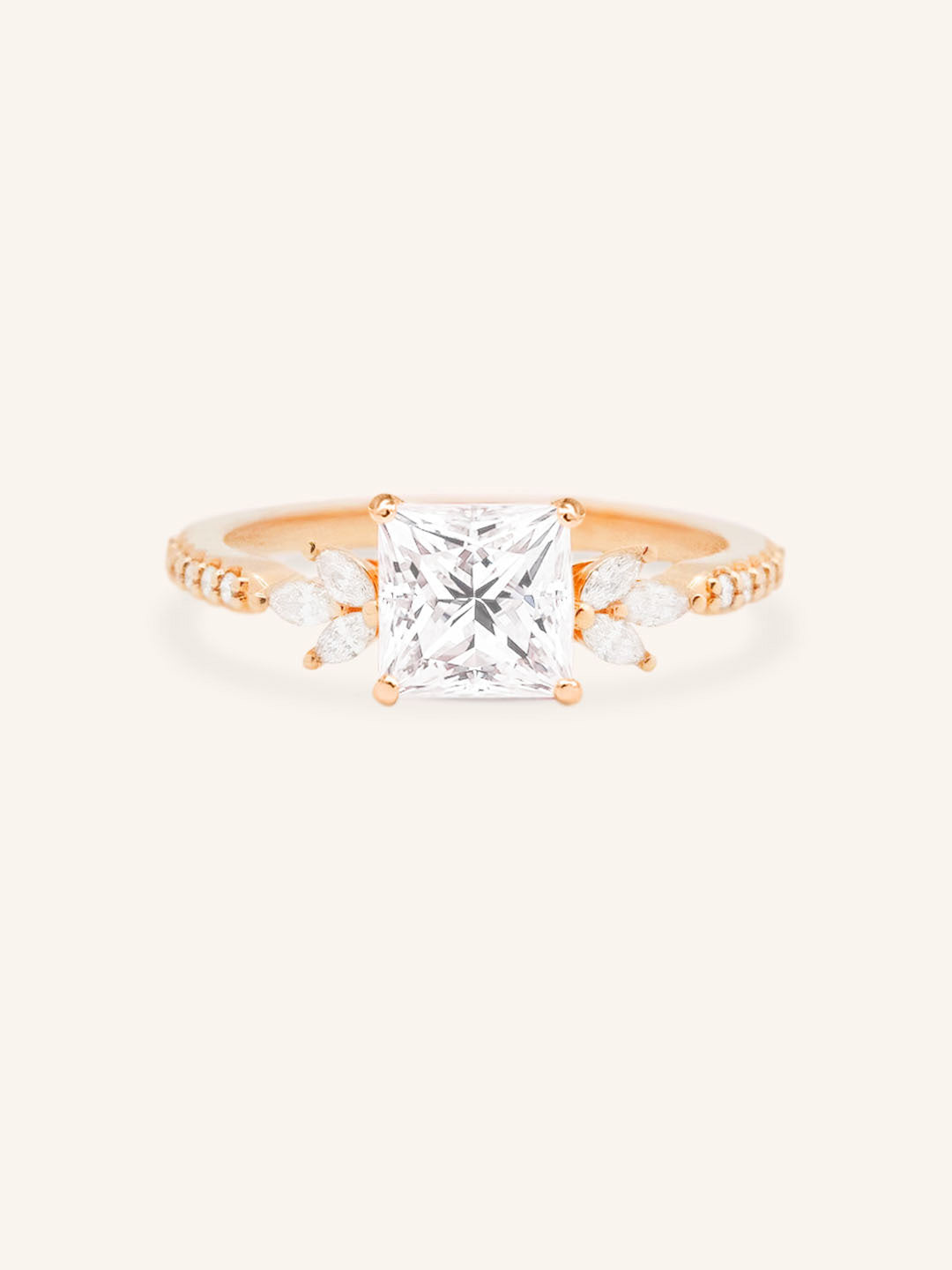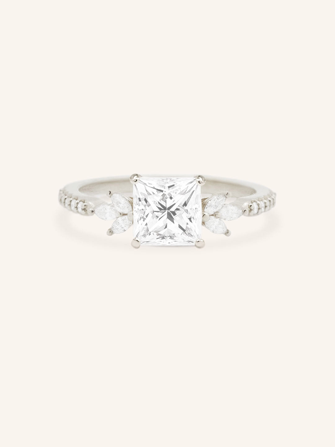 The Melina Dee Diamond Engagement Ring is a masterpiece of natural beauty. Marquise diamonds bloom outward from the center stone, evoking the grace of petals, while accent diamonds line the band for added brilliance. This distinctive design captures elegance and romance, making it a perfect symbol of your love story.