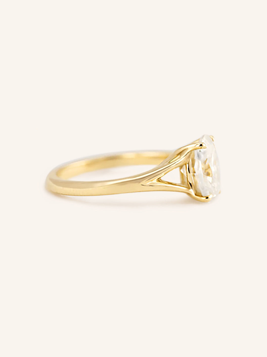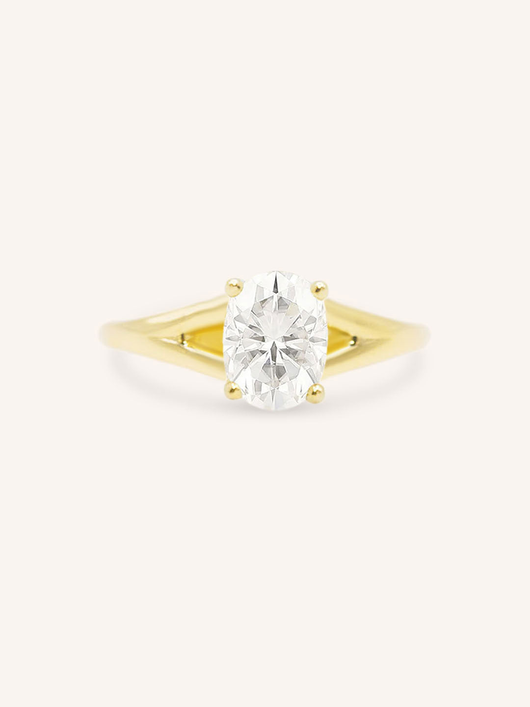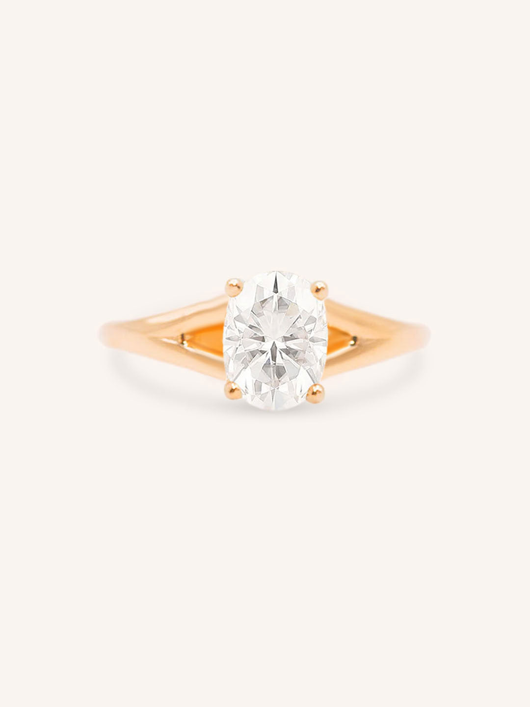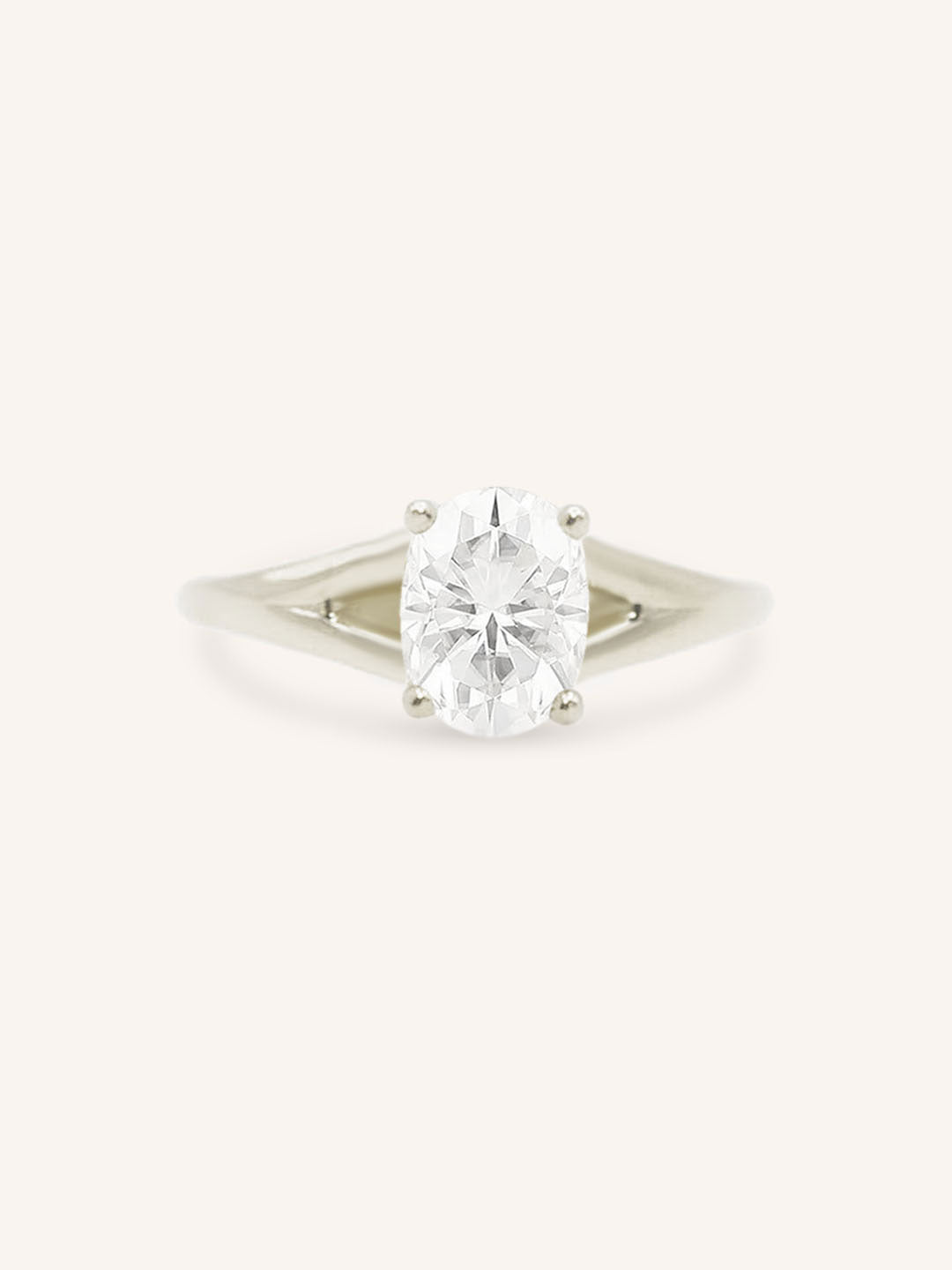 Featuring an oval faceted lab-grown diamond, available in 7x5mm or 8x6mm. *Sizes are approximate and measurements are subject to change/alter to fit. The center stone will come graded with a certified report.
