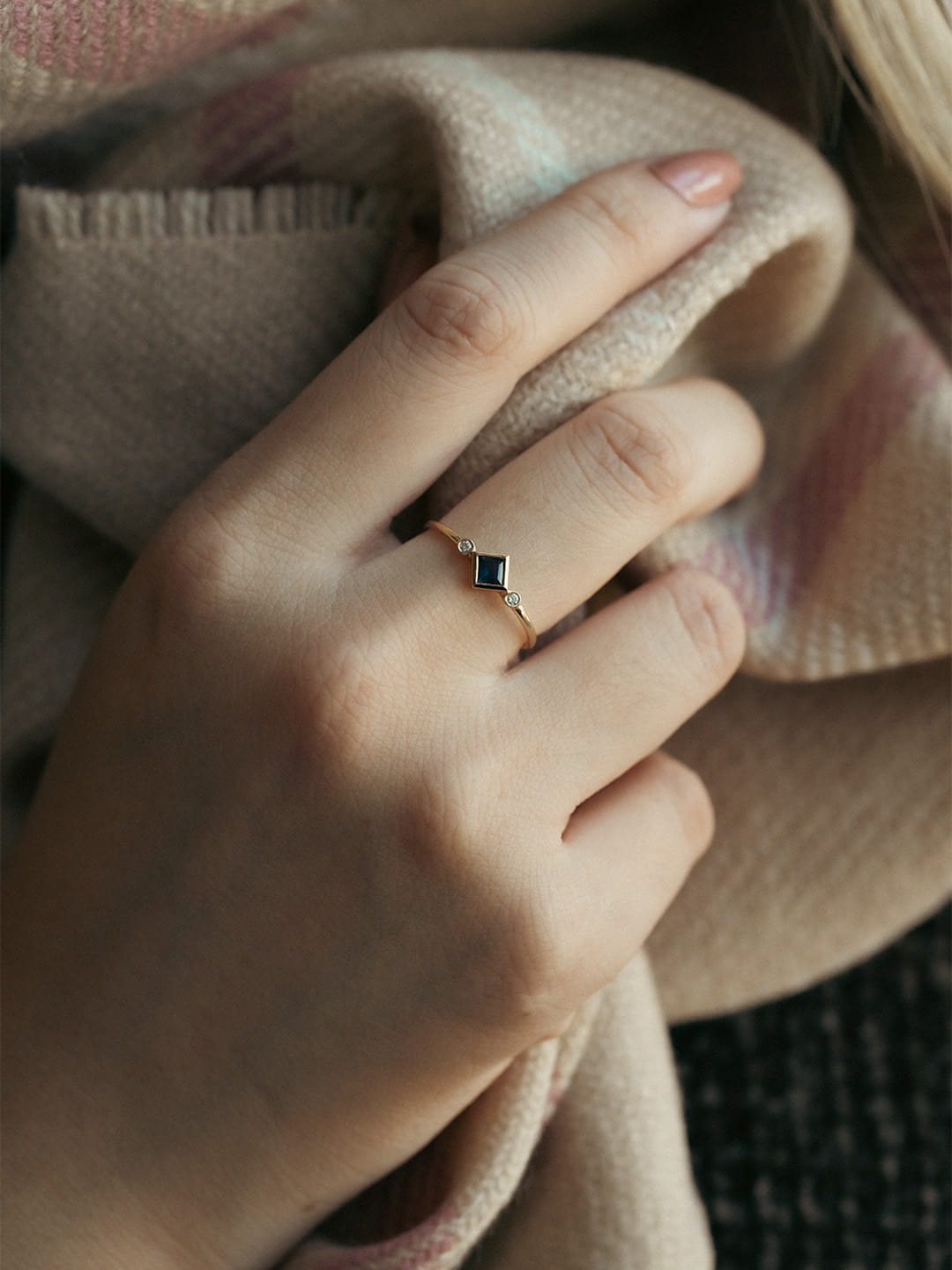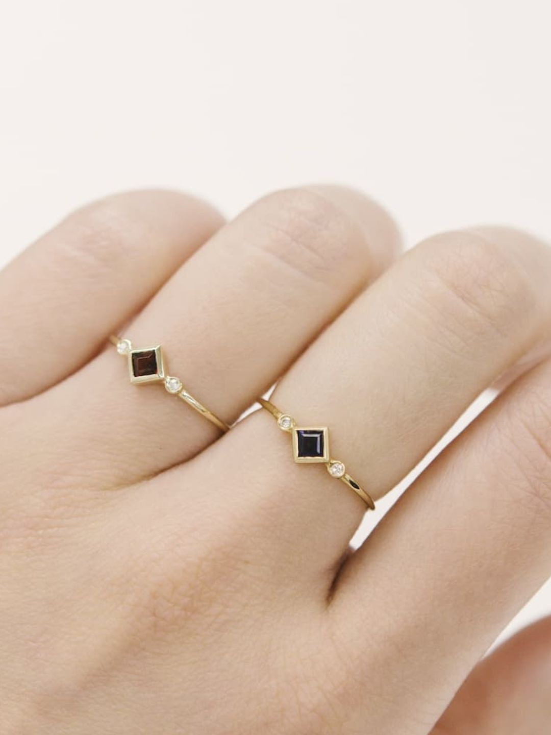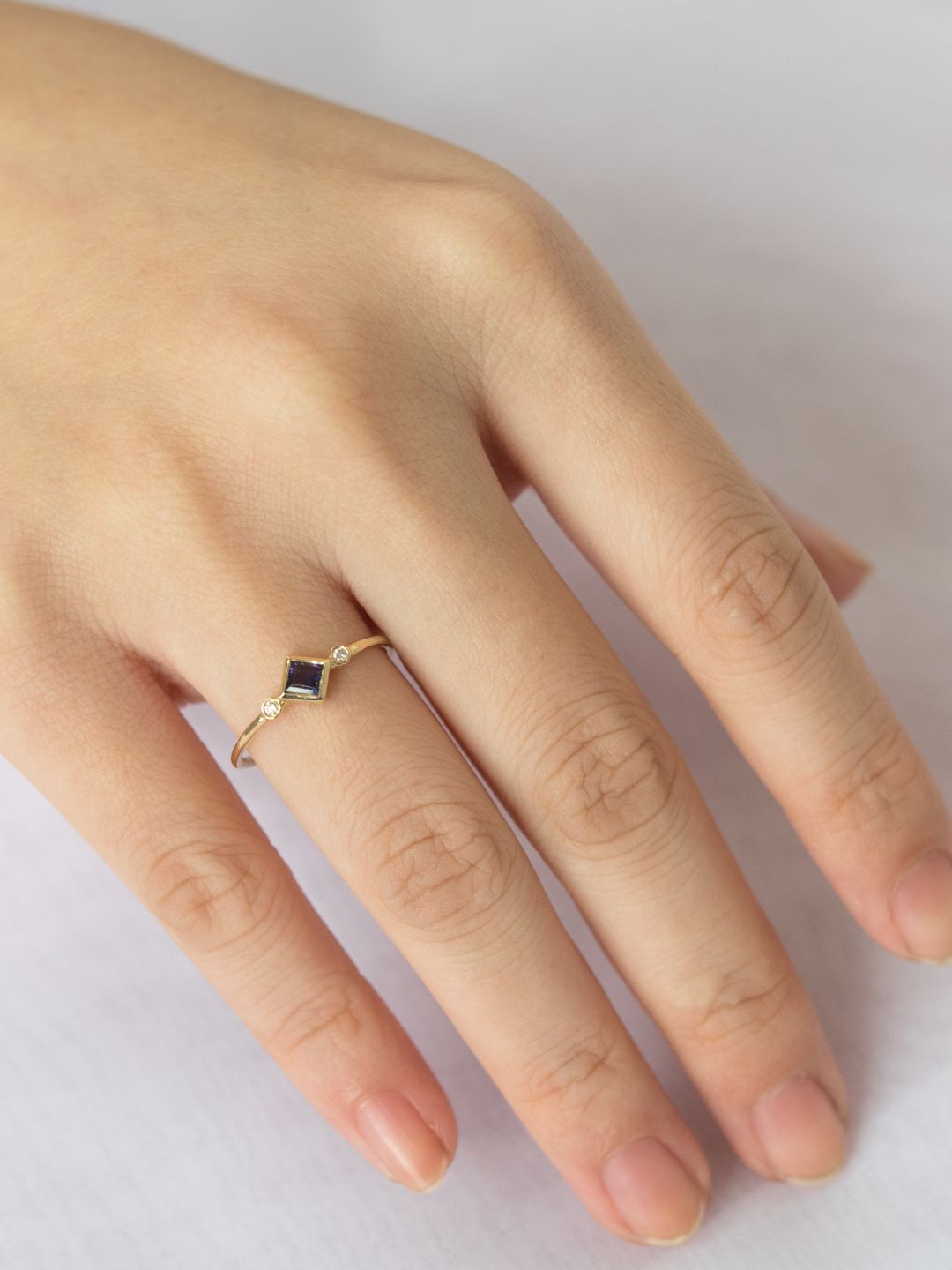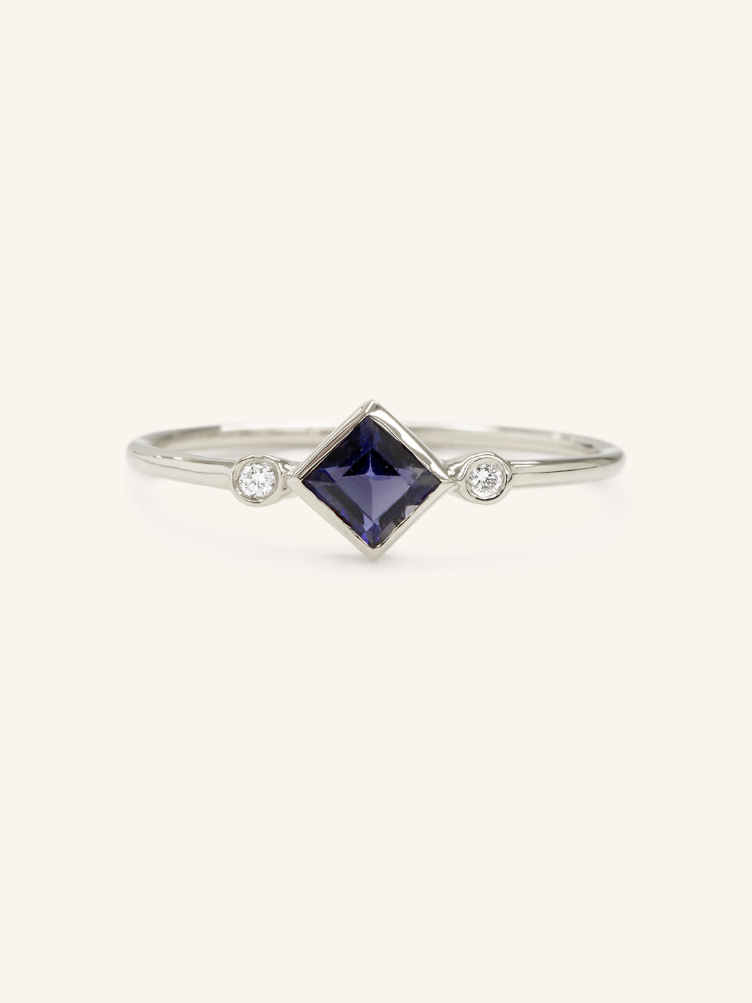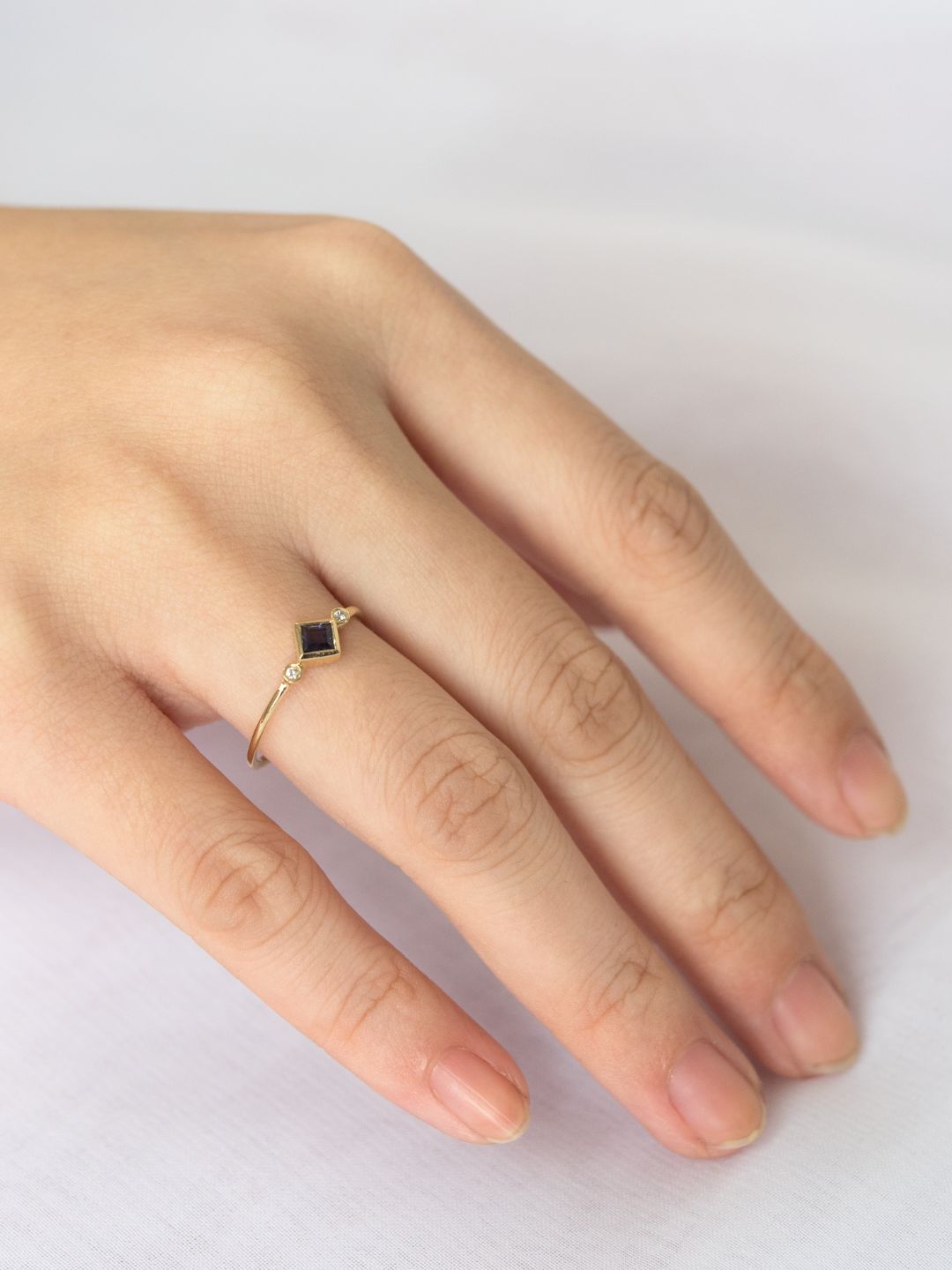 Wildflowers represent a joy that is colored in the most amazing hues. The Wildflower ring emulates this happiness with a petite ring you can stack or wear alone. It features a minimal princess cut gemstone bezel-set diagonally embellished by two luminous diamonds to make the rich colors of the ring blossom.