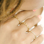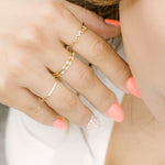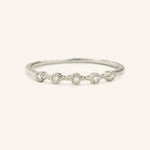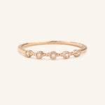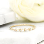 With a bohemian flair, this petite ring designed with beaded bezels set with diamonds that is evenly spaces on top of the ring is a unique wedding ring to pair with your dainty engagement ring.