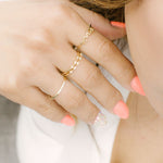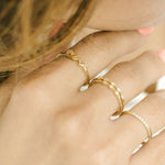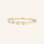 With a bohemian flair, this petite ring designed with beaded bezels set with diamonds that is evenly spaces on top of the ring is a unique wedding ring to pair with your dainty engagement ring.