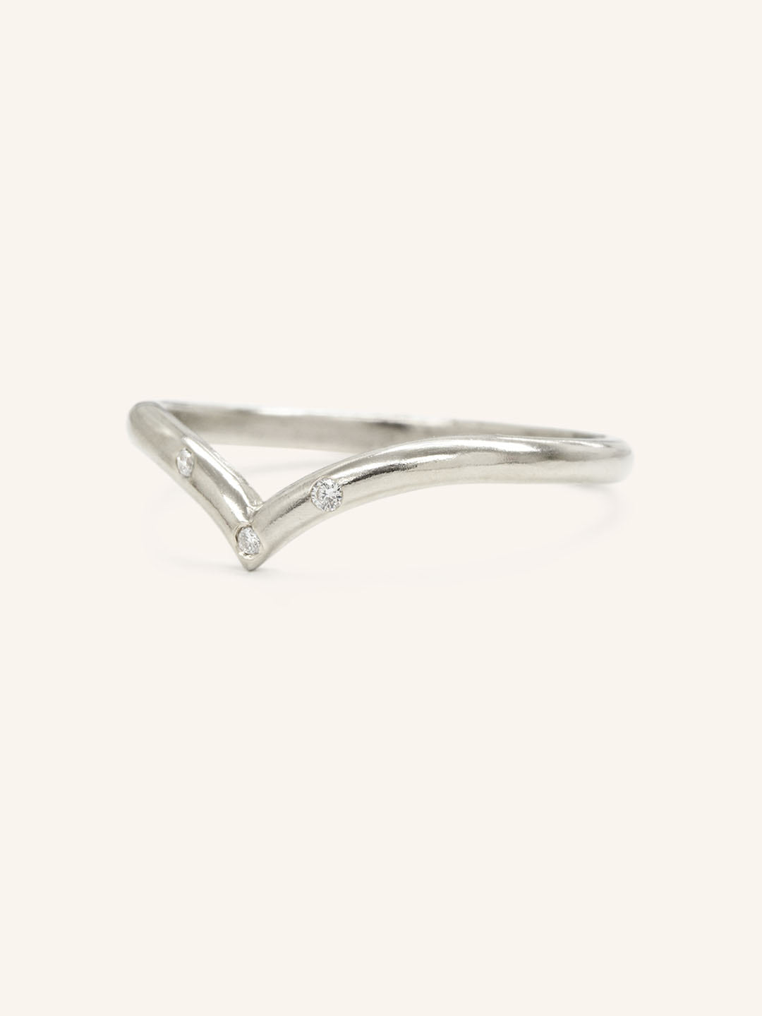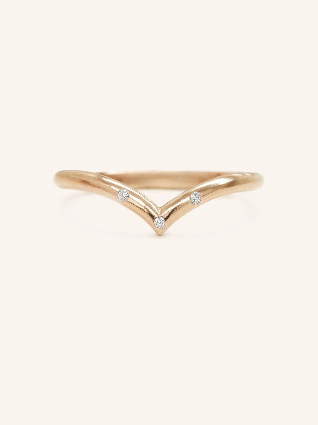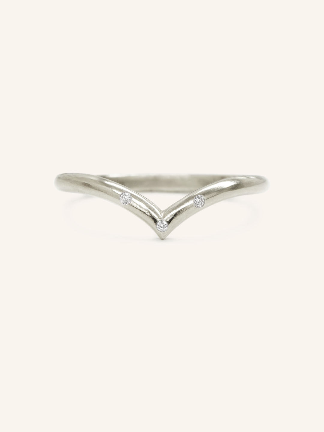 A modern wedding band with a choice of a single, three, or five burnished brilliant diamonds spaced evenly across the front of the ring made with 14k solid gold, this is a ring that can compliment an engagement ring with a pear or marquise cut stone as well as wearing it by itself for a comfortable everyday ring.