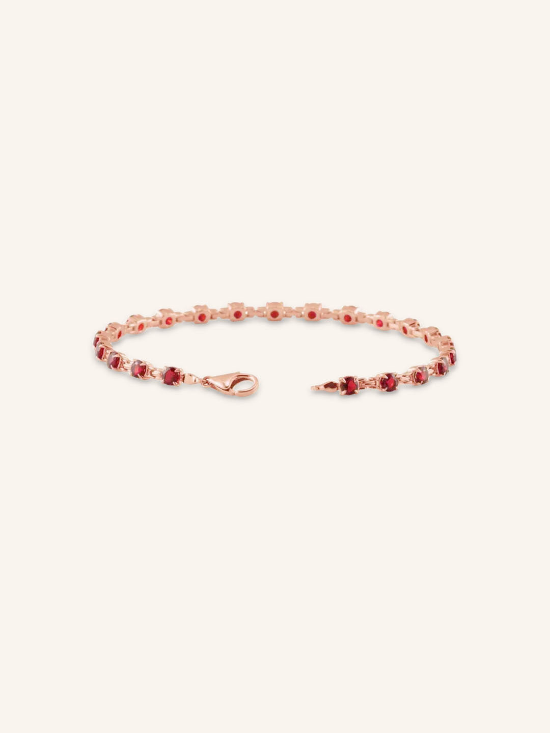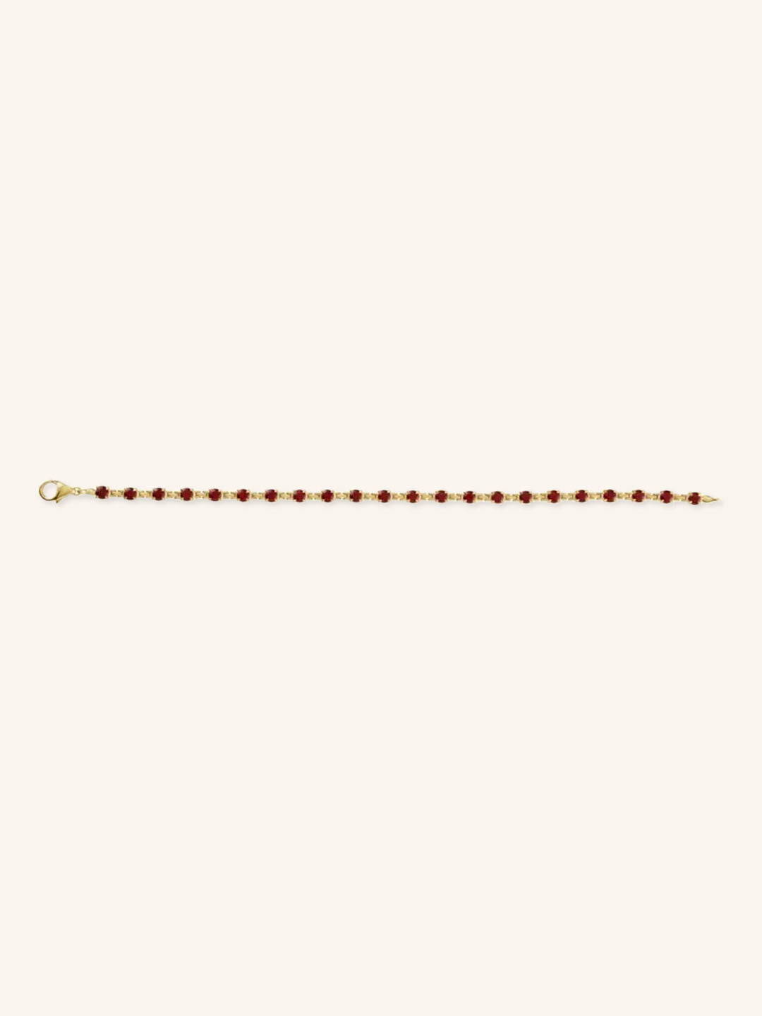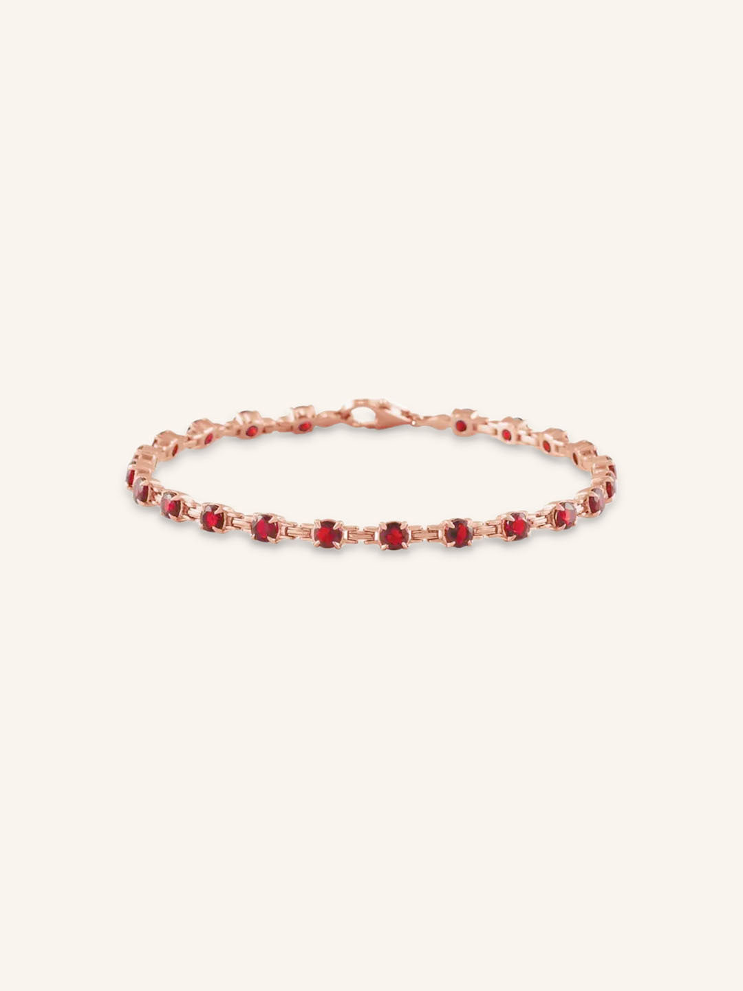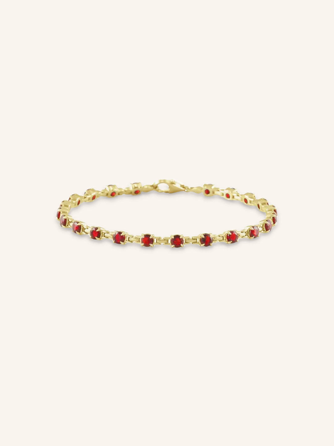 The Evlyn collection is an exquisite line of jewelry that features a single row of beautifully round cut garnet gemstones set in a solid gold setting. The Evlyn is the perfect way to add a touch of glamour to your wardrobe.