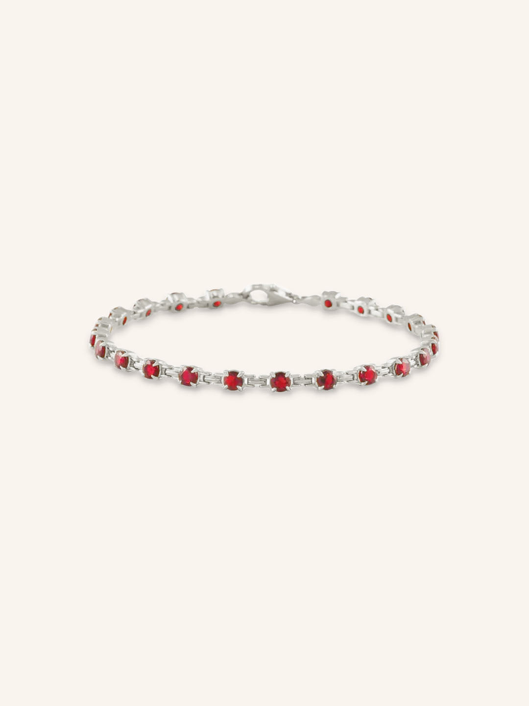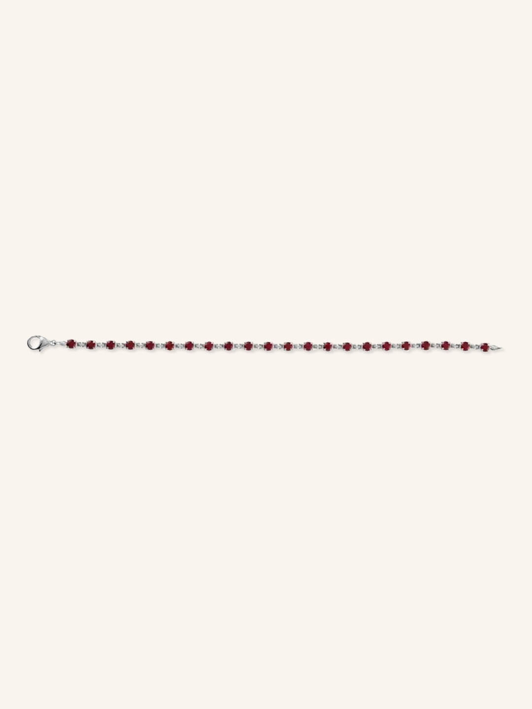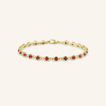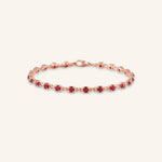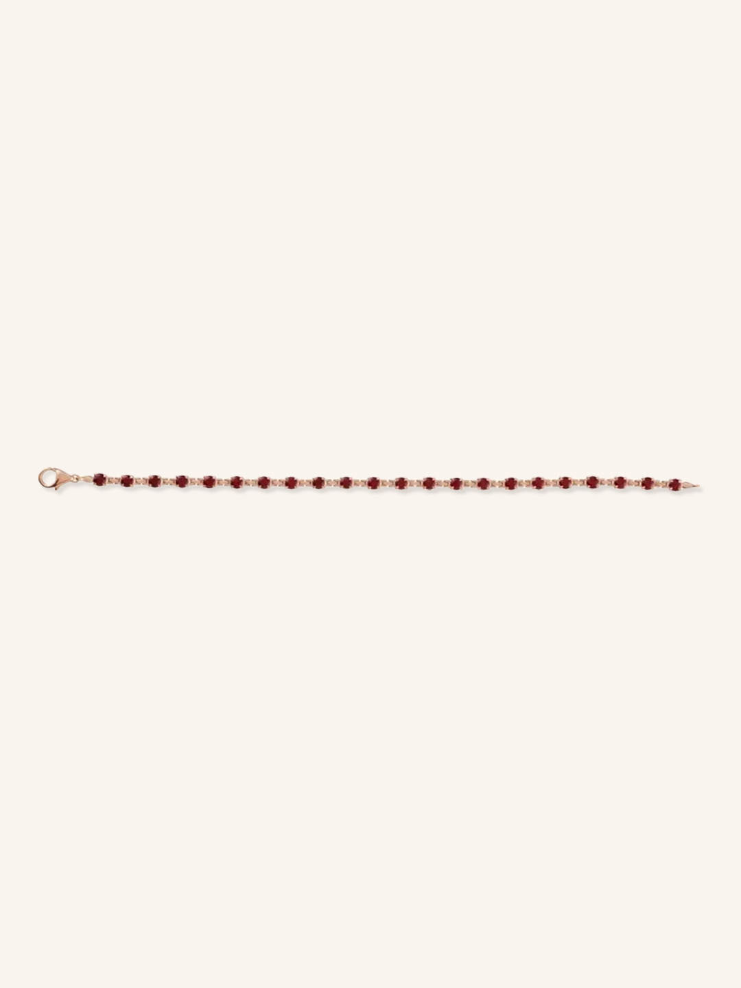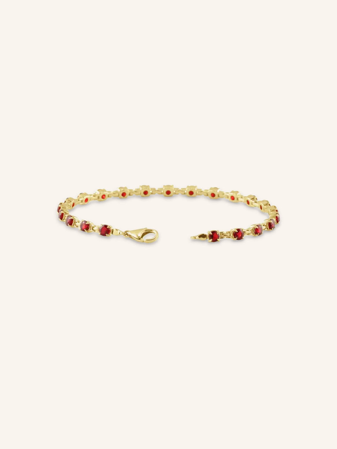 The Evlyn collection is an exquisite line of jewelry that features a single row of beautifully round cut garnet gemstones set in a solid gold setting. The Evlyn is the perfect way to add a touch of glamour to your wardrobe.