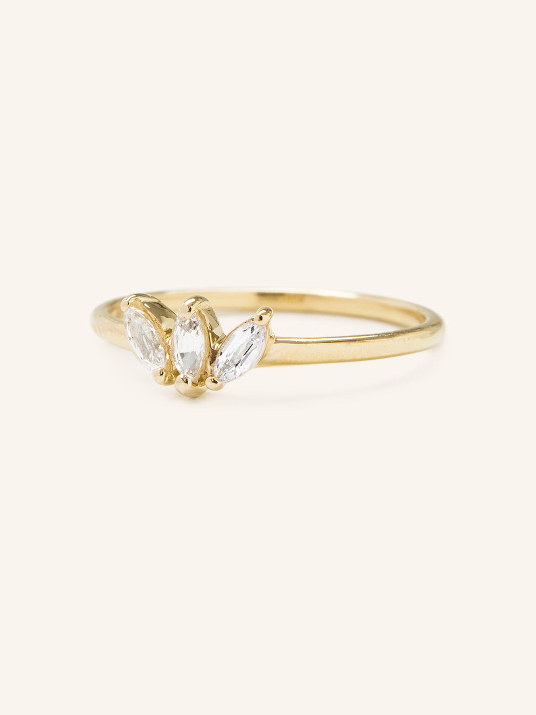 Three white sapphire marquises delicately fanned on a solid 14k gold. A frosty look matching the first snow that has fallen on the ground.