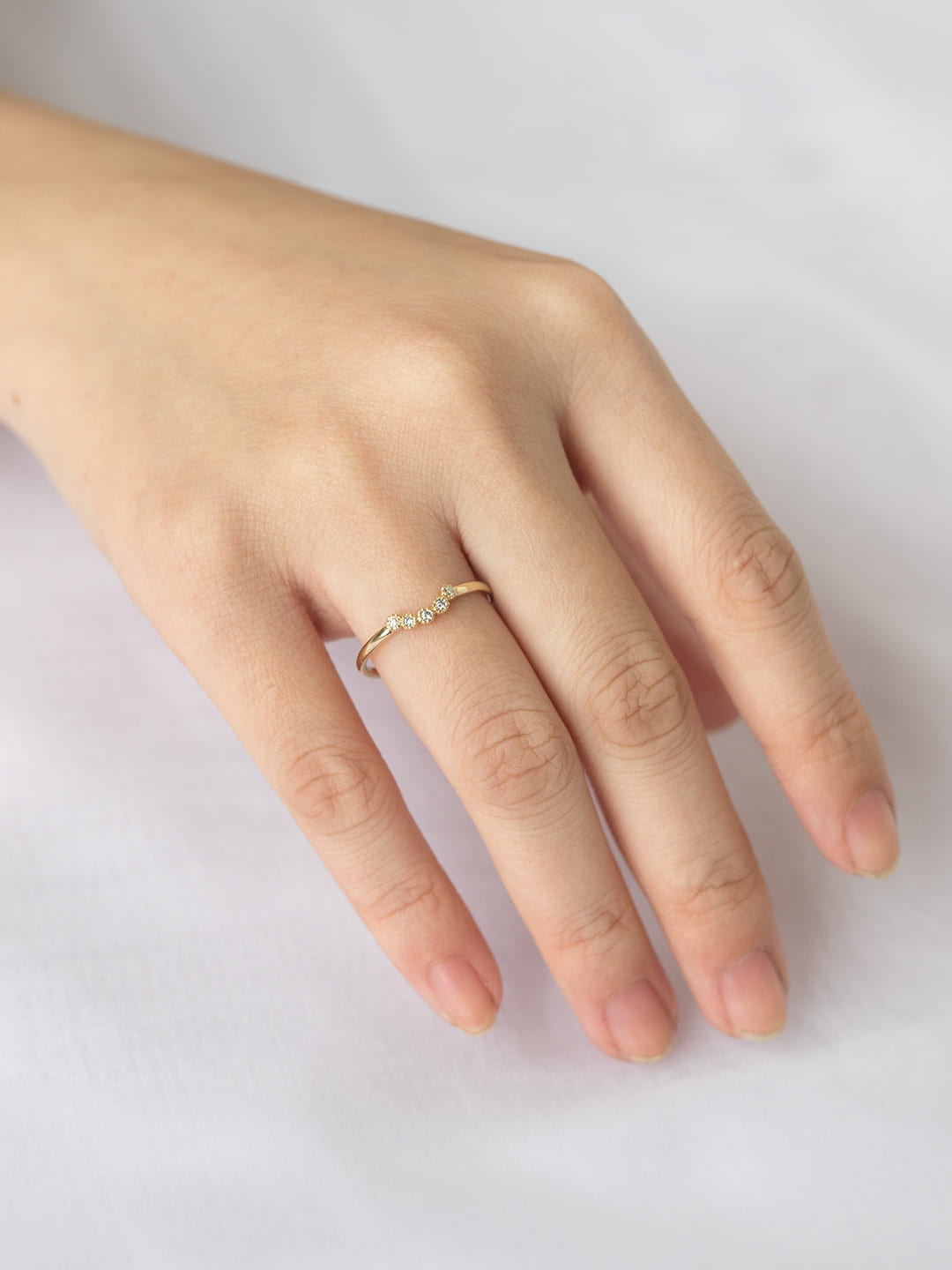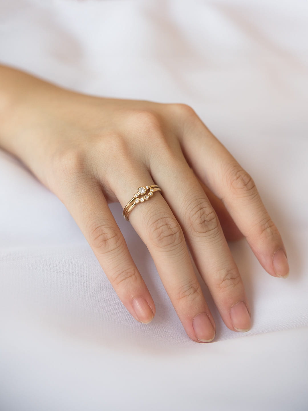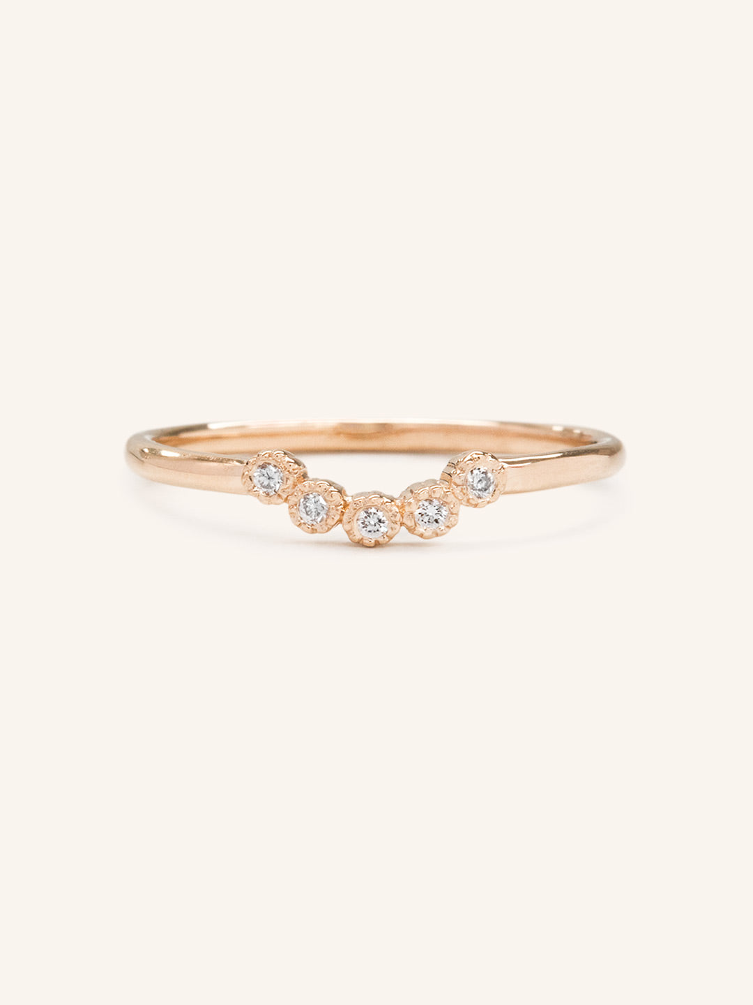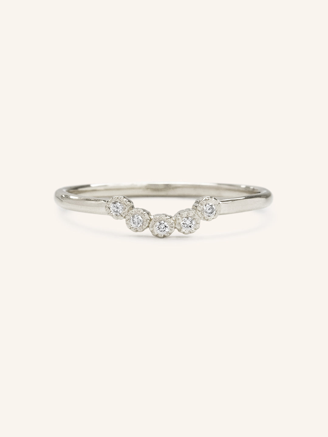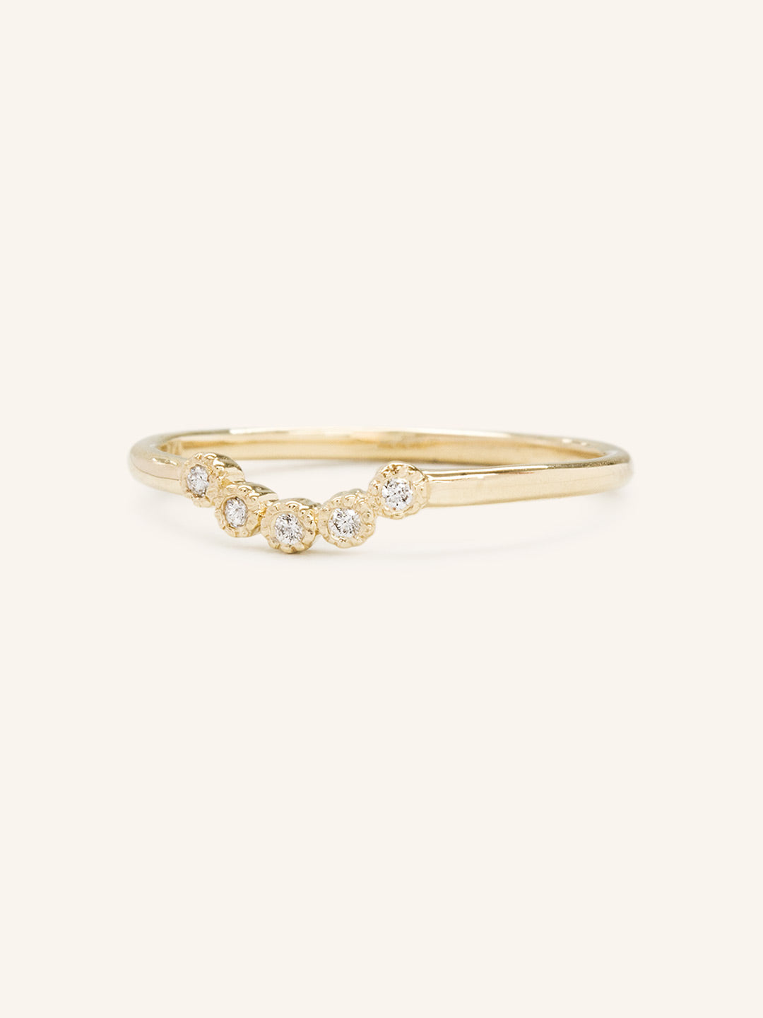 Complete your ensemble with The Love in the Mist Diamond ring. This piece is a petite curve milgrain diamond ring that is the quintessential pair for your dainty engagement ring.