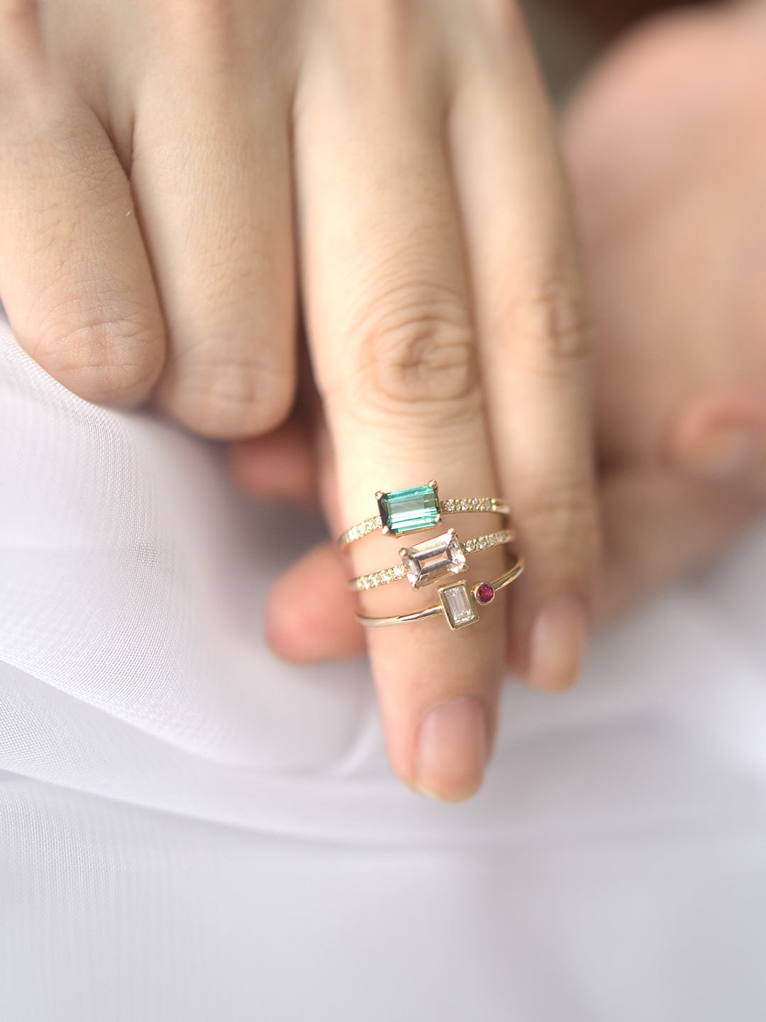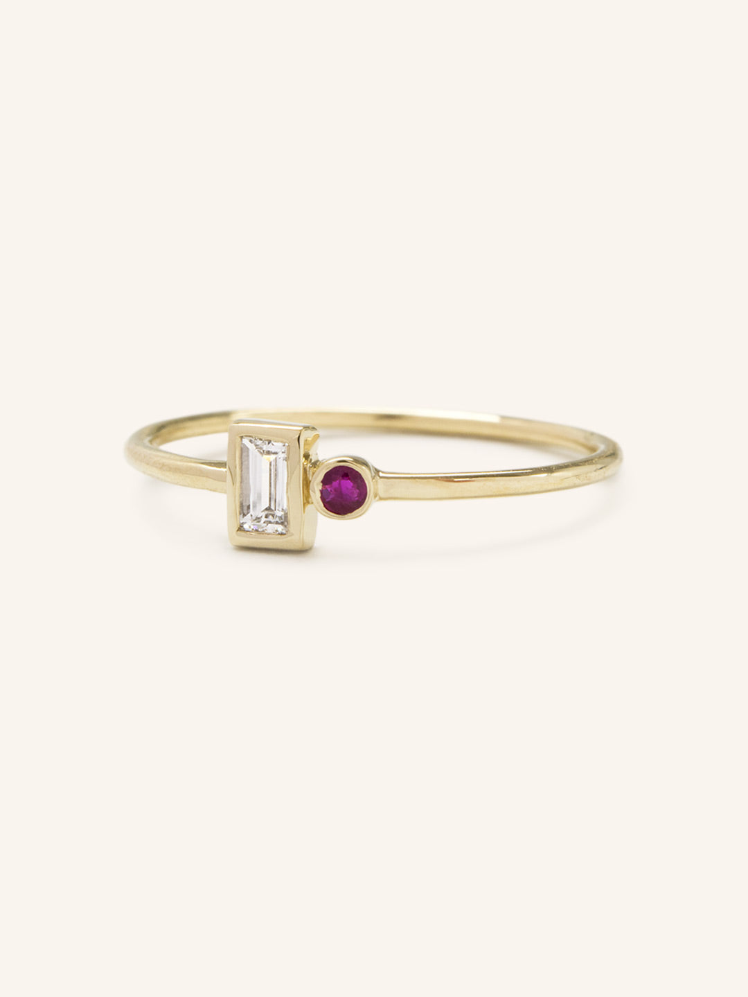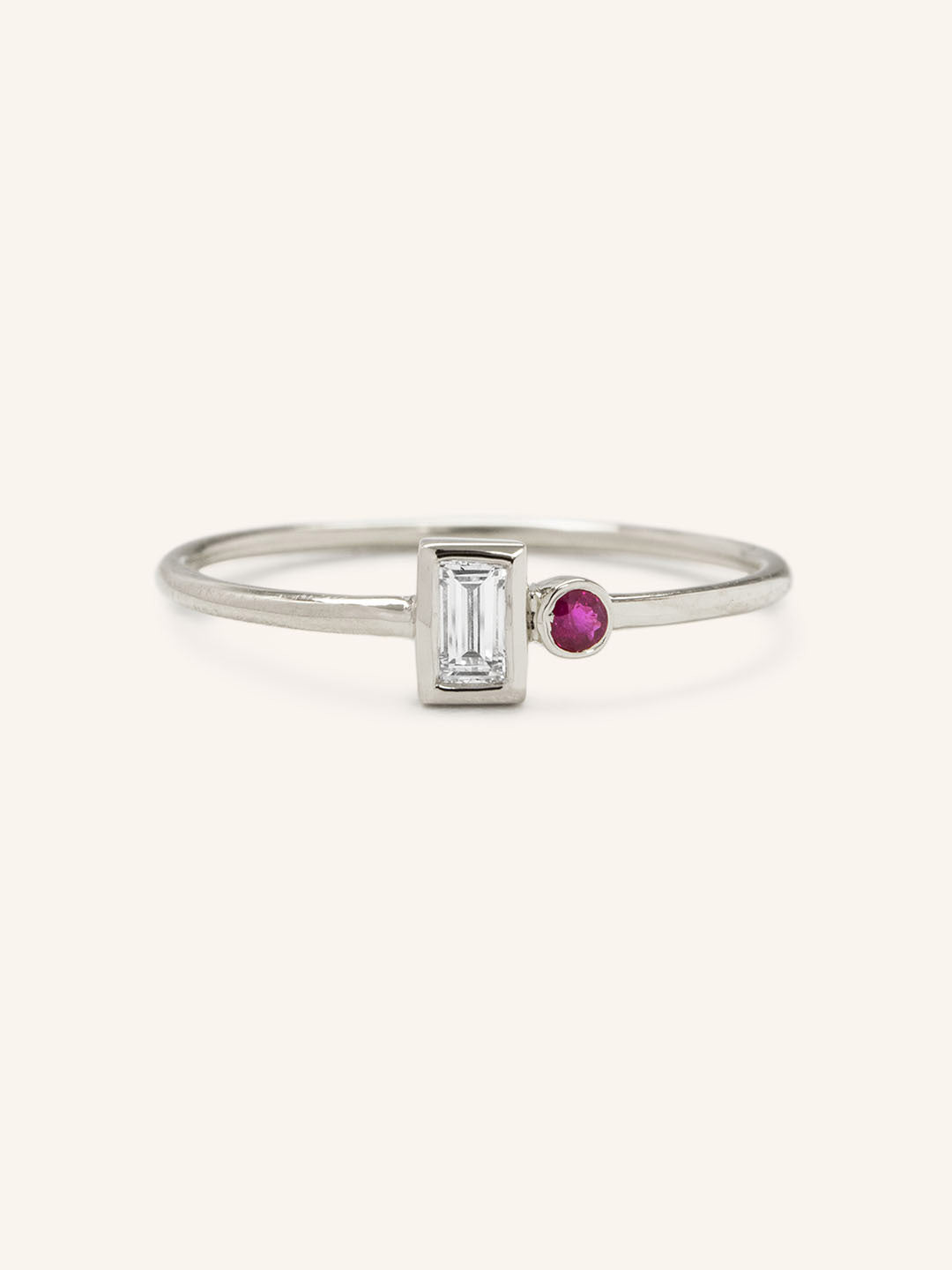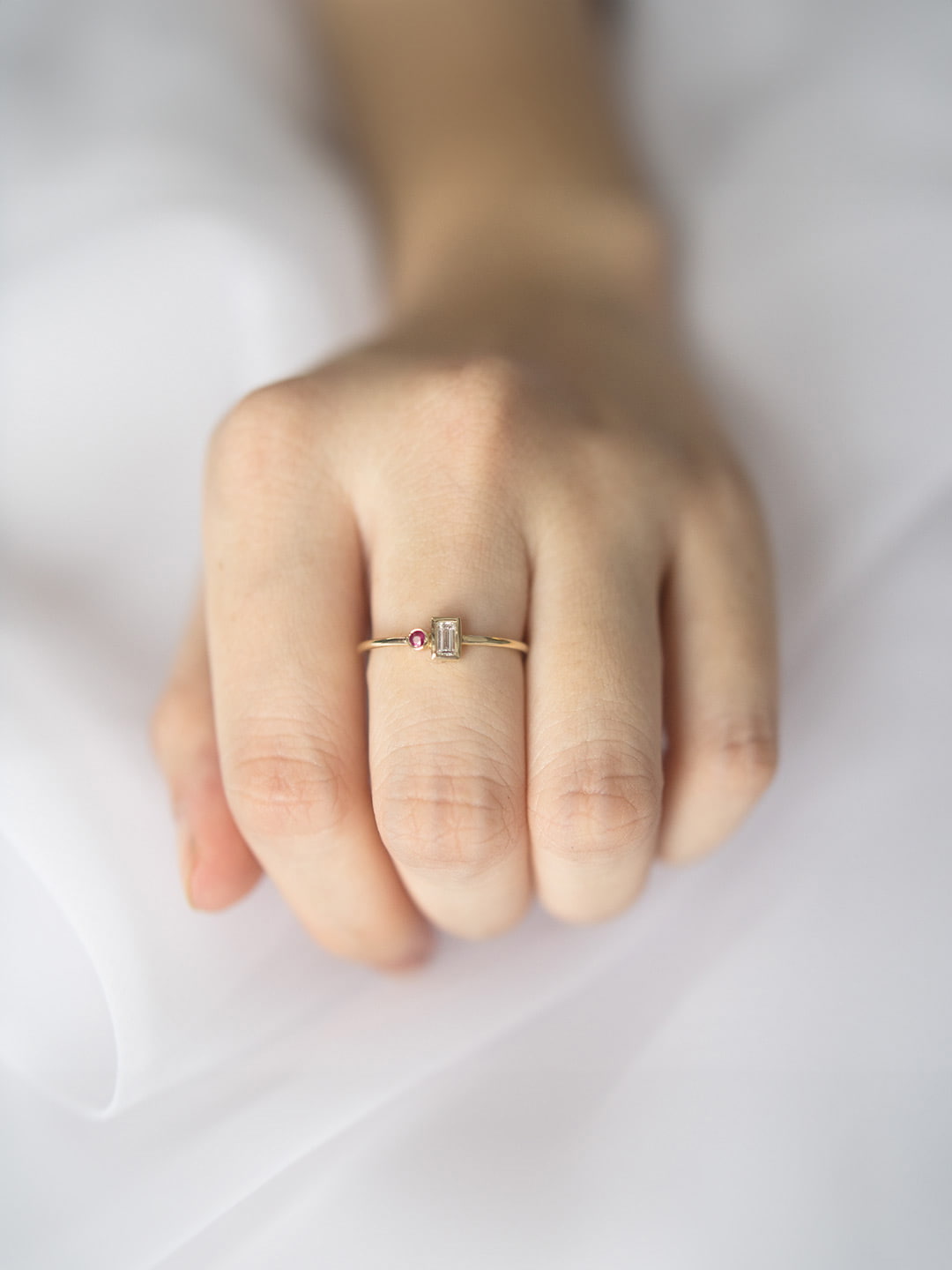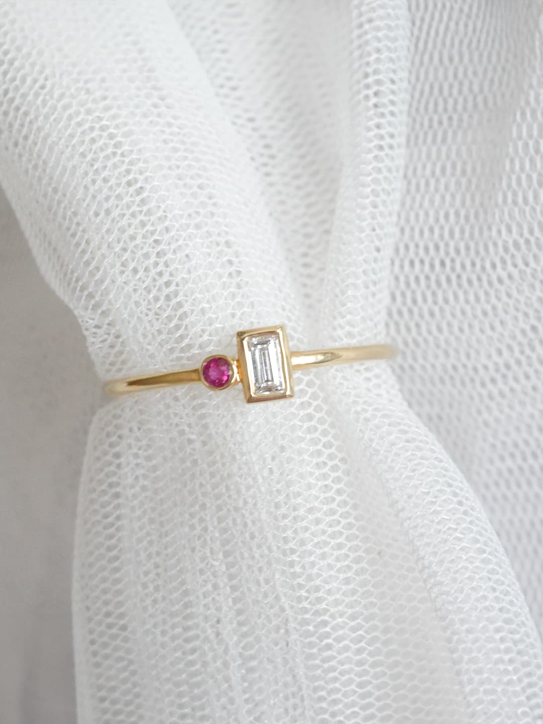 The sweet scent of roses. The Rose Water Baguette Ring is a unique and stunning piece that you will love to have in your collection. It features a bright white baguette diamond next to a round ruby in a bezel setting - a unique yet gorgeous combination that will adorn your fingers.