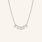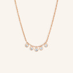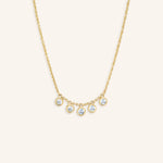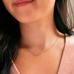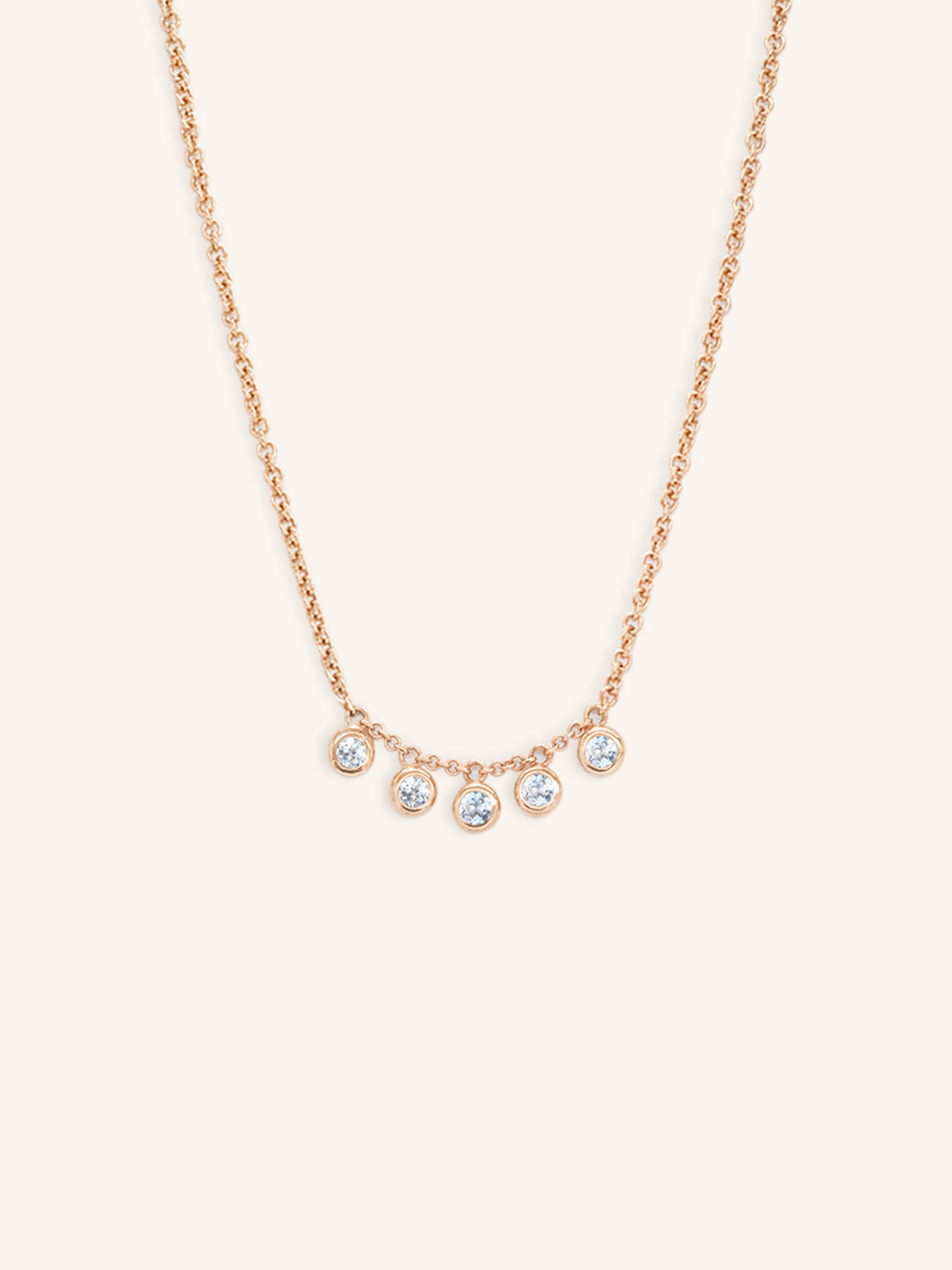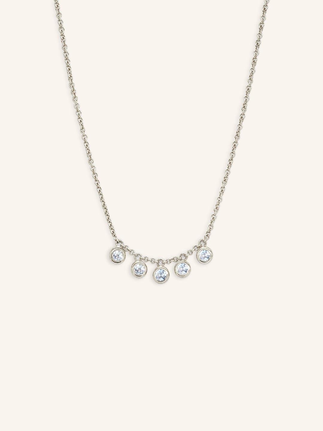 The lightness of love encaptured in the colors of the night. The Wander Longingly necklace features 5 round center stones of your choice. It is set in a bezel and can be comfortably worn anytime without the need to take it off.