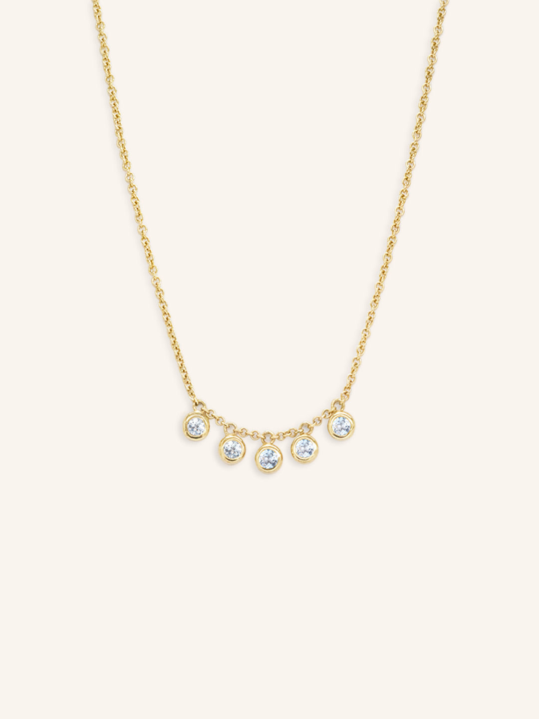 Solid 14k gold five 2.00 mm bezels stationed on a 1.30 mm cable chain necklace with choice of 16" or 18" length (available in yellow, white, or rose gold).