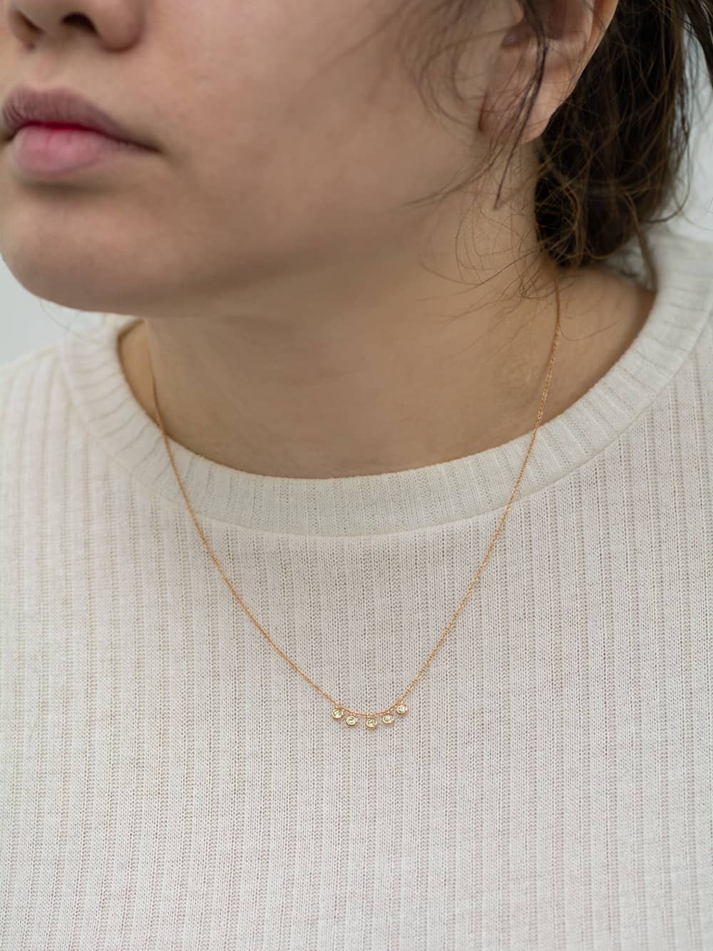 Solid 14k gold five 2.00 mm bezels stationed on a 1.30 mm cable chain necklace with choice of 16" or 18" length (available in yellow, white, or rose gold).
