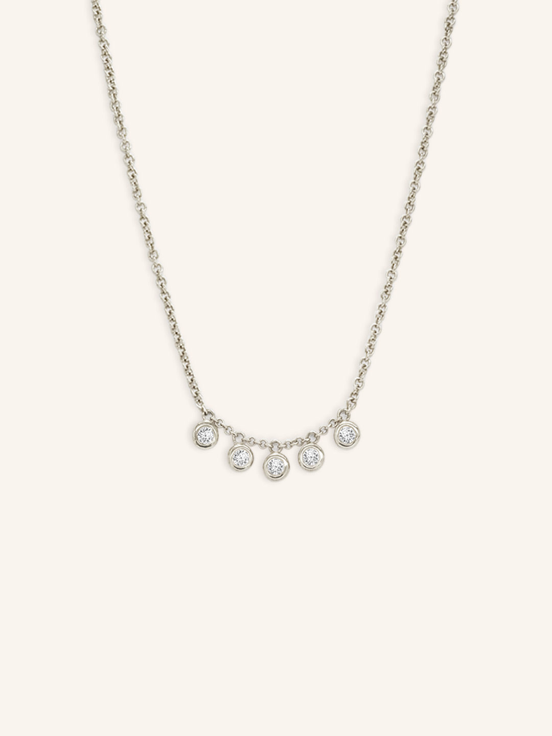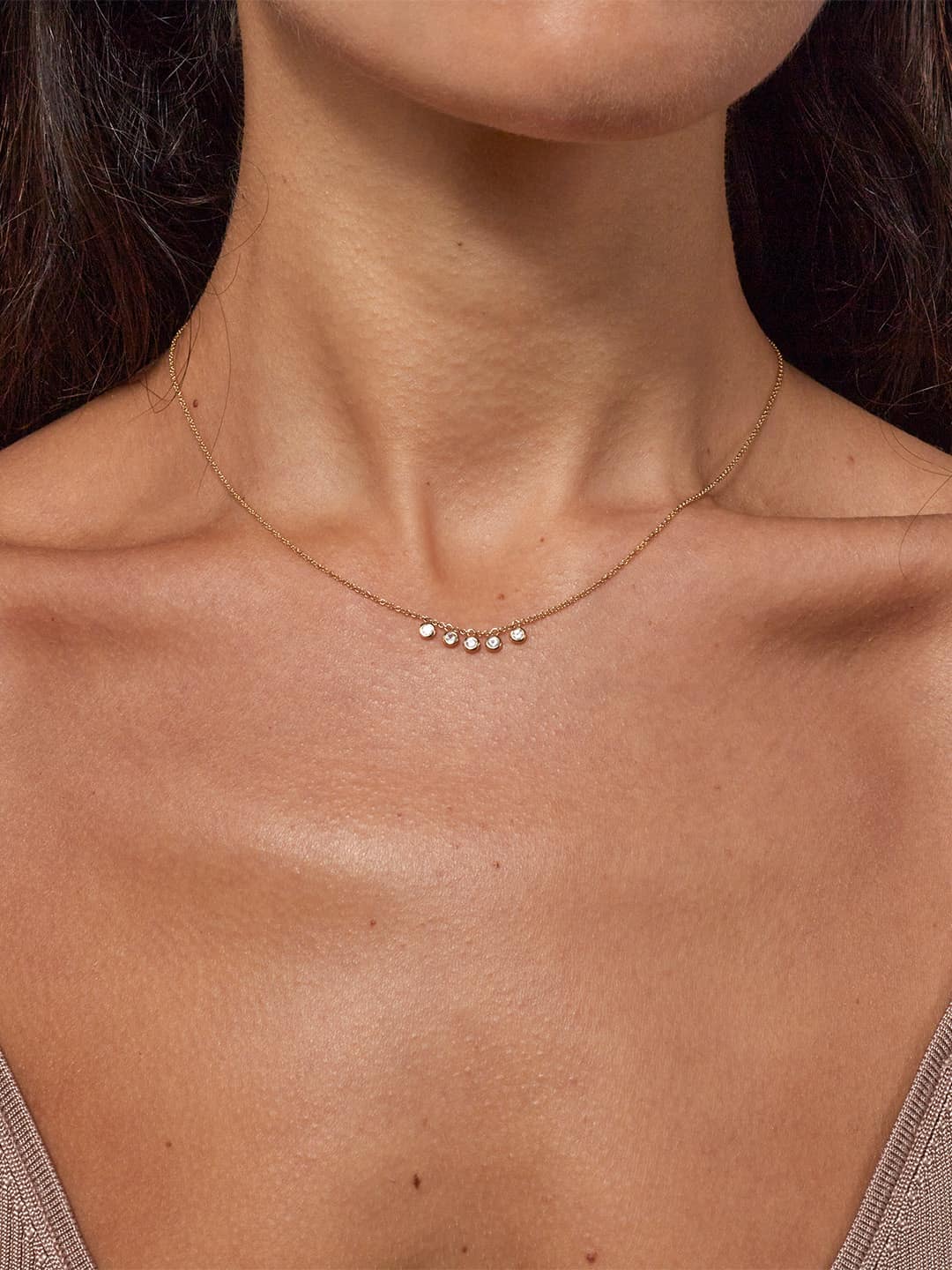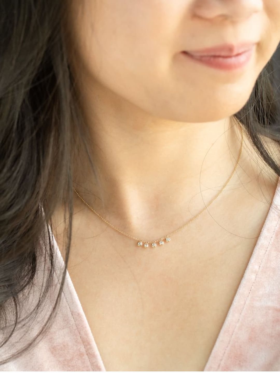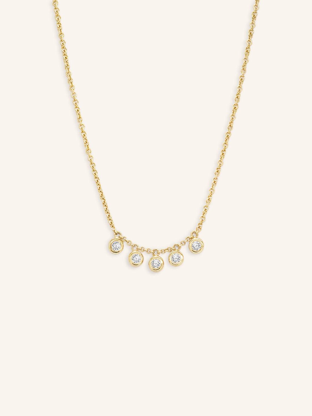 Solid 14k gold five 2.00 mm bezels stationed on a 1.30 mm cable chain necklace with choice of 16" or 18" length (available in yellow, white, or rose gold).