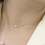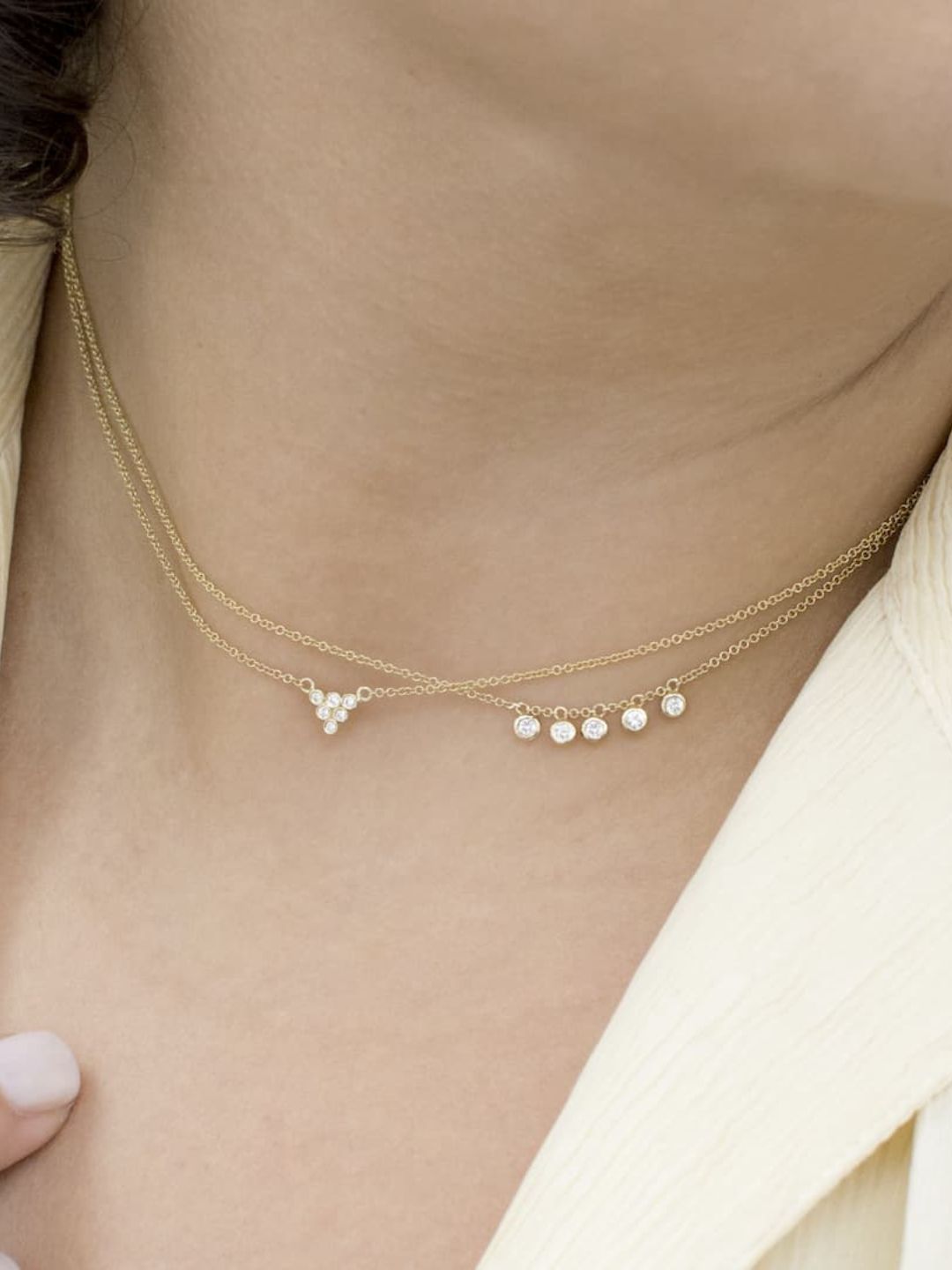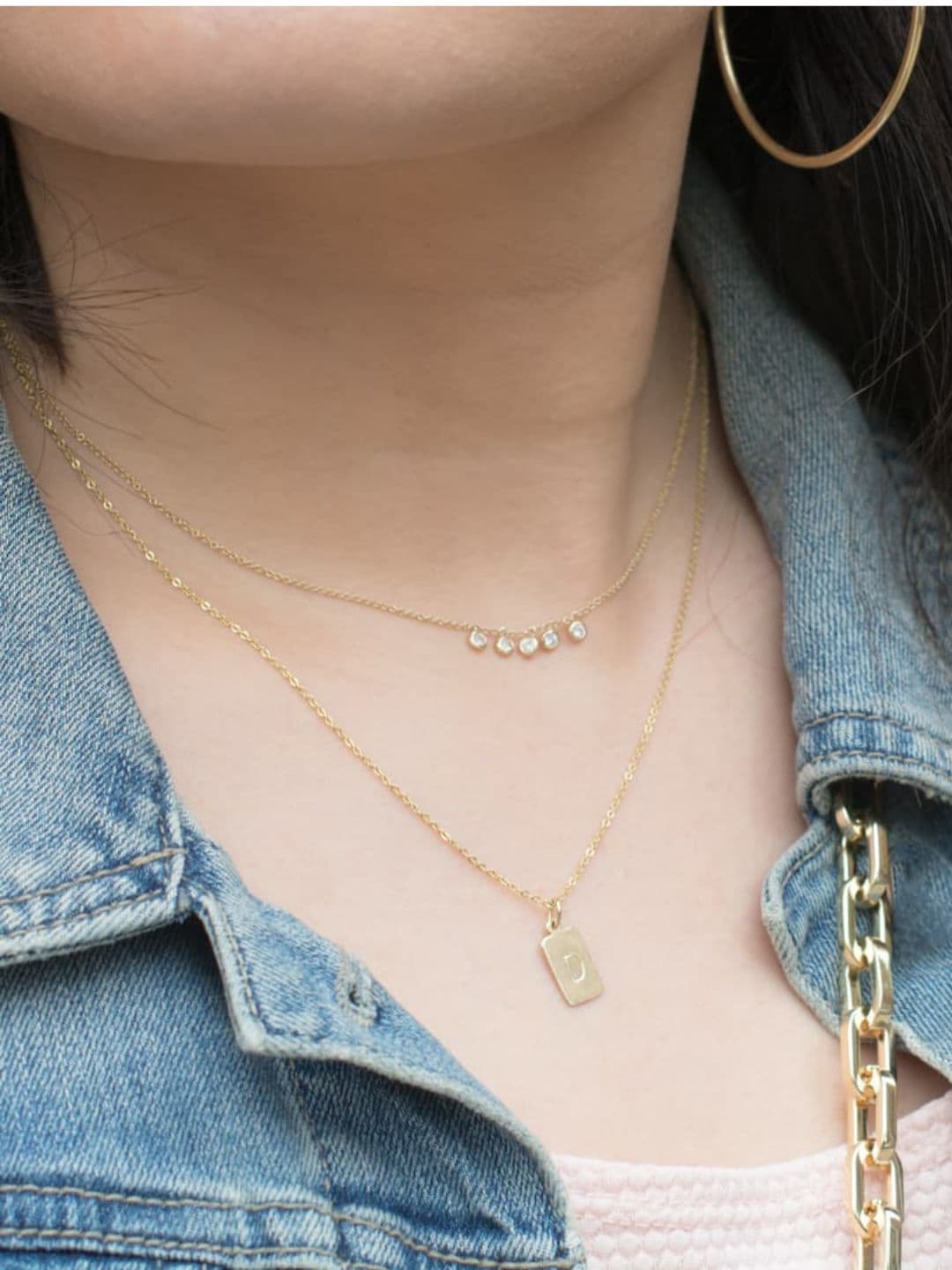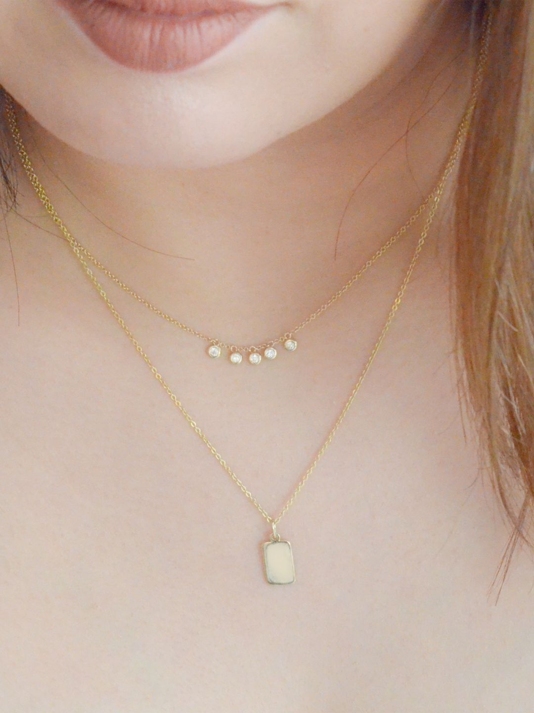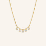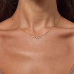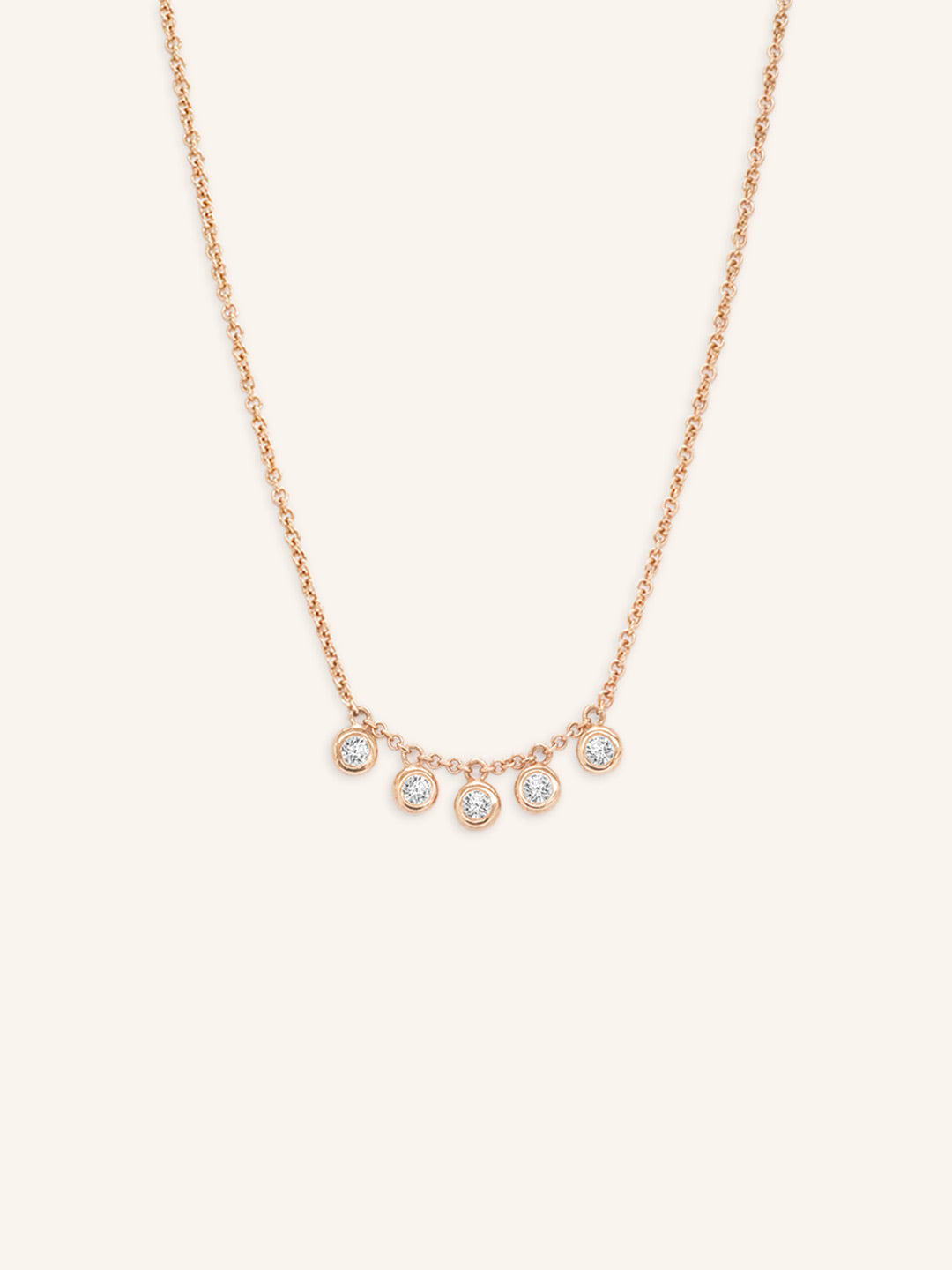 Solid 14k gold five 2.00 mm bezels stationed on a 1.30 mm cable chain necklace with choice of 16" or 18" length (available in yellow, white, or rose gold).