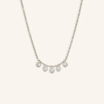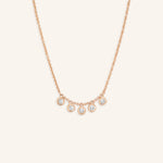 The lightness of love encaptured in the colors of the night. The Wander Longingly necklace features 5 round center stones of your choice. It is set in a bezel and can be comfortably worn anytime without the need to take it off.