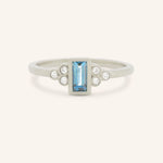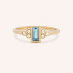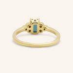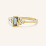 The Abigail Ring features a richly colored gemstone framed by a trio of petite diamonds on each side. Delicate yet vibrant, its timeless silhouette makes it perfect for stacking or wearing solo as a subtle statement.