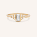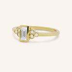 The Abigail Ring features a richly colored gemstone framed by a trio of petite diamonds on each side. Delicate yet vibrant, its timeless silhouette makes it perfect for stacking or wearing solo as a subtle statement.