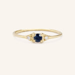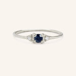 Petite, yet robustly sparkling, this ring features a blue sapphire center stone. A modern take on a classic three stone ring, this piece is timeless in its design but only made better with a beautiful accent diamond on each side. Beautiful enough to be worn solo as a subtle accent or stacked with other rings.