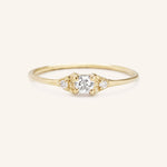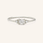 Petite, yet robustly sparkling, this ring features a diamond center stone. A modern take on a classic three stone ring, this piece is timeless in its design but only made better with a beautiful accent diamond on each side. Beautiful enough to be worn solo as a subtle accent or stacked with other rings.