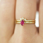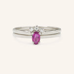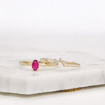 This ensemble features our Poppy Ruby Solitaire ring together with a petite three diamond ring to create a tiny crown above the oval center. A beautiful pairing with a stark contrast of the deep red against the bright white diamonds.