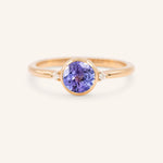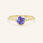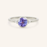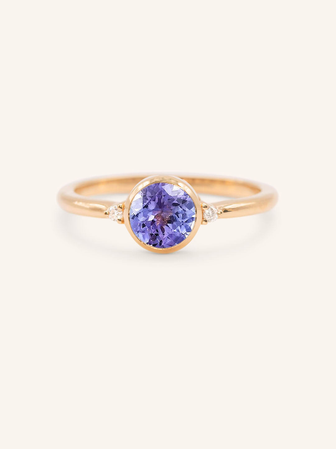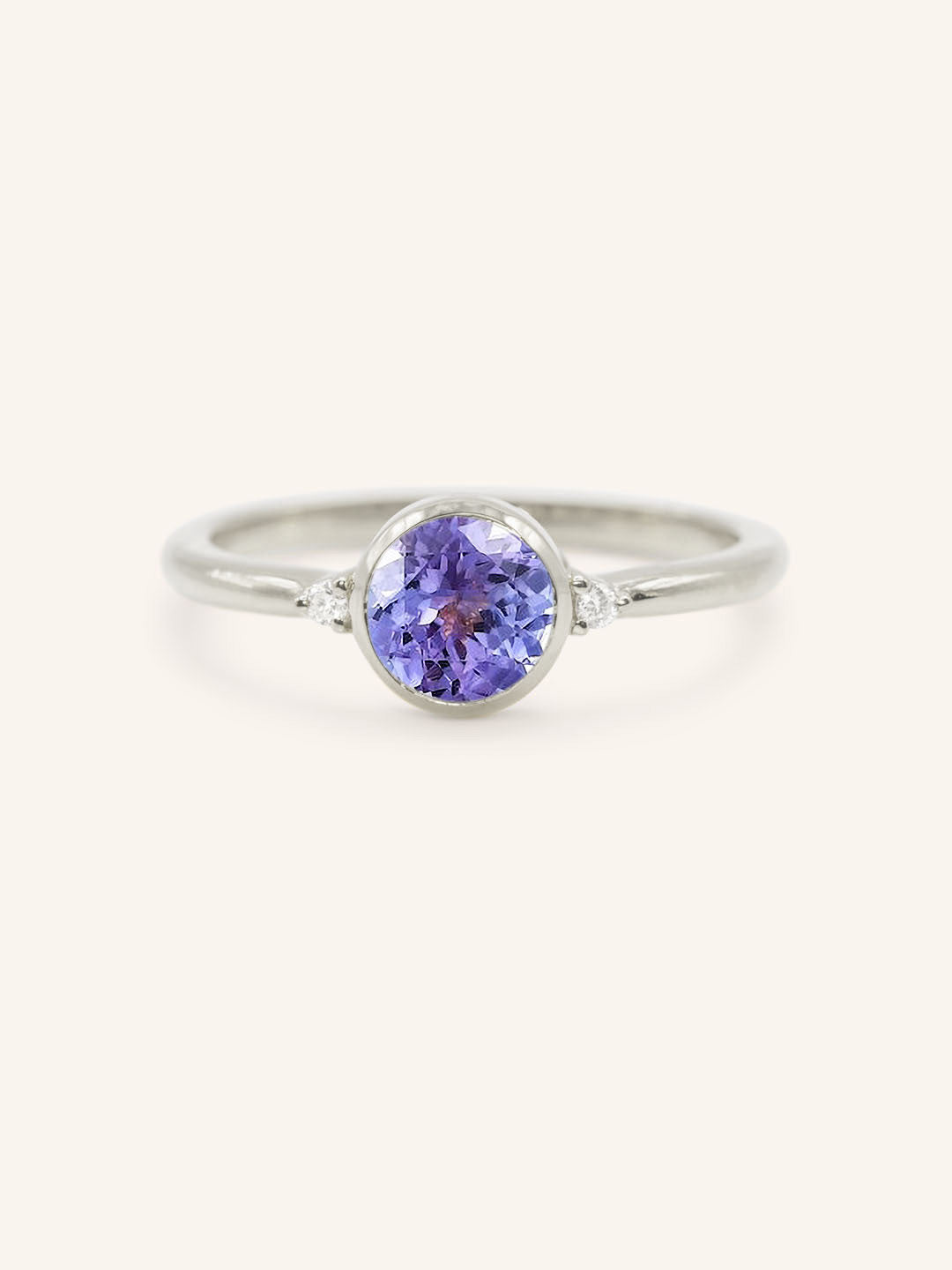The Templa Ring is a refined three-stone design, perfect for celebrating meaningful moments. A bezel-set center stone, representing a birthstone, is flanked by two dazzling diamonds, creating a balanced and elegant look. This timeless piece is both personal and sophisticated, making it a perfect choice for everyday wear or special occasions.