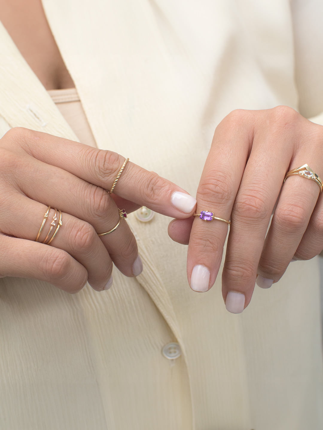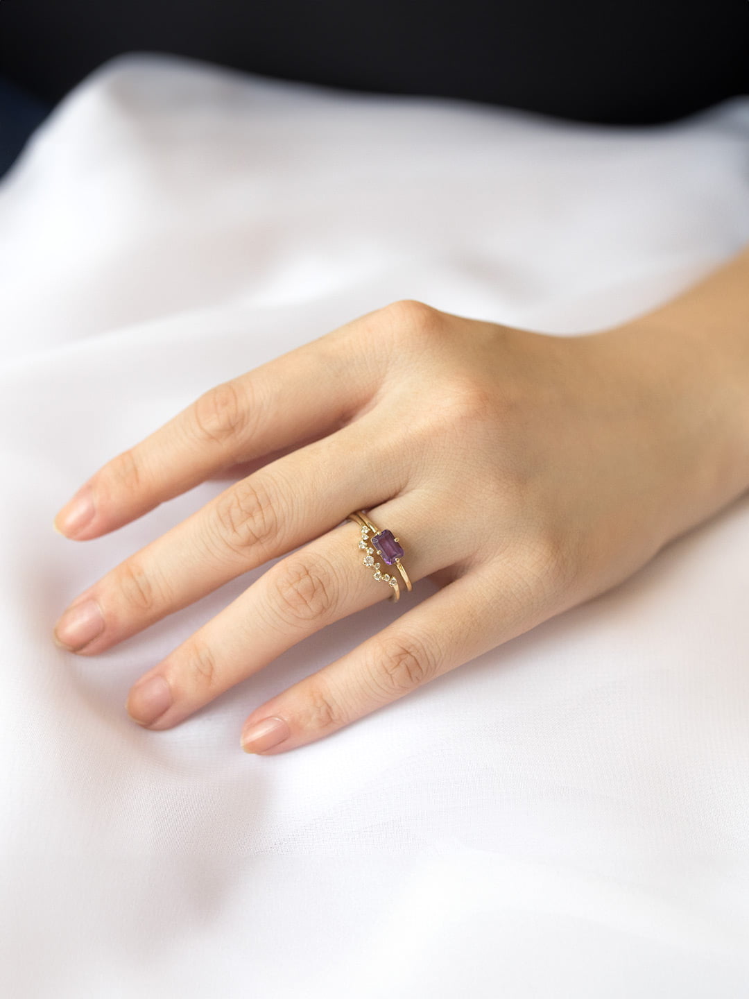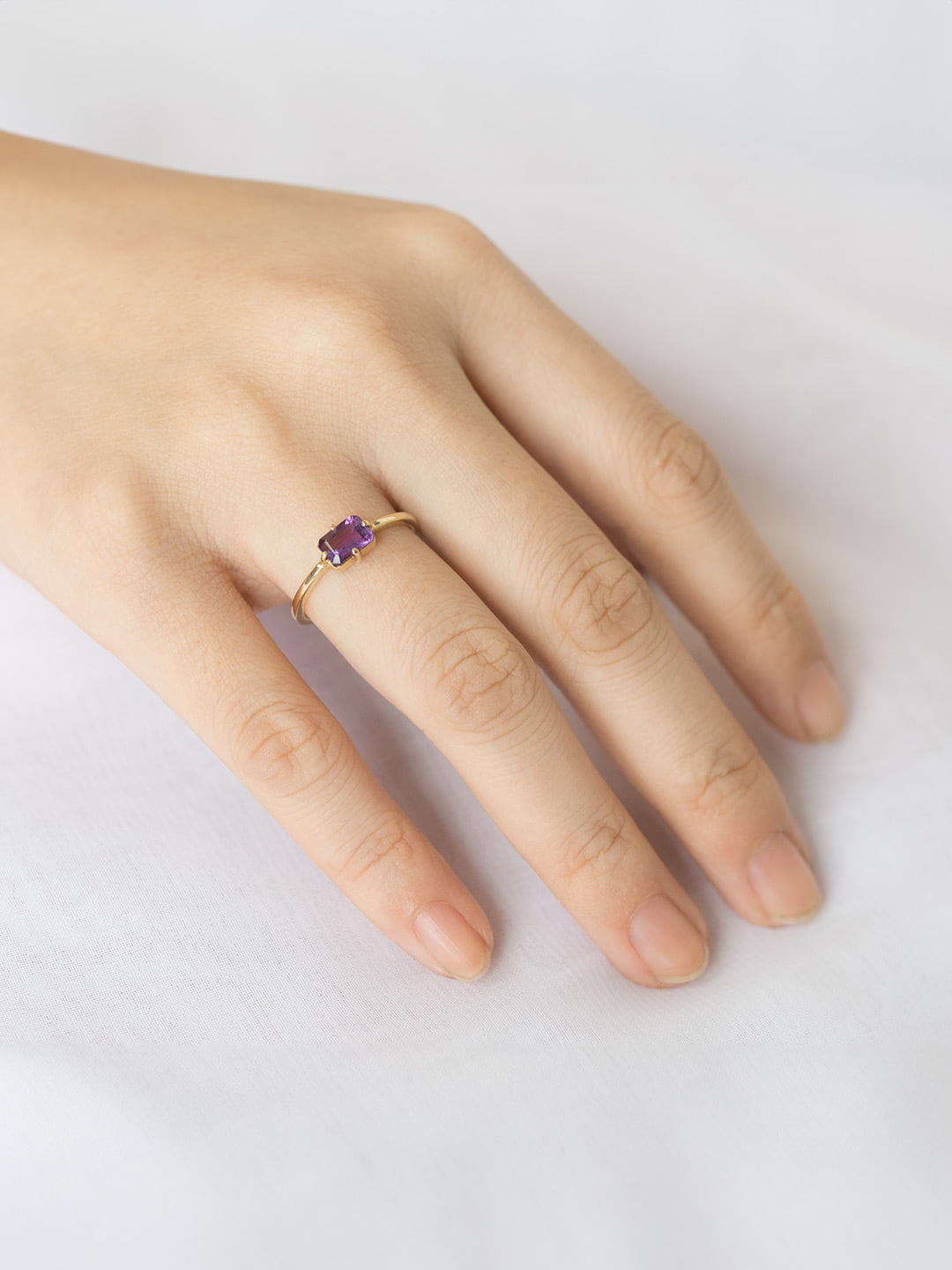 The Lady's Mantle Emerald Cut Ring showcases a rich, vibrant center stone with elegant step-cut facets that catch the light beautifully. Designed to sit low on the finger, its minimalist silhouette offers both comfort and sophistication. A refined piece perfect for everyday wear or adding a touch of color to special occasions.