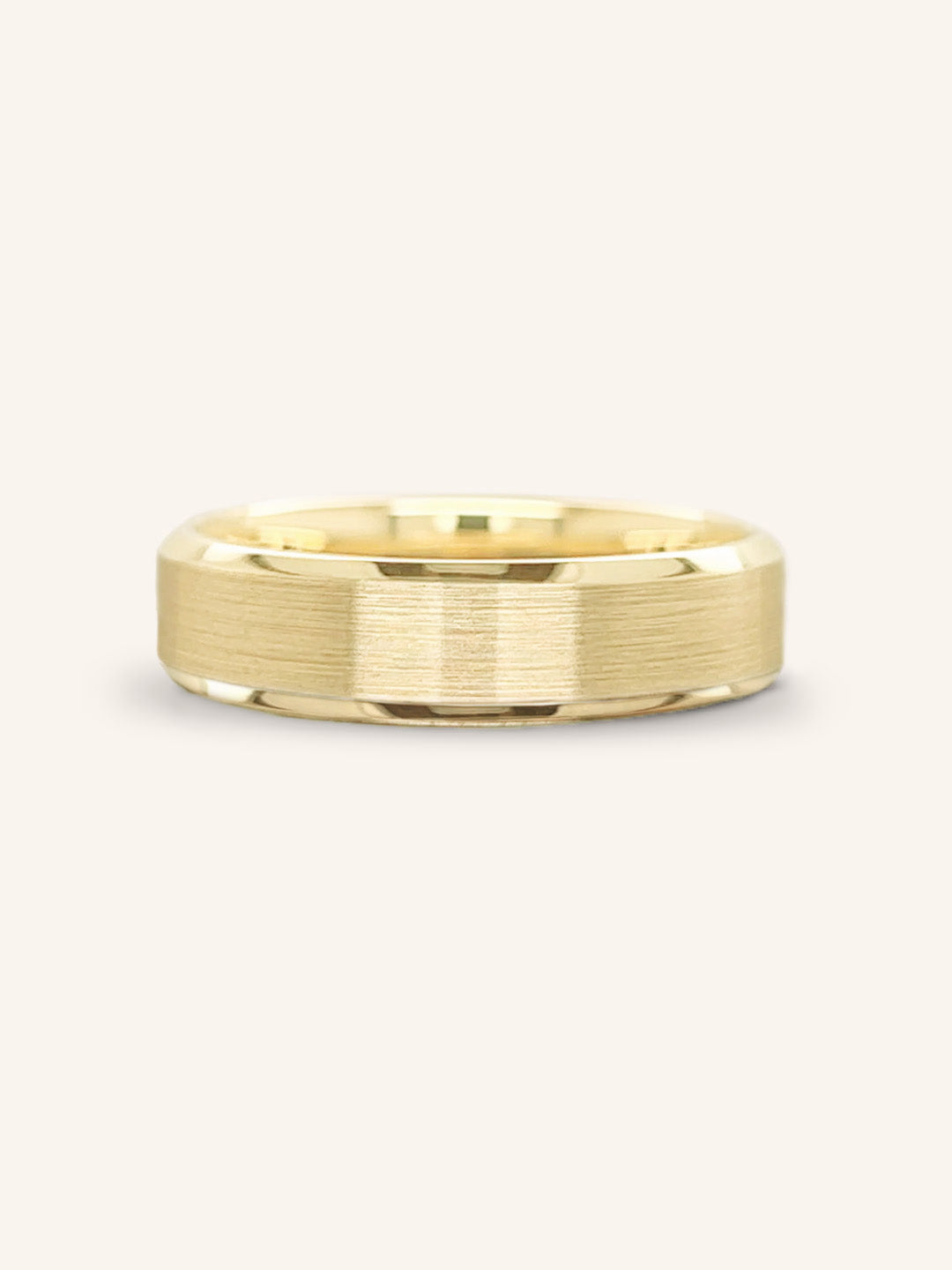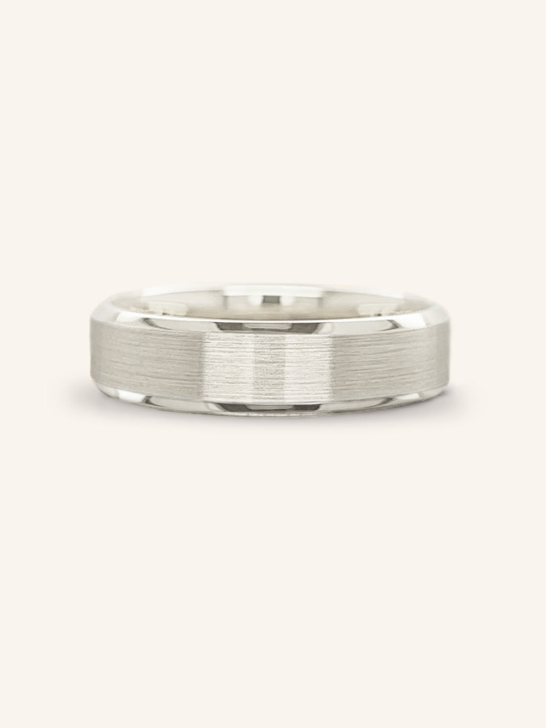 This 5MM wedding band combines classic form with modern refinement. Featuring a satin finish center framed by sleek beveled edges, the design delivers a subtle contrast in texture and shine. Comfortable and enduring, it’s a versatile choice for those who value understated elegance in a timeless silhouette.