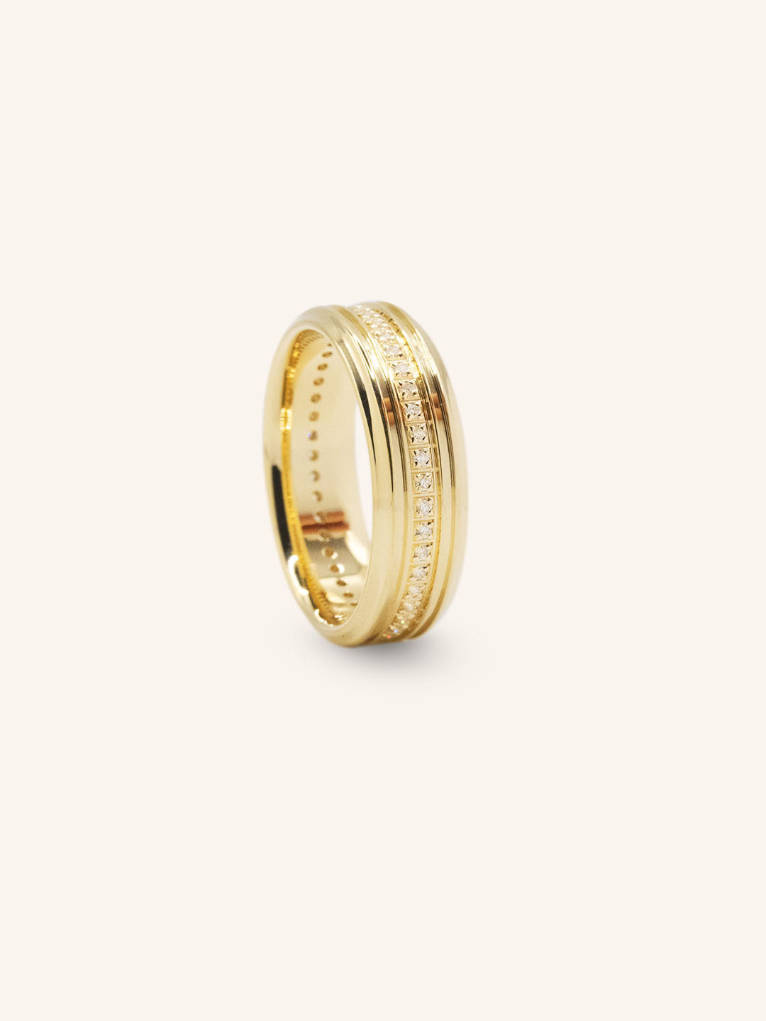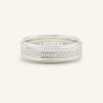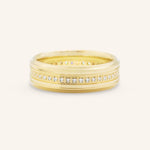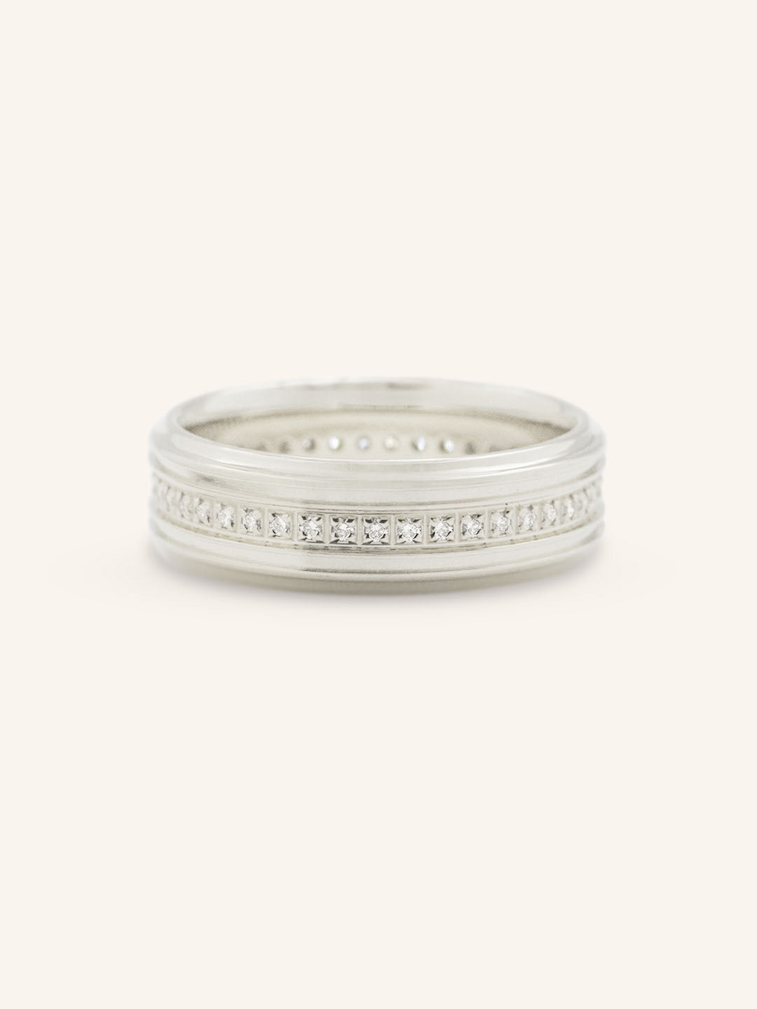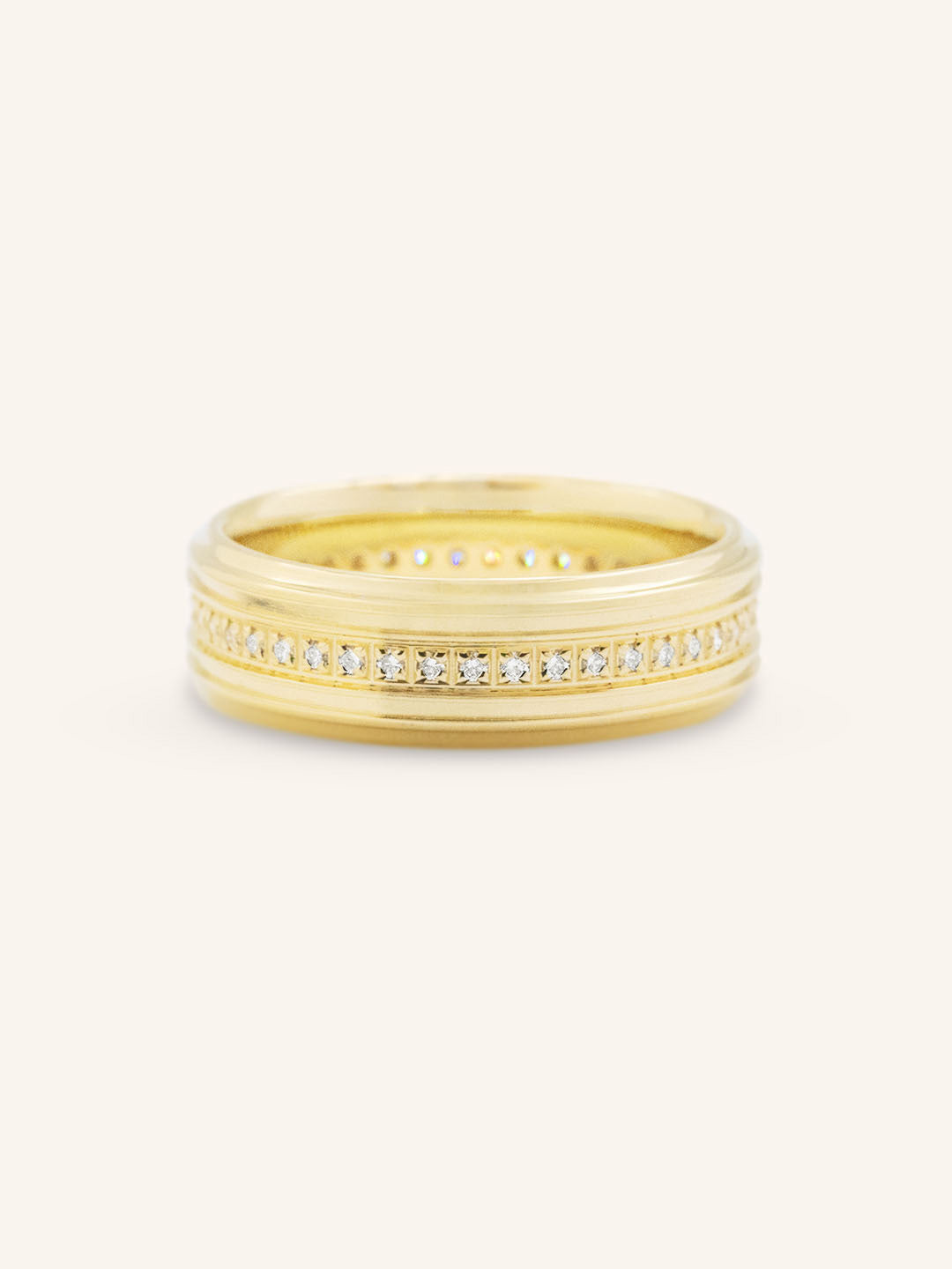 The Diamond Accented Grooved Eternity Wedding Band showcases a continuous line of subtle diamonds set within a sleek groove, symbolizing an unbroken bond. Crafted in durable 14k gold, this band offers a harmonious blend of timeless elegance and modern style, with a refined sparkle perfect for any occasion. This eternity band makes a strong, sophisticated statement, ideal for those who value both tradition and unique detail.