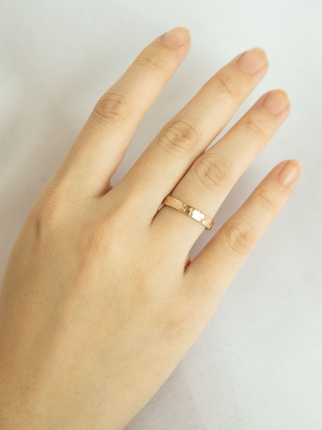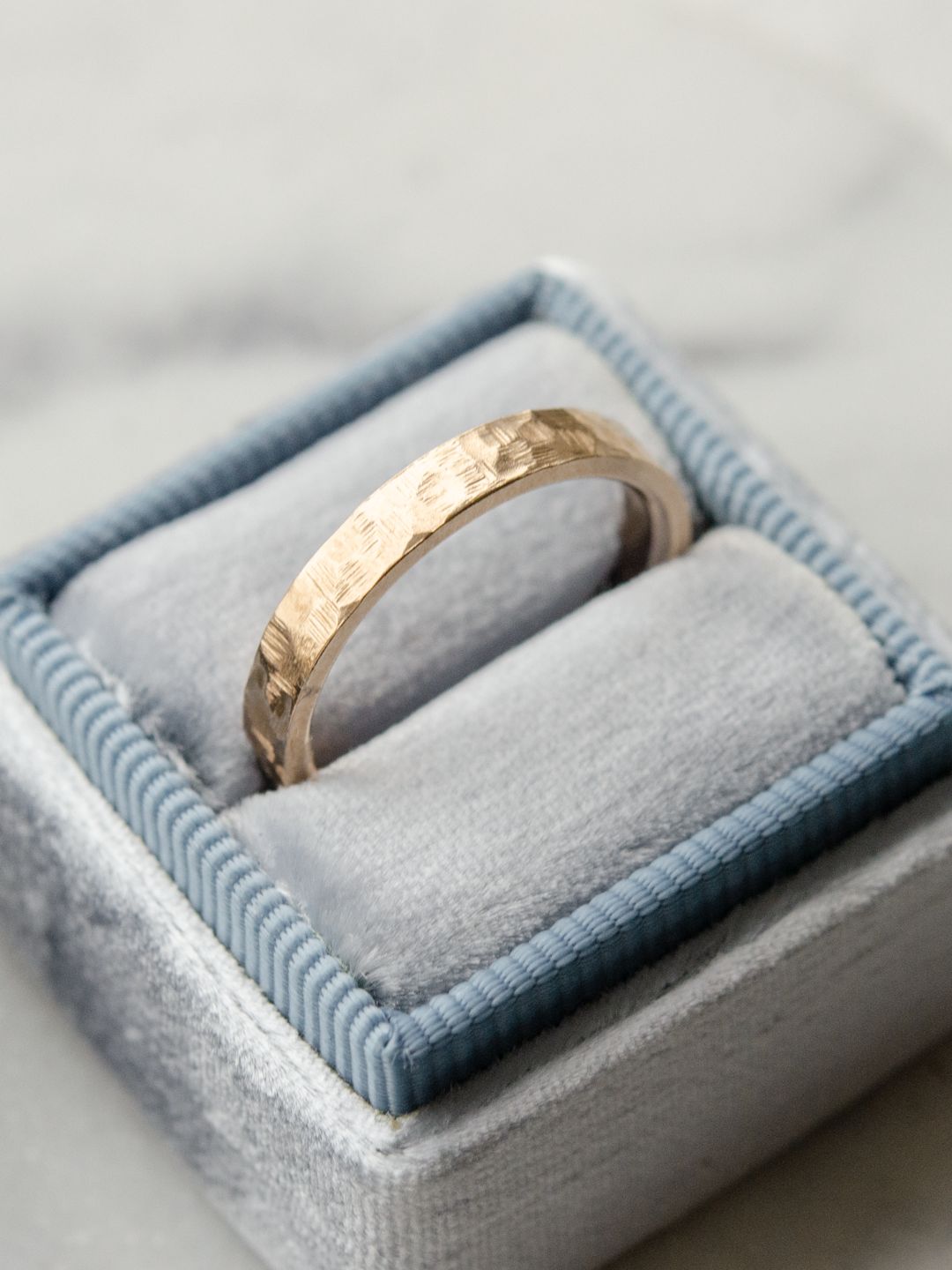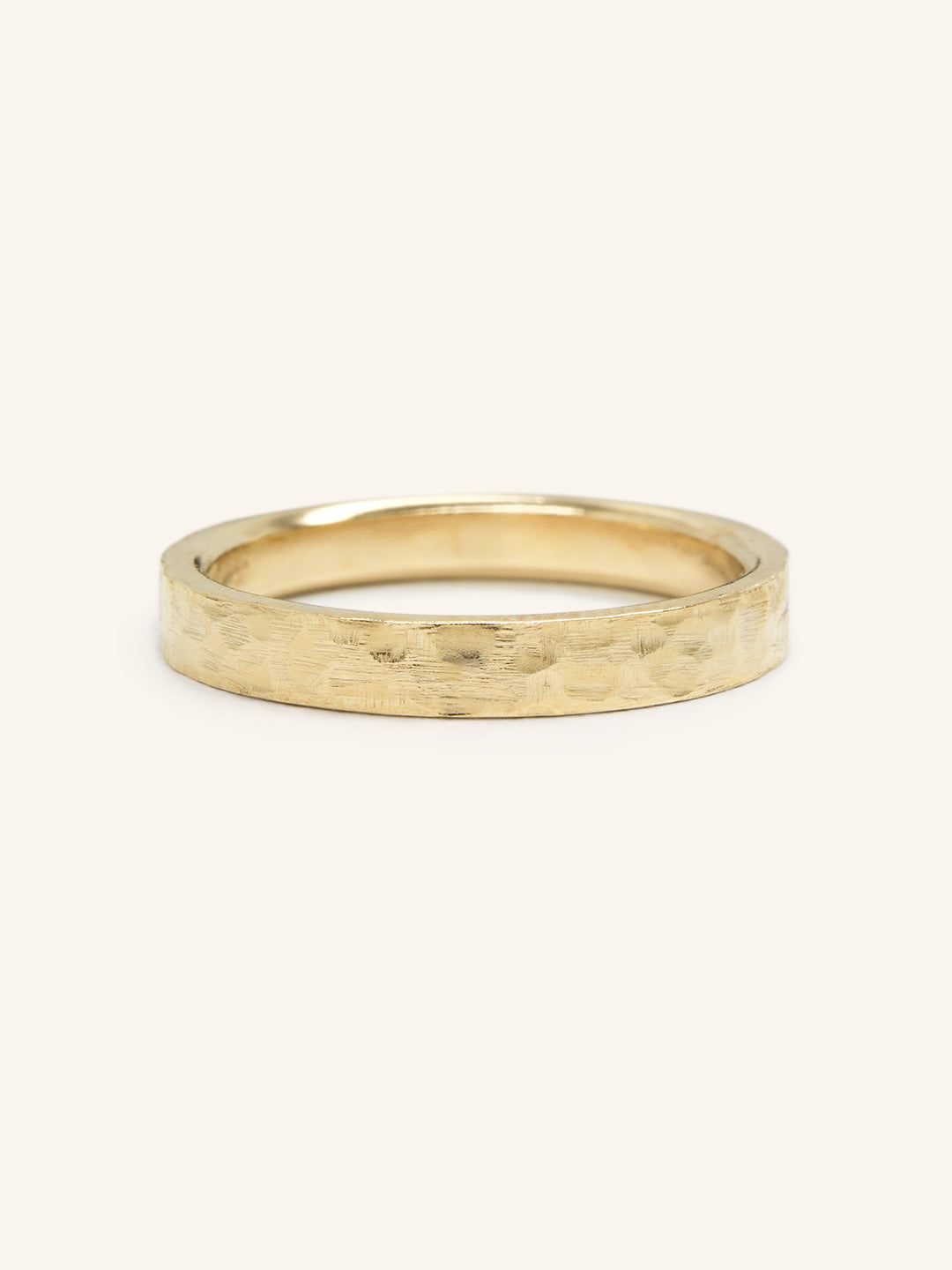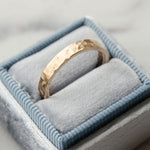 This 14k gold wedding ring is uniquely hammered by hand, giving it a textured finish and character. Hand hammering creates organic facets that catch the light in such a beautiful way. These rings are made comfort fit, which means the inside is contoured for a more comfortable fit.