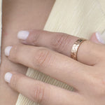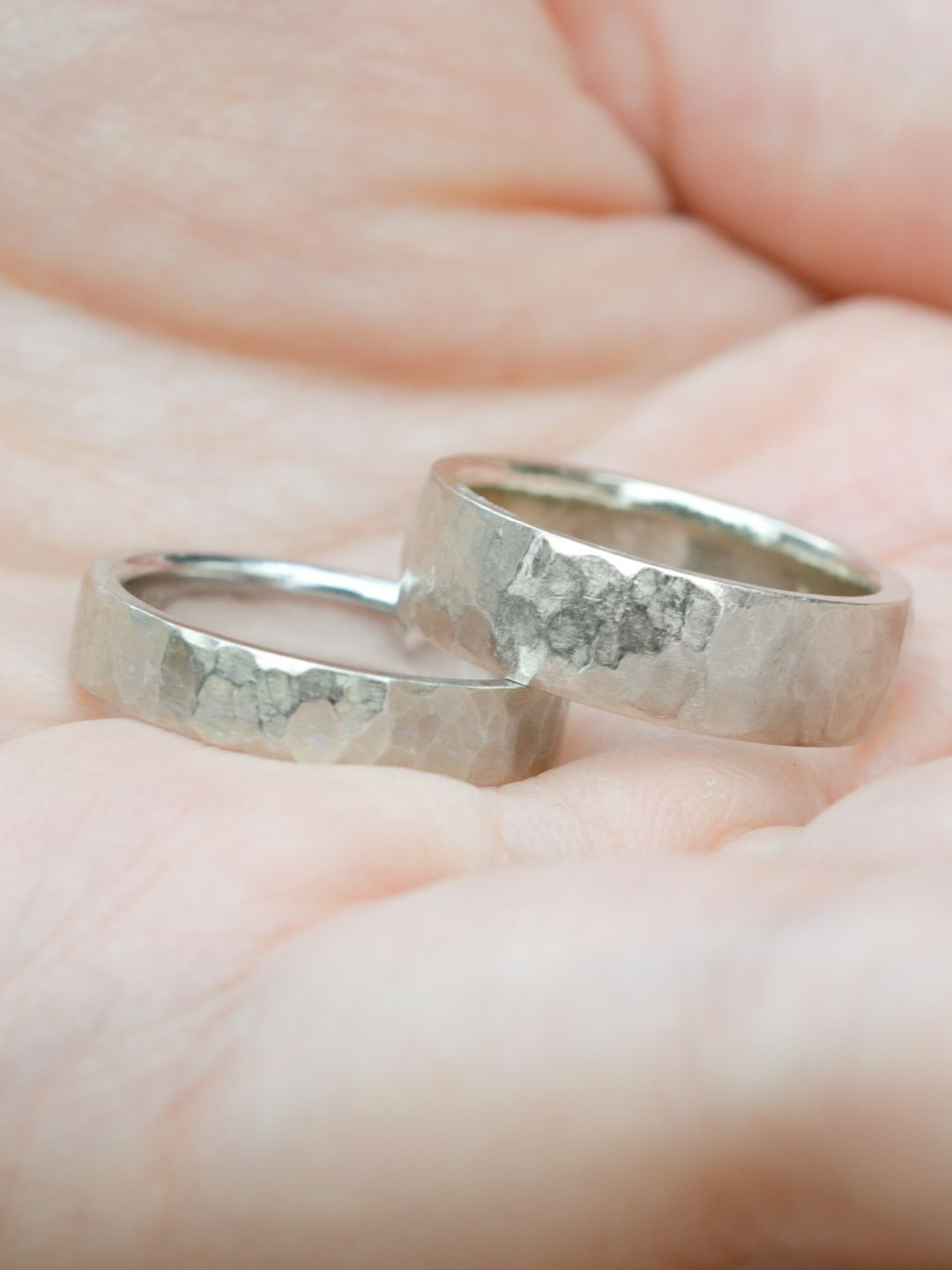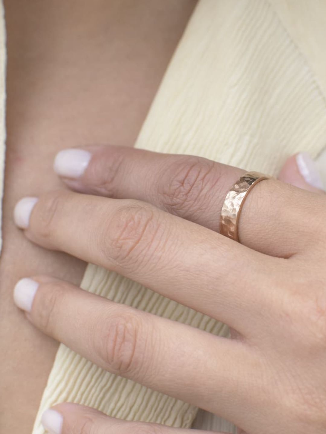 This 14k gold wedding ring is uniquely hammered by hand, giving it a textured finish and character. Hand hammering creates organic facets that catch the light in such a beautiful way. These rings are made comfort fit, which means the inside is contoured for a more comfortable fit.