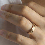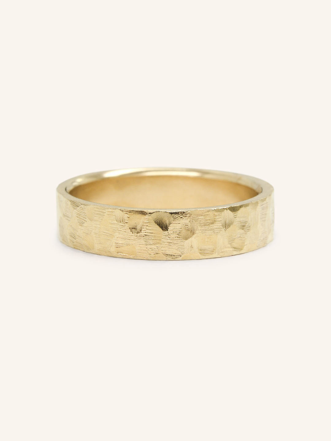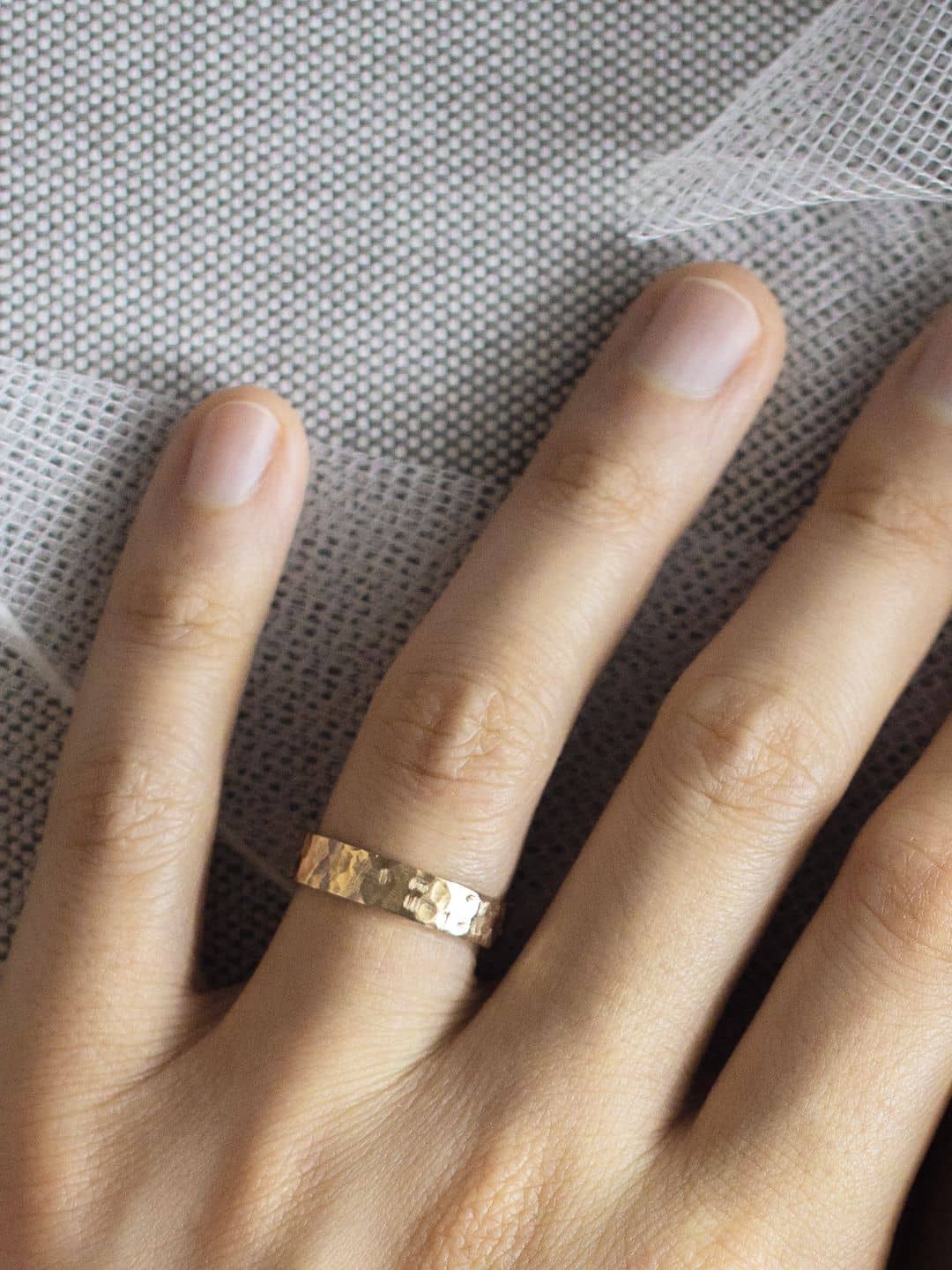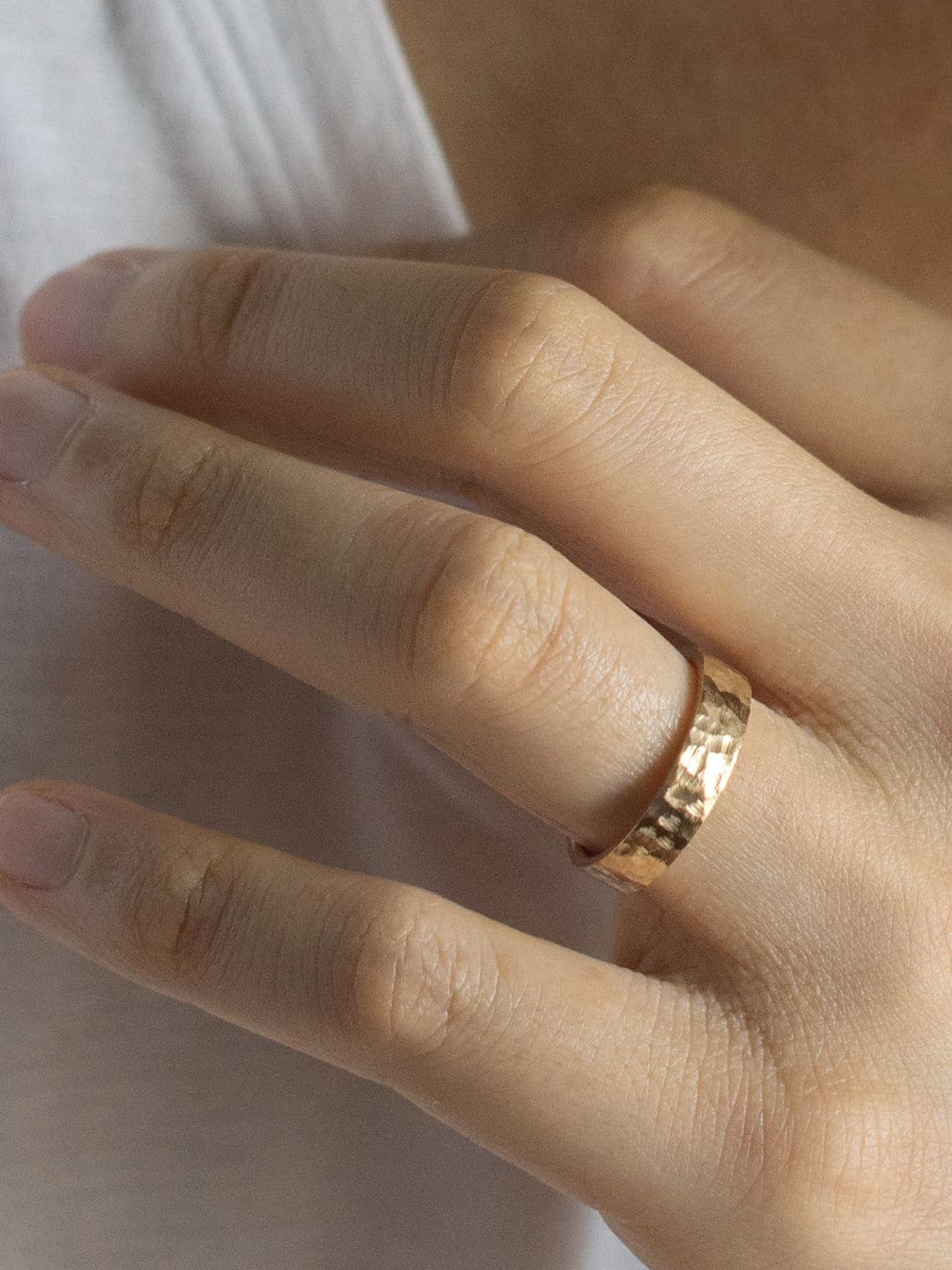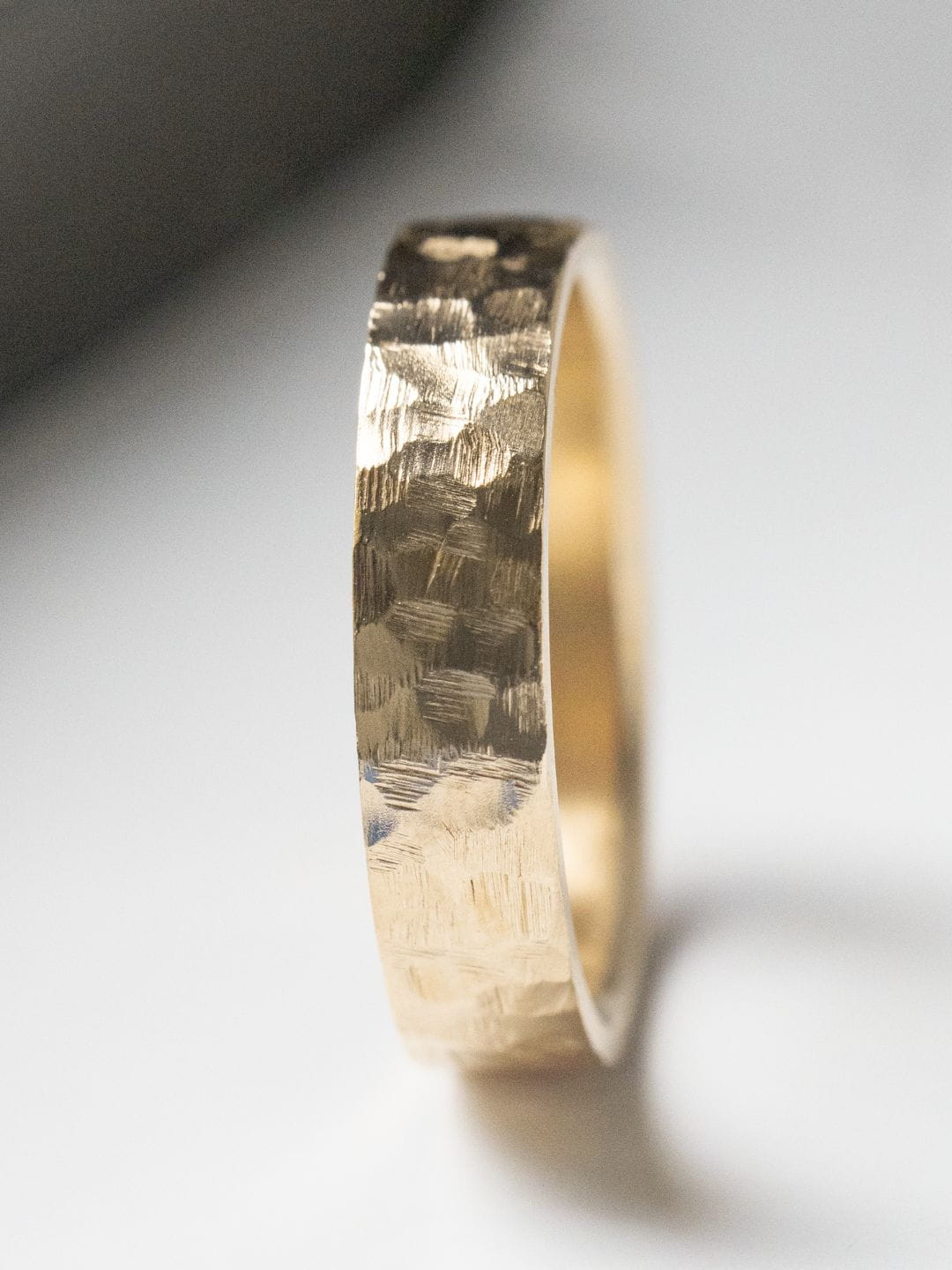 This 14k gold wedding ring is uniquely hammered by hand, giving it a textured finish and character. Hand hammering creates organic facets that catch the light in such a beautiful way. These rings are made comfort fit, which means the inside is contoured for a more comfortable fit.