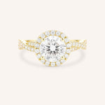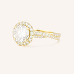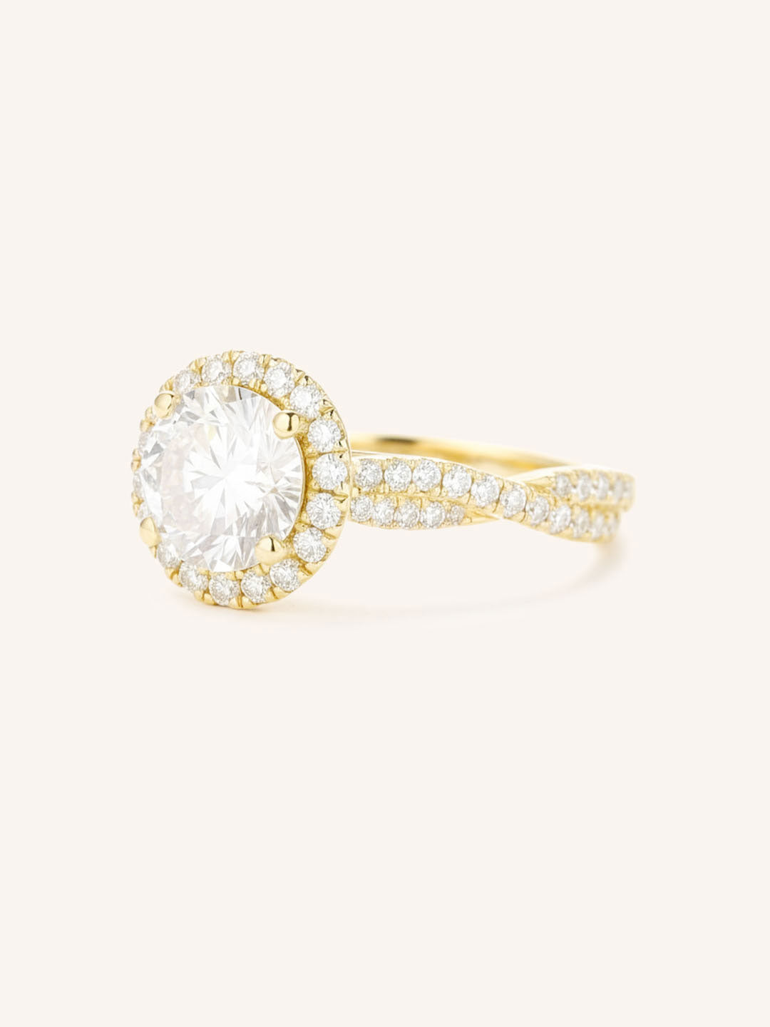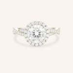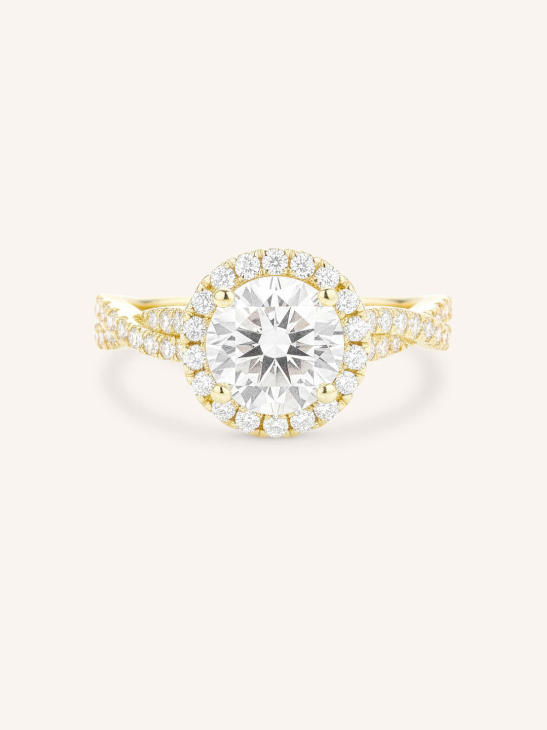 Celebrate your love in style with our beautifully crafted halo diamond engagement ring. Featuring a unique twisted band design, this ring is a true standout. The halo setting enhances the diamond's brilliance, while the modern twist on the band adds a touch of elegance. It's the perfect choice for anyone looking for a one-of-a-kind ring that symbolizes their commitment and love. With its timeless design and modern touch, it's a ring that will be cherished for a lifetime.