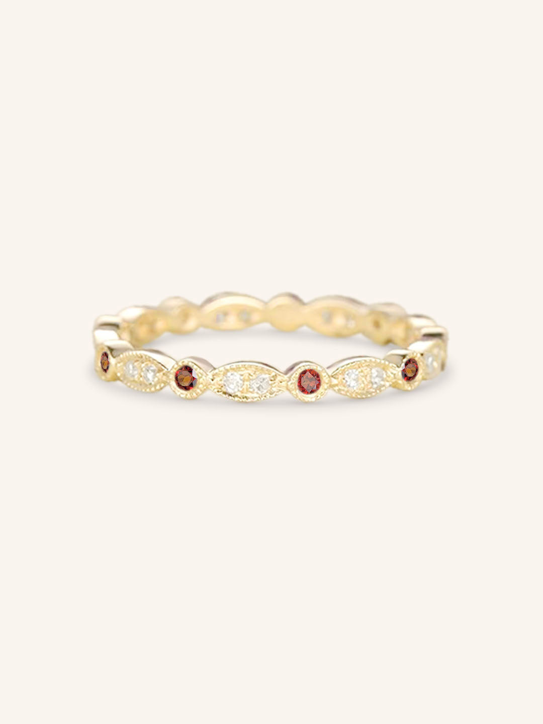 A delicate eternity band that blends soft color with timeless sparkle. This ring features alternating round birthstones and white diamonds set in a continuous pattern, each accented with fine milgrain detailing for a vintage-inspired finish. Crafted in solid 14k gold, it’s perfect for stacking, wearing as a wedding band, or marking a special occasion with meaning and elegance. Designed to be worn every day and cherished for a lifetime, this piece adds a graceful touch of light blue and brilliance to any jewelry collection.